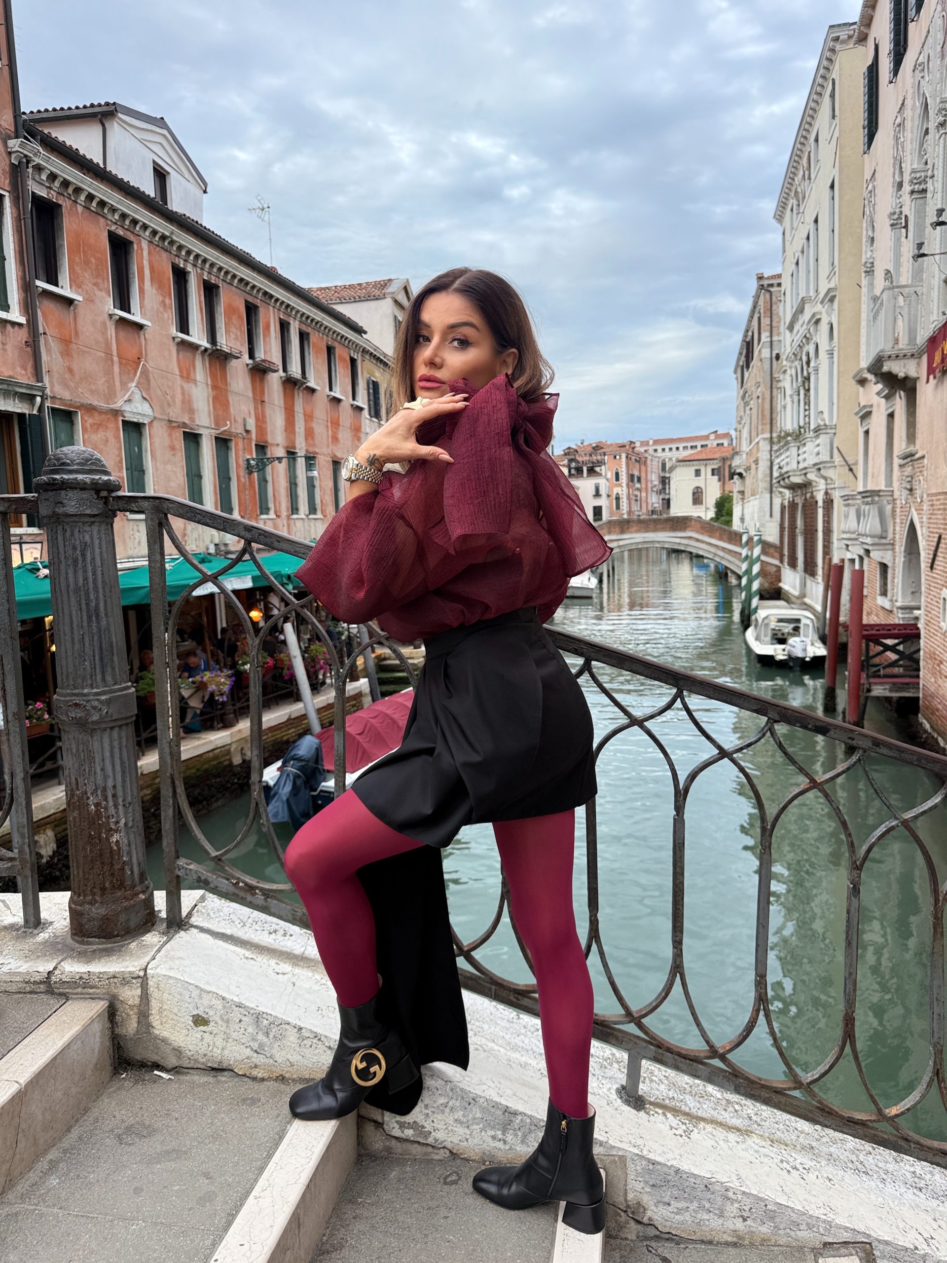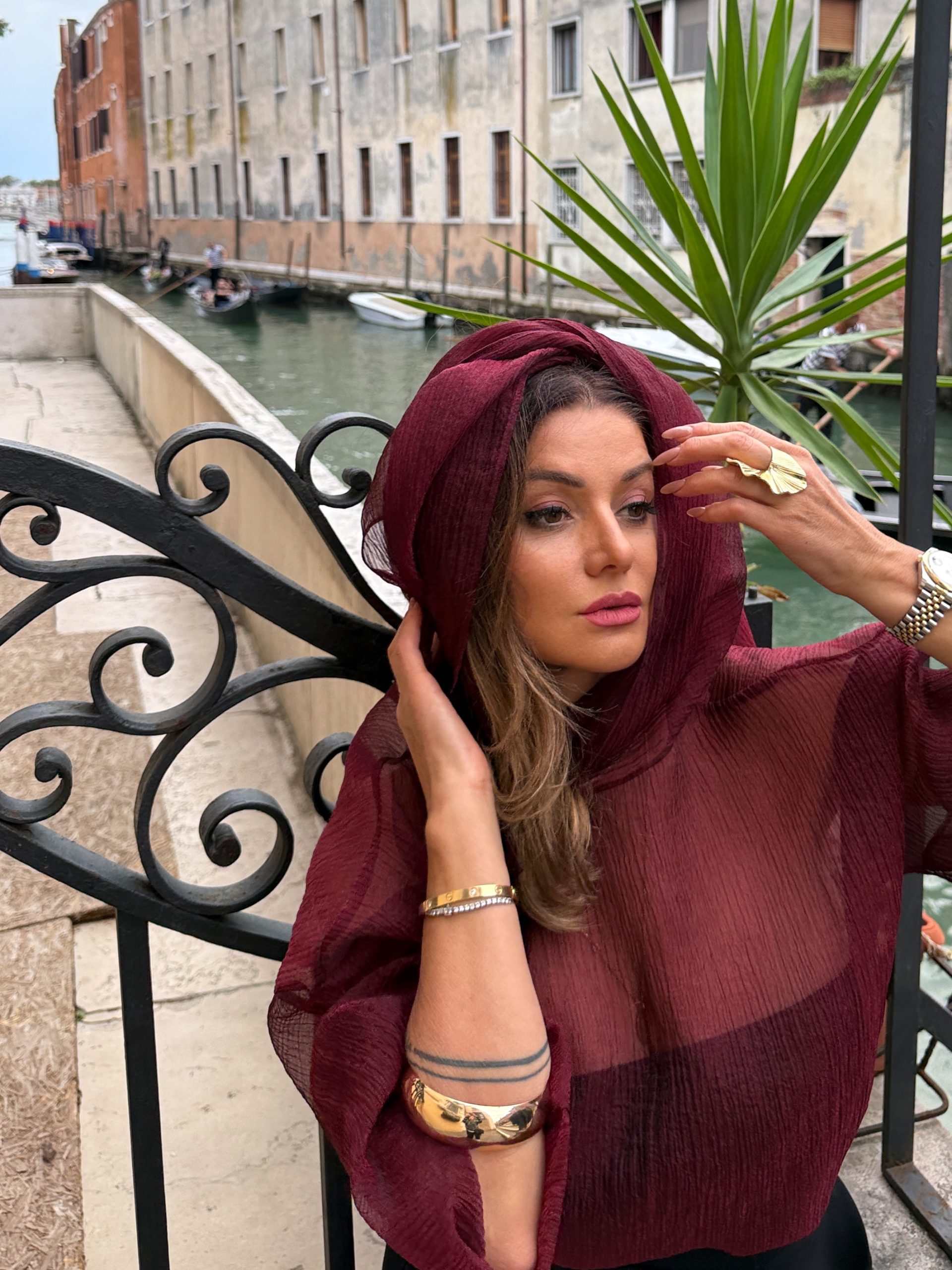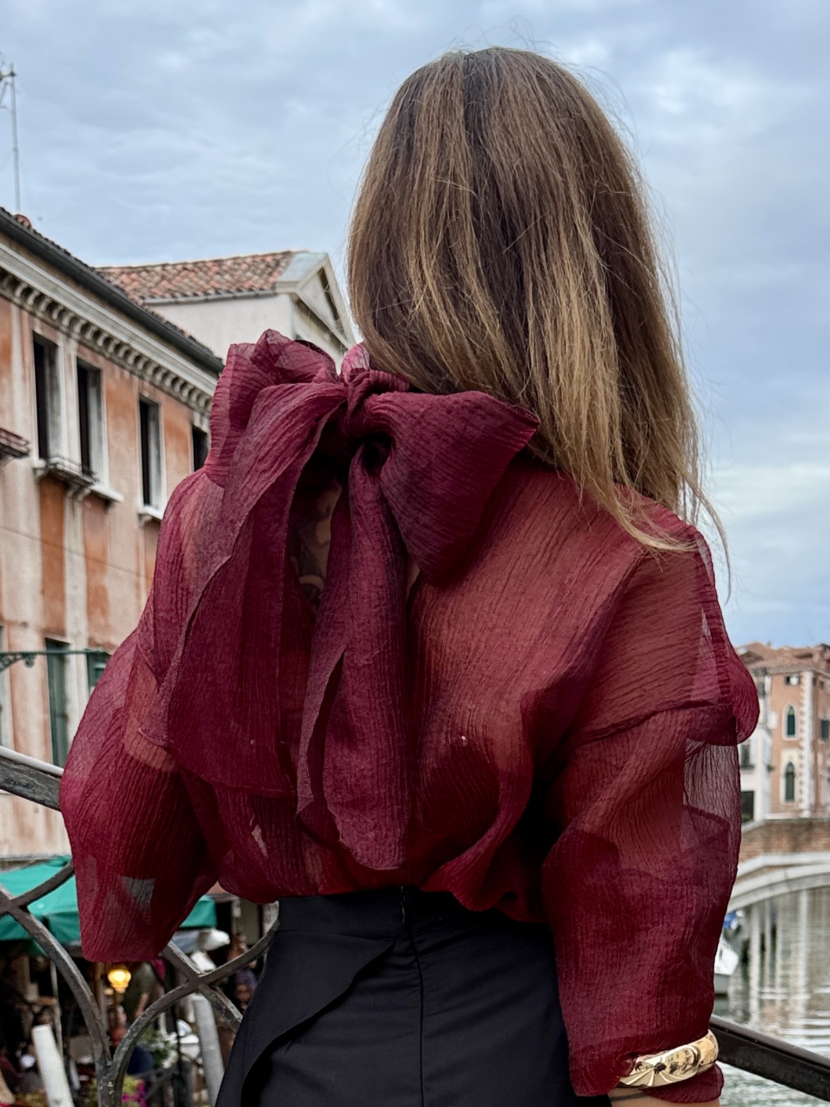 Блузата е изключително елегантна и женствена, изработена от ефирна, прозрачна материя- тафта в наситен бордо цвят. Има романтична, обемна панделка около врата, която придава изискан и шикозен акцент. Ръкавите са дълги и леко буфан, създавайки усещане за лекота и обем. Материята има деликатна текстура, която красиво улавя светлината, а прозрачността ѝ загатва силуета по фин и стилен начин.