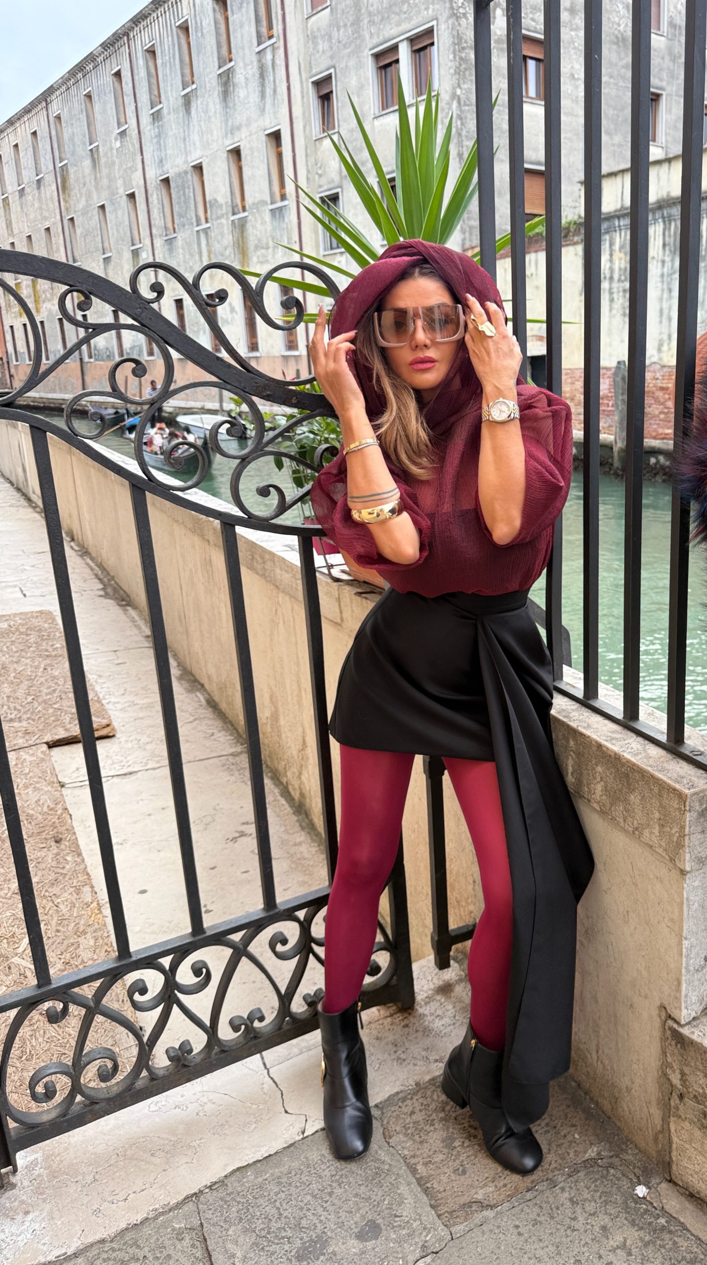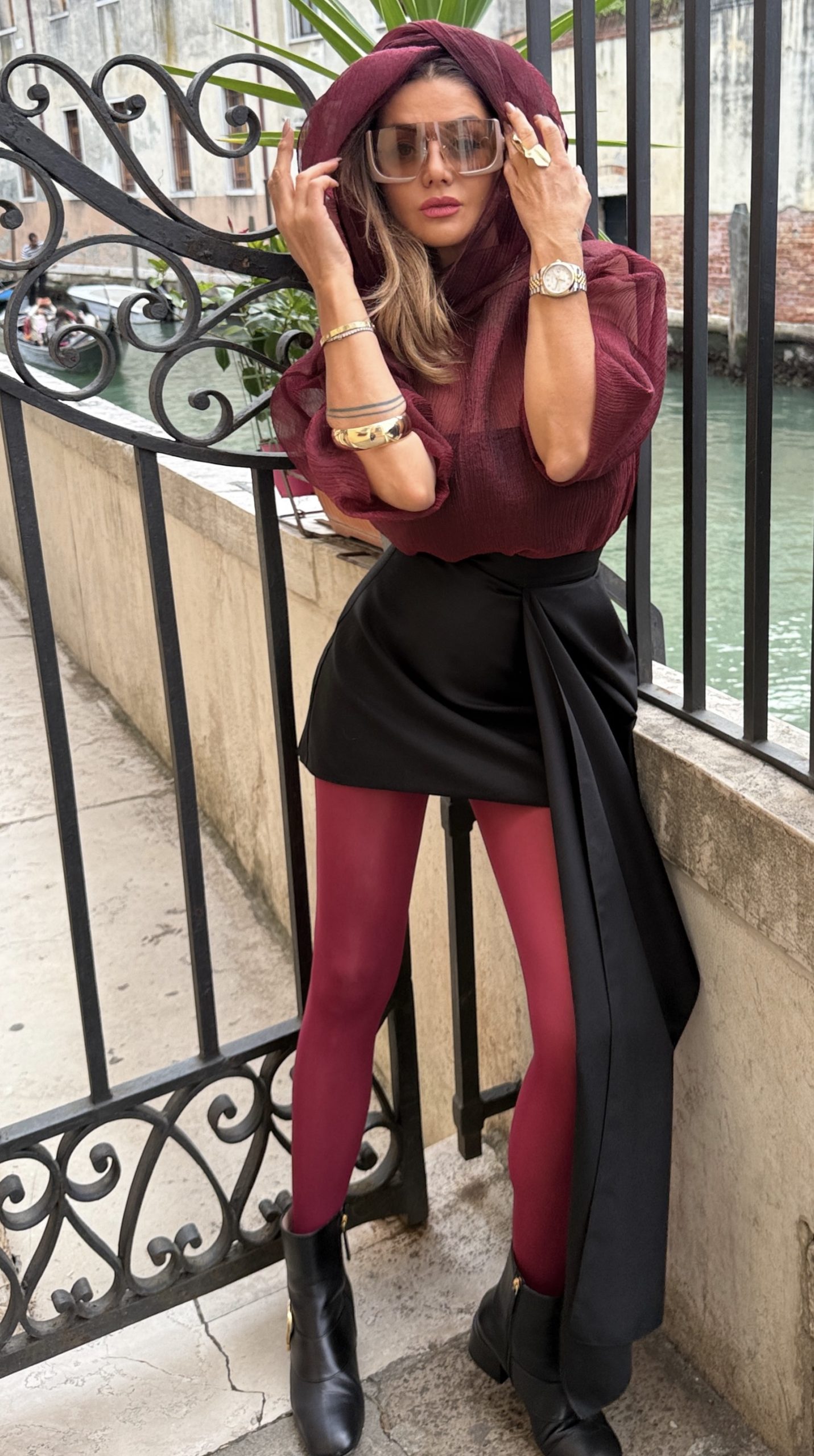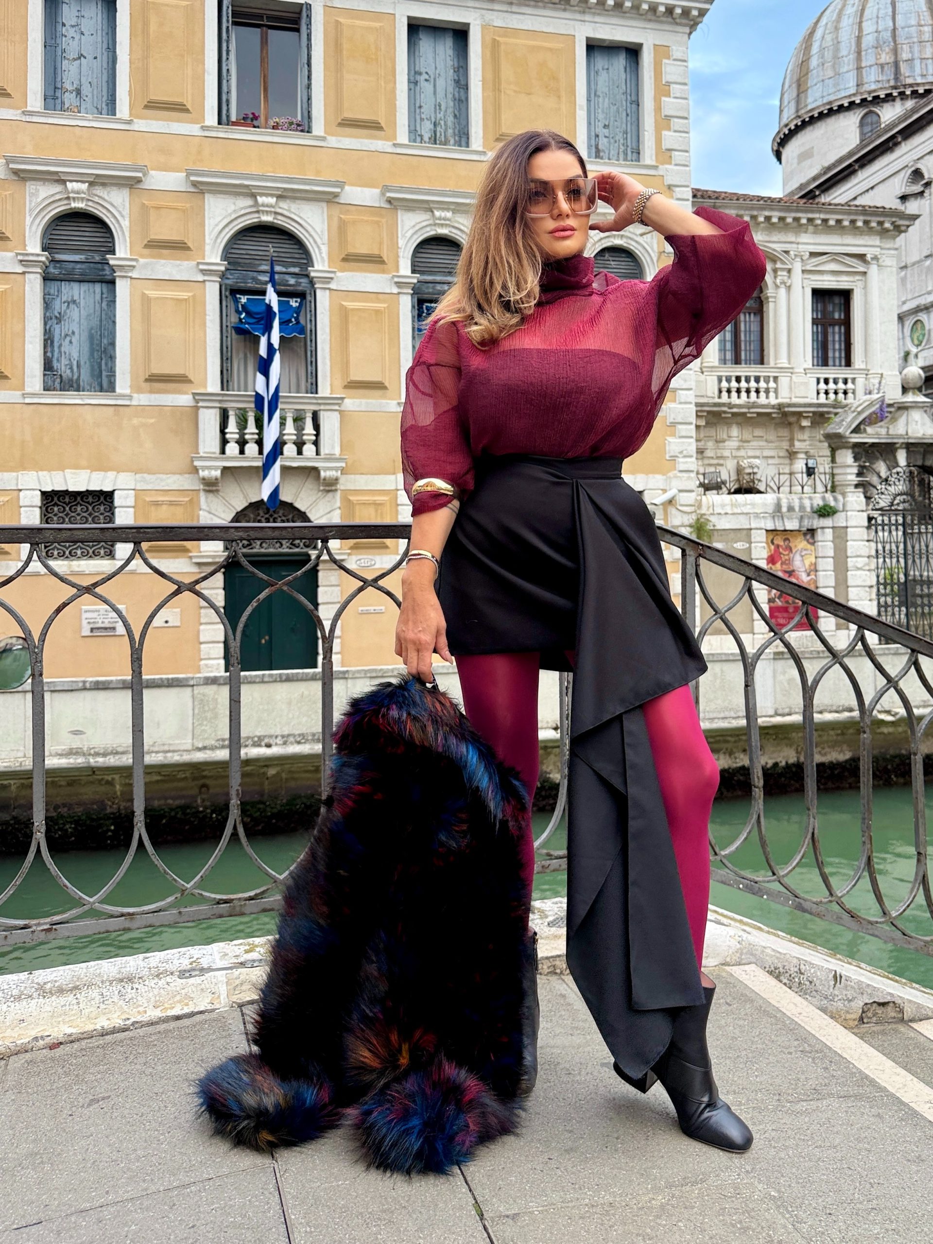 Блузата е изключително елегантна и женствена, изработена от ефирна, прозрачна материя- тафта в наситен бордо цвят. Има романтична, обемна панделка около врата, която придава изискан и шикозен акцент. Ръкавите са дълги и леко буфан, създавайки усещане за лекота и обем. Материята има деликатна текстура, която красиво улавя светлината, а прозрачността ѝ загатва силуета по фин и стилен начин.