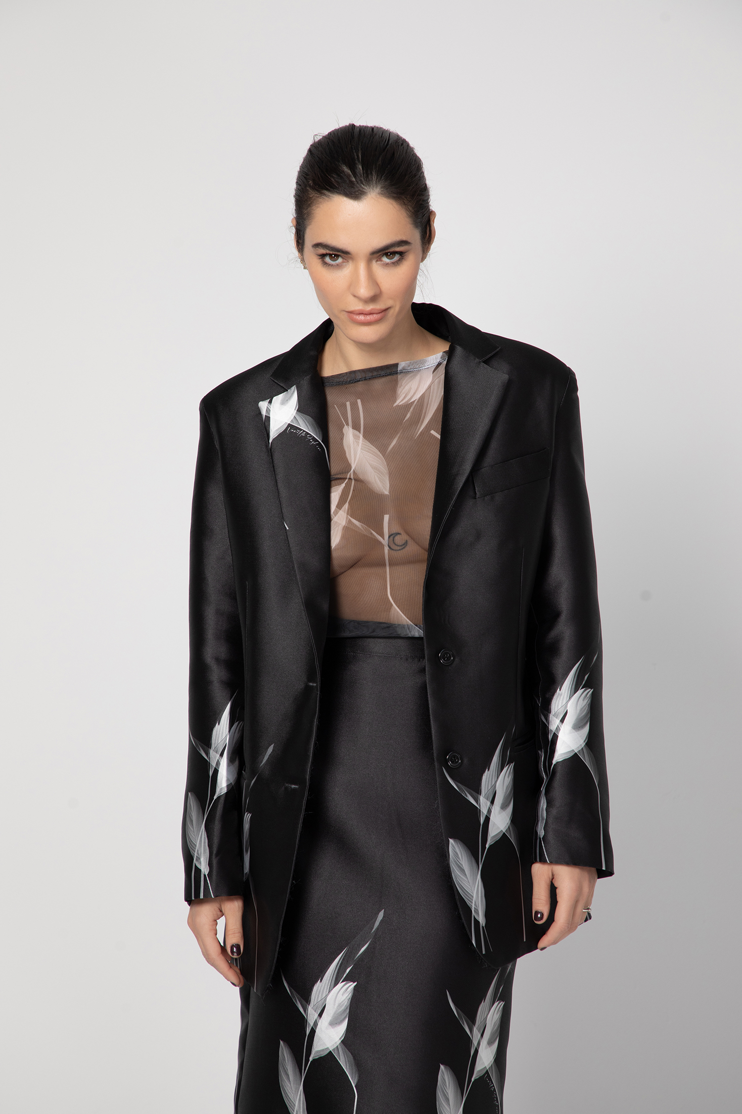 Тази ефирна блуза е изработена от фина естествена коприна с лек сатенен блясък, който придава луксозно усещане и изтънчен вид. Свободният силует осигурява лекота и комфорт, а прозрачната структура добавя доза модерна чувственост.