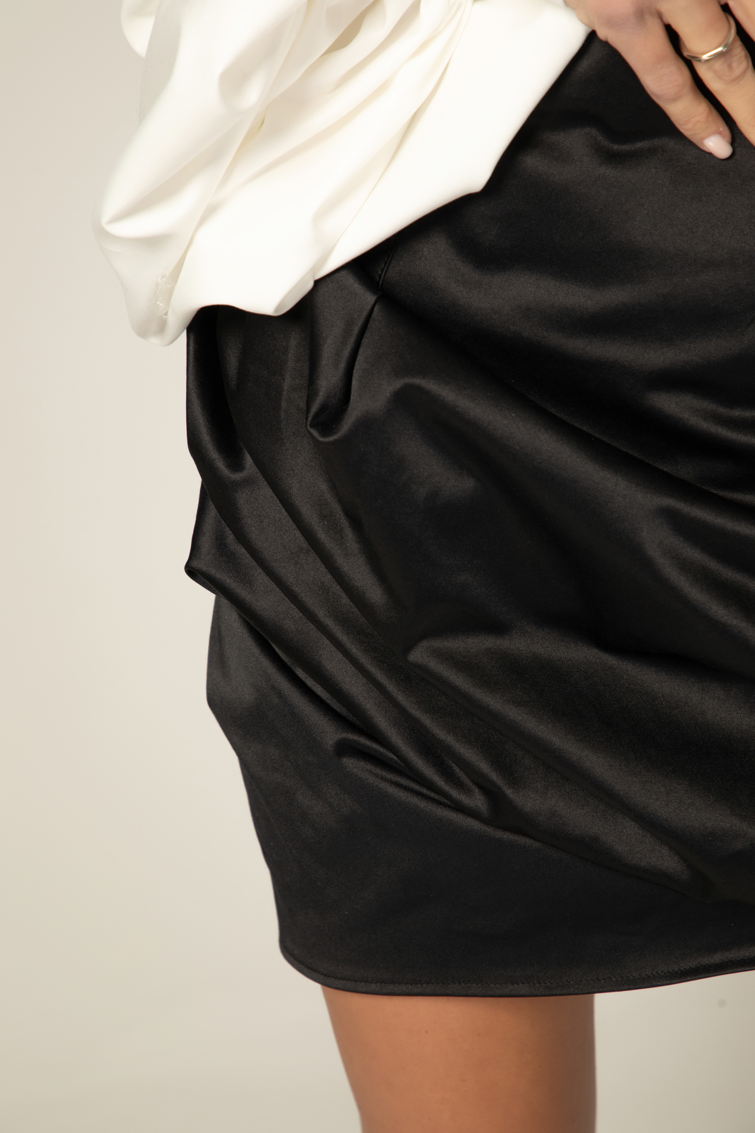 Ефектна къса пола, изработена от плътен памук. Акцентът е впечатляваща текстилна роза отпред, която придава скулптурен и женствен силует. Модел, създаден да привлича погледи – стилен, смел и неповторим.