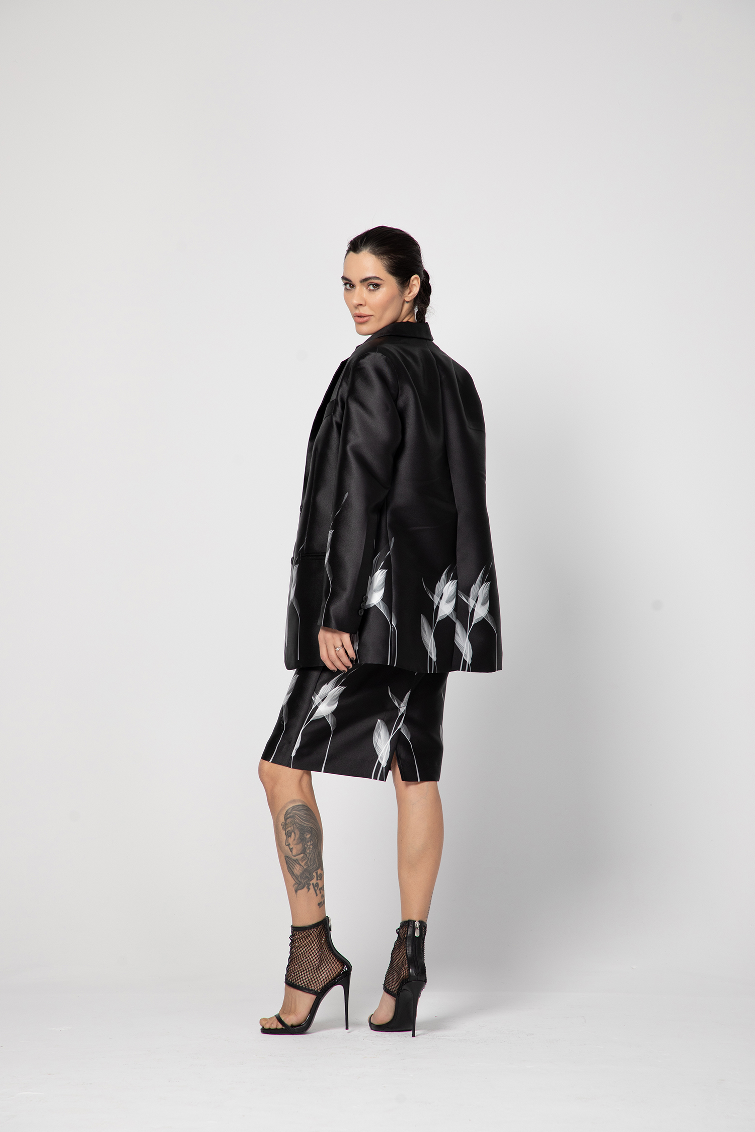 Полата е изключително модерна и артистична, с асиметричен дизайн, който придава на силуета динамика и изтънченост. Изработена е от черна стегната материя, която запазва формата си и пада красиво. Горната част е с висока талия, подчертана кройка и прецизна линия, а долната се разгръща в ефектно асиметрично парче плат, което създава усещане за движение и архитектурна визия.