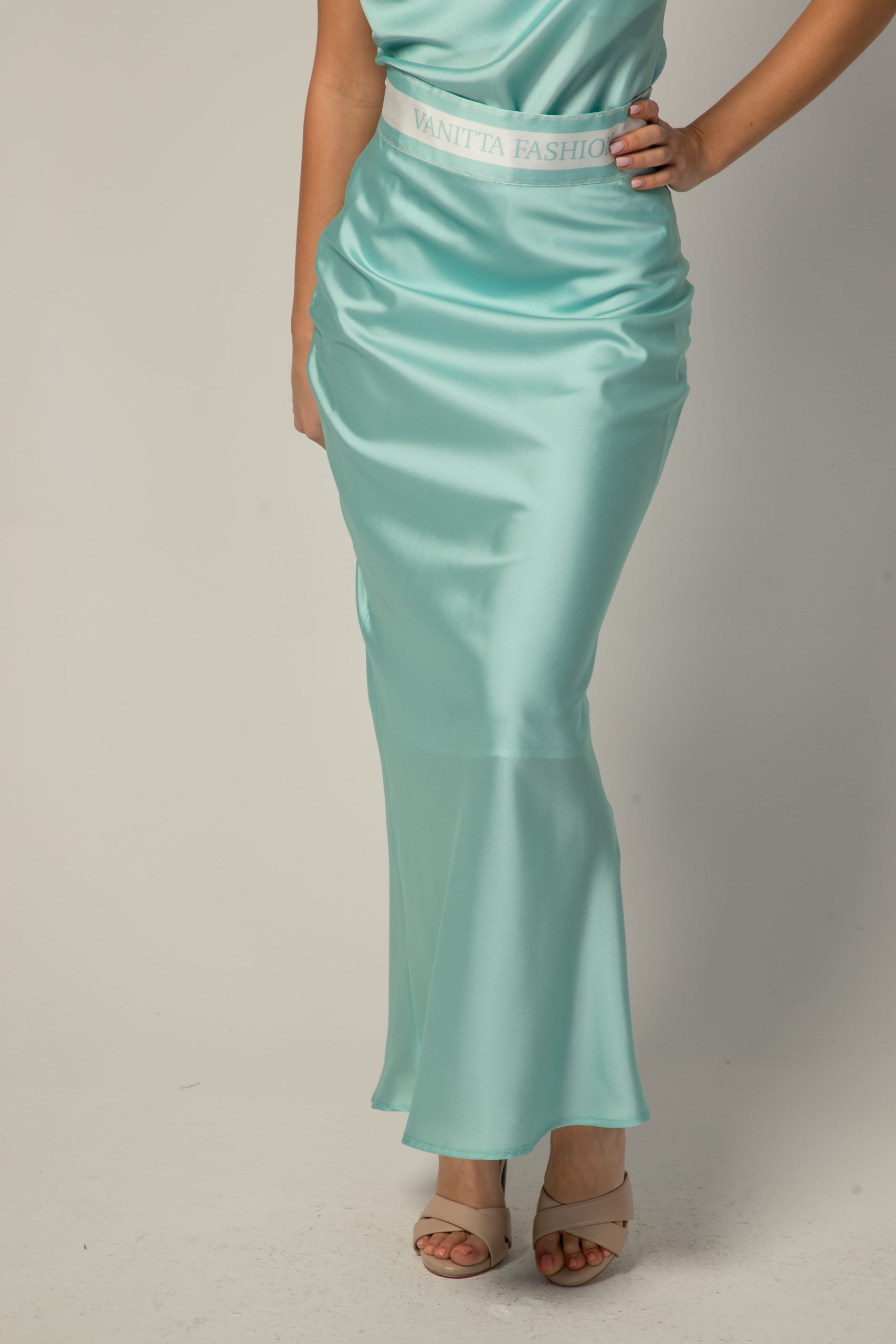 Широка дамска пола с висока талия, изработена от плътна коприна с елегантна лъскавина.