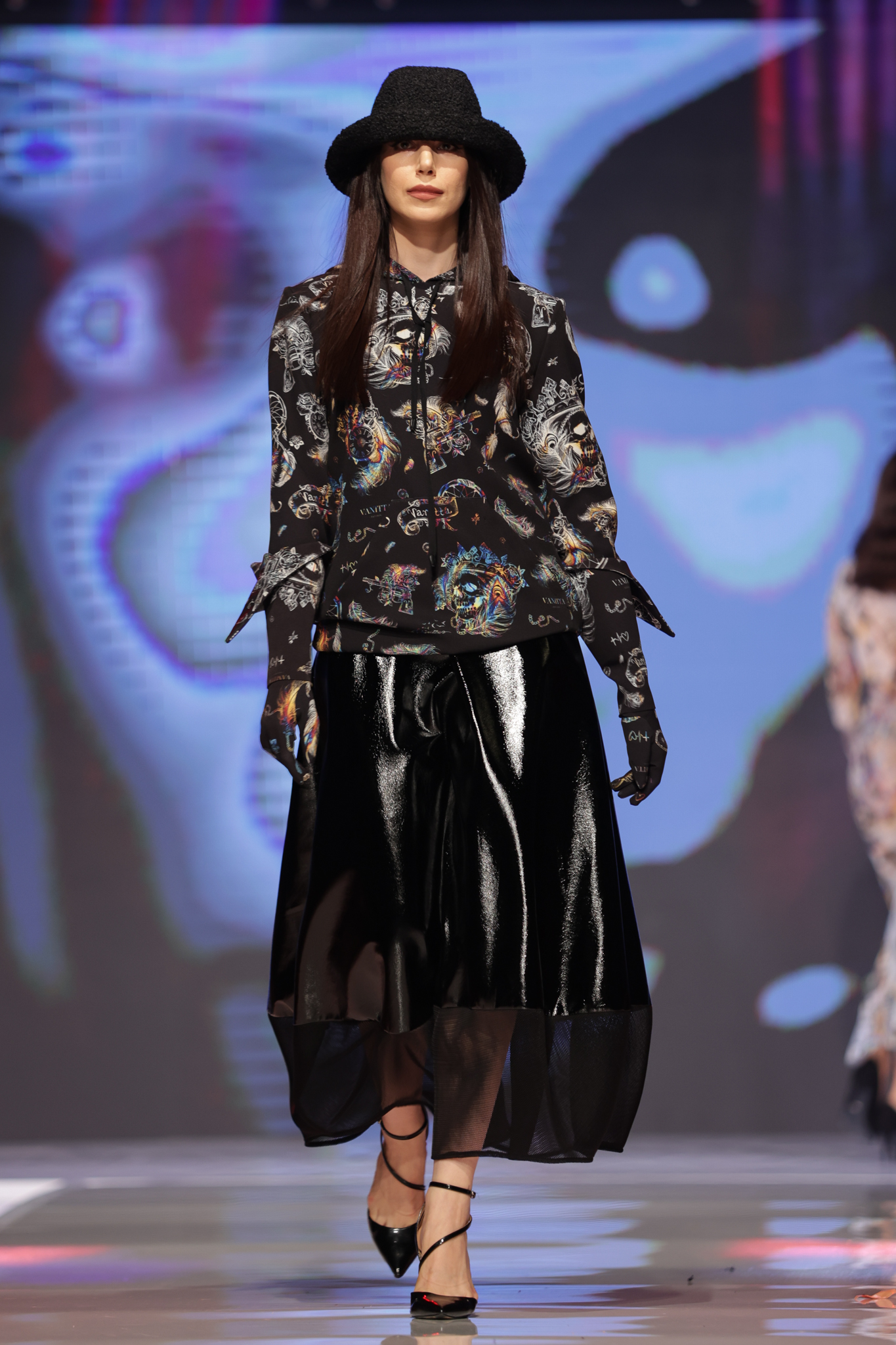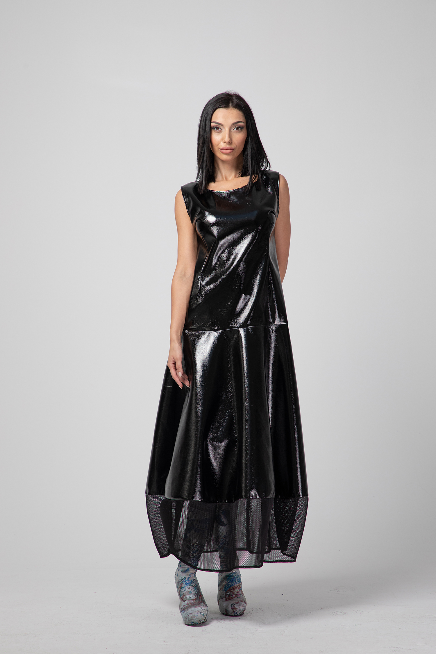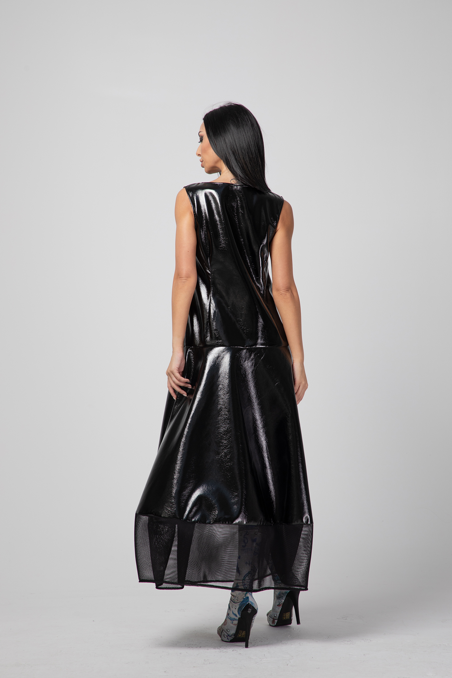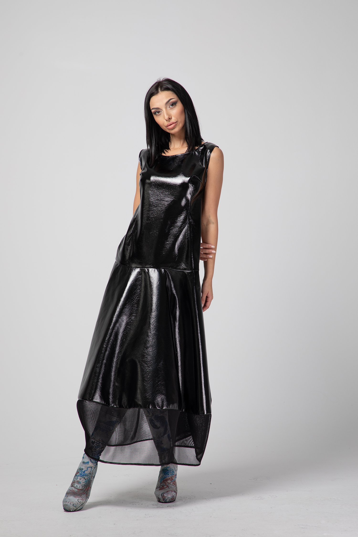 Дамска ефектна рокля, иновативна Fashion vision изработена от еко плат с ефектна лъскавина, съчетана с мрежа. Една иновативна визия, различна и модерна.