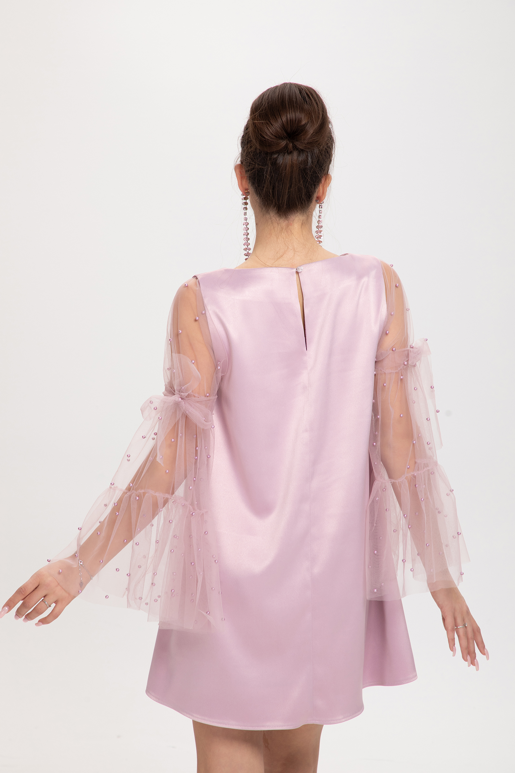 Красива дамска рокля от плътен перлен сатен в нежен млечен цвят. Роклята е с разширен силует и красиви транспарантни ръкави от тюл и перли.