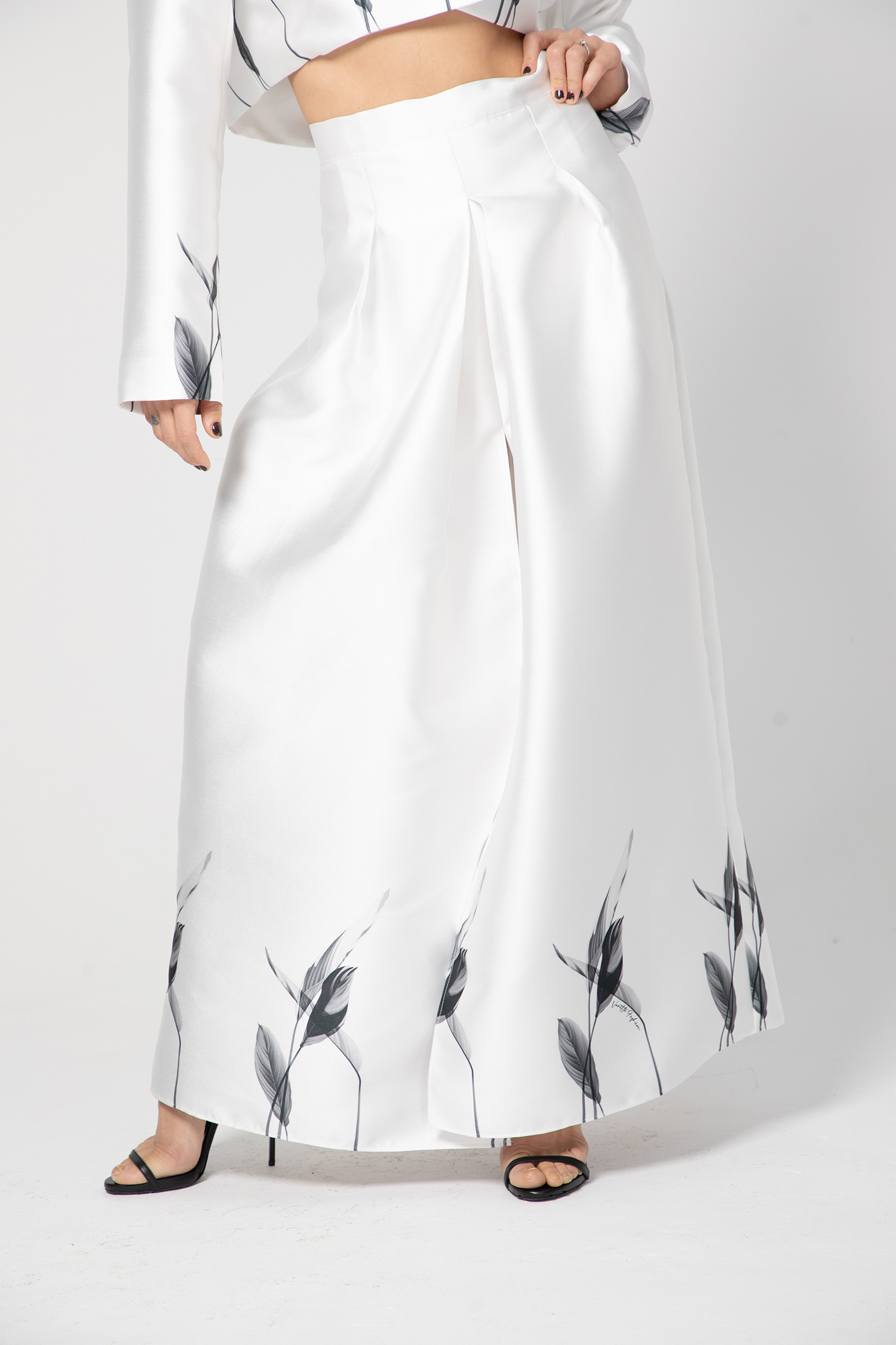 Тази впечатляваща пола е изработена от красива, плътна материя с фин блясък, която създава богат обем и изразително движение. Кройката е нестандартна и архитектурна, с меки конструкции и плавни линии, които оформят силуета по модерен и артистичен начин. Обемът е балансиран и придава драматичност, без да утежнява визията, превръщайки полата в силен акцент за стилни и концептуални комбинации.