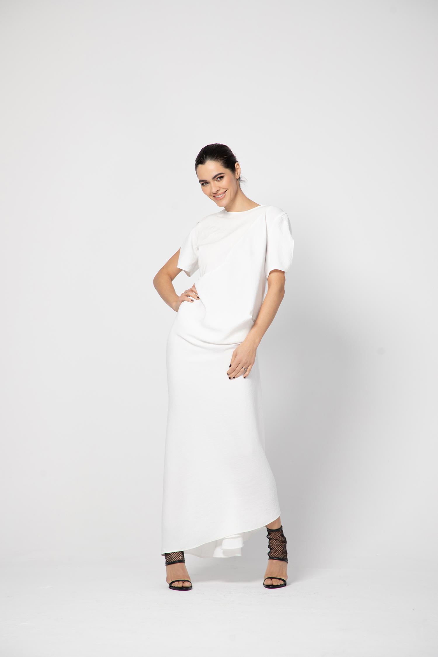 Тази блузка от финна коприна впечатлява с изчистен силует и елегантна, минималистична визия. Меката и лека материя пада свободно по тялото, създавайки усещане за комфорт и лукс. Моделът е с права кройка и овално деколте, което подчертава деликатно линията на шията. Ръкавите са 7/8, акцентирани с ефектни набирания и фино оформен обем, придаващи женственост и модерен характер. Универсален дизайн, подходящ както за елегантни, така и за ежедневни стилни комбинации.