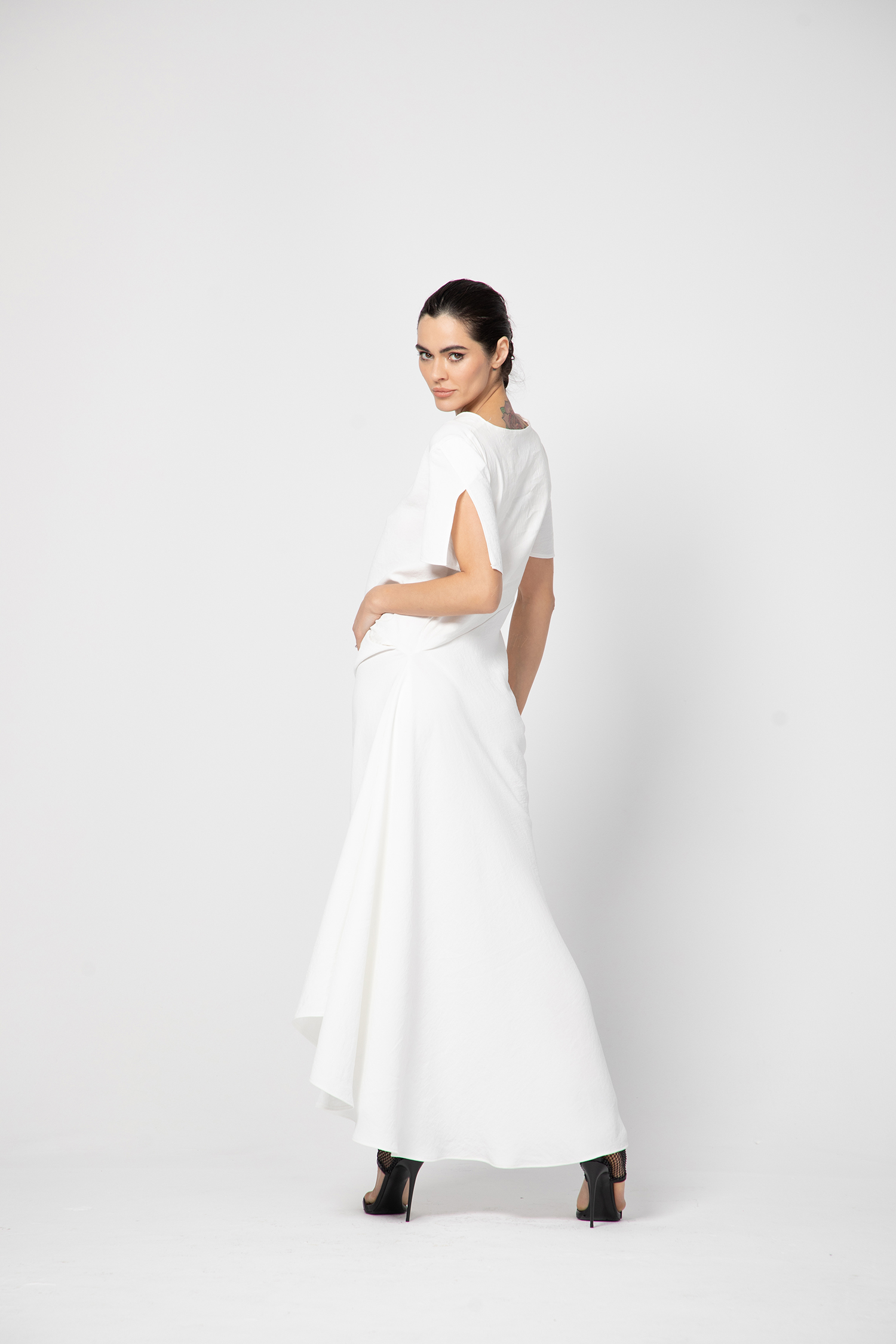 Тази впечатляваща пола е изработена от красива, плътна материя с фин блясък, която създава богат обем и изразително движение. Кройката е нестандартна и архитектурна, с меки конструкции и плавни линии, които оформят силуета по модерен и артистичен начин. Обемът е балансиран и придава драматичност, без да утежнява визията, превръщайки полата в силен акцент за стилни и концептуални комбинации.