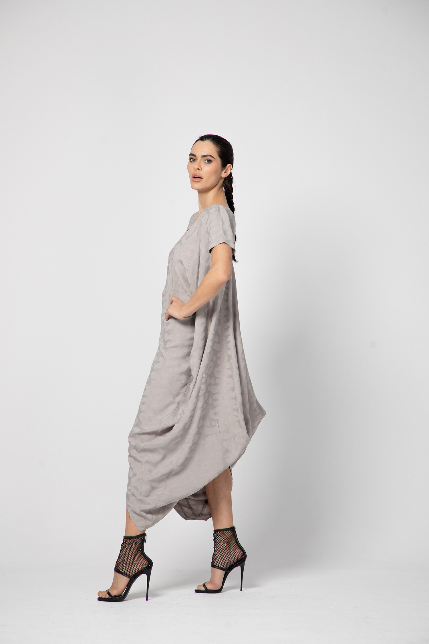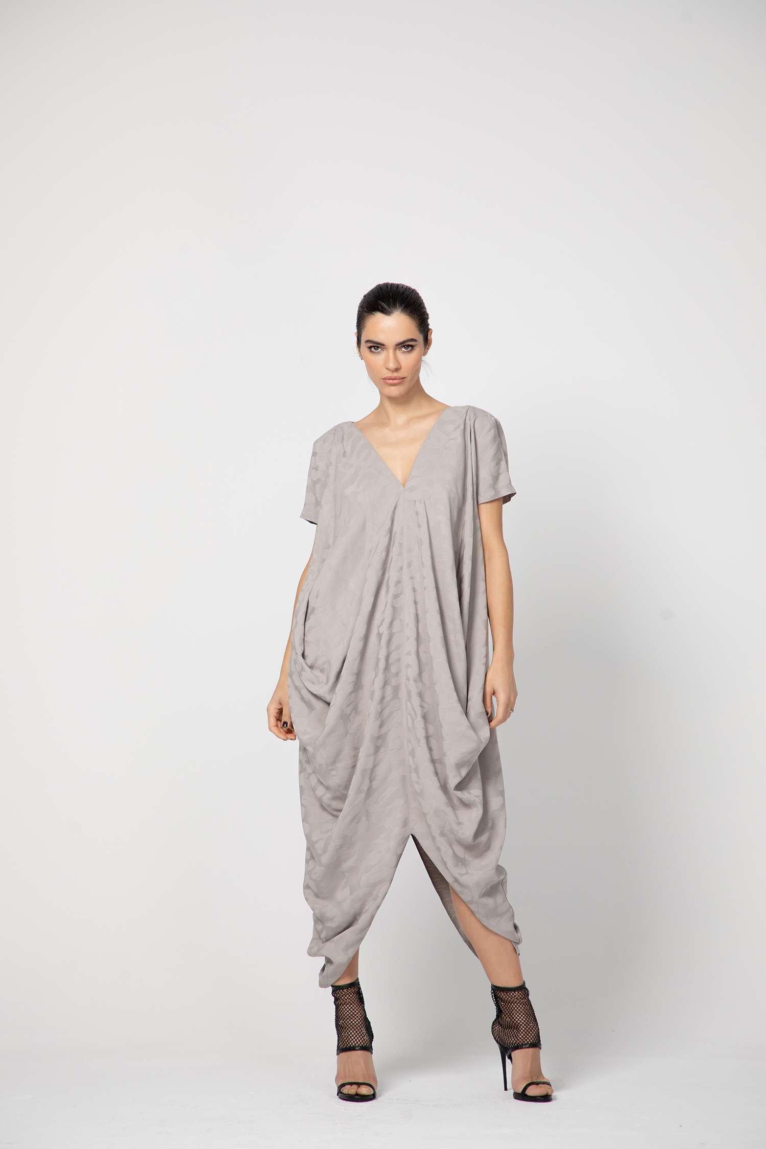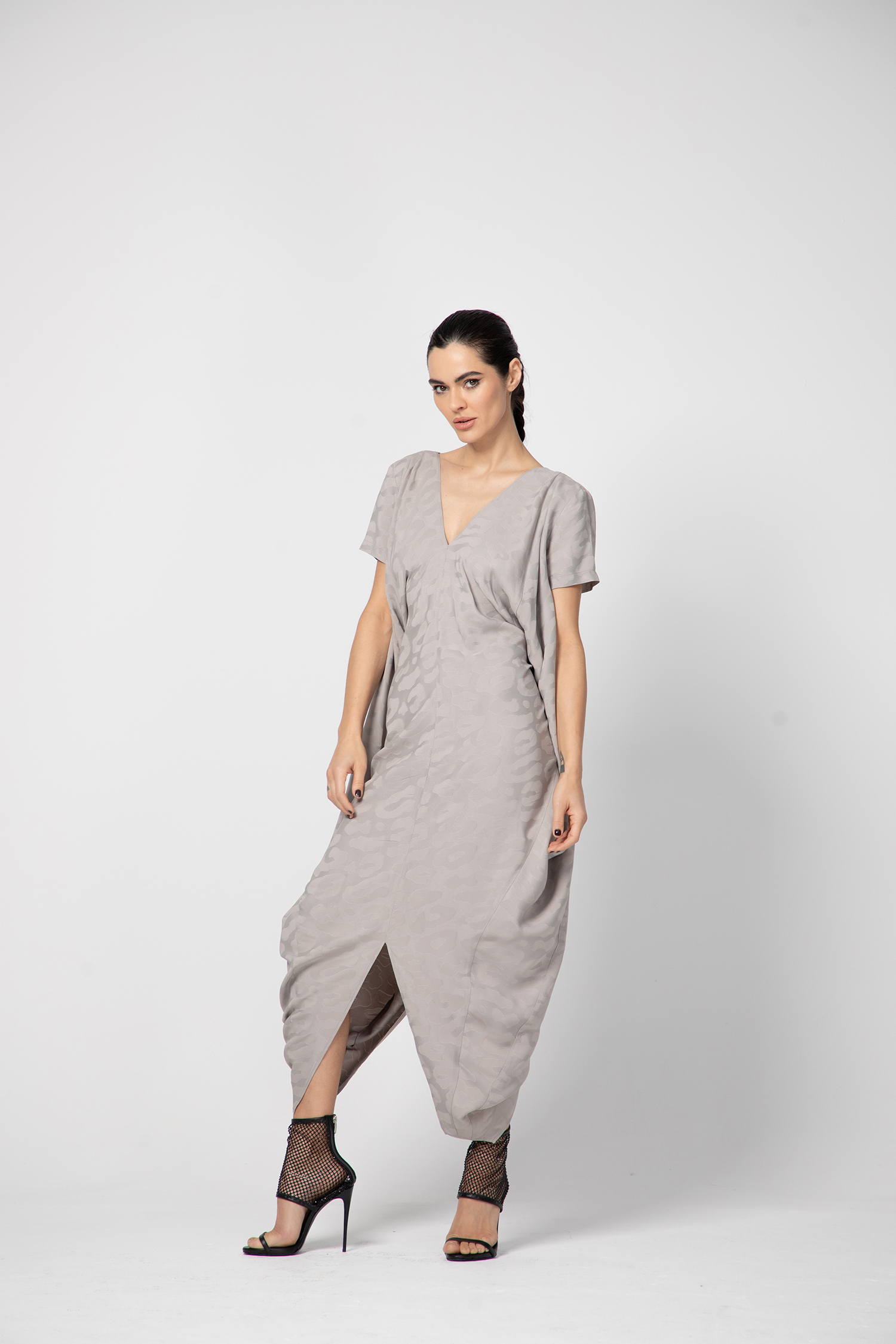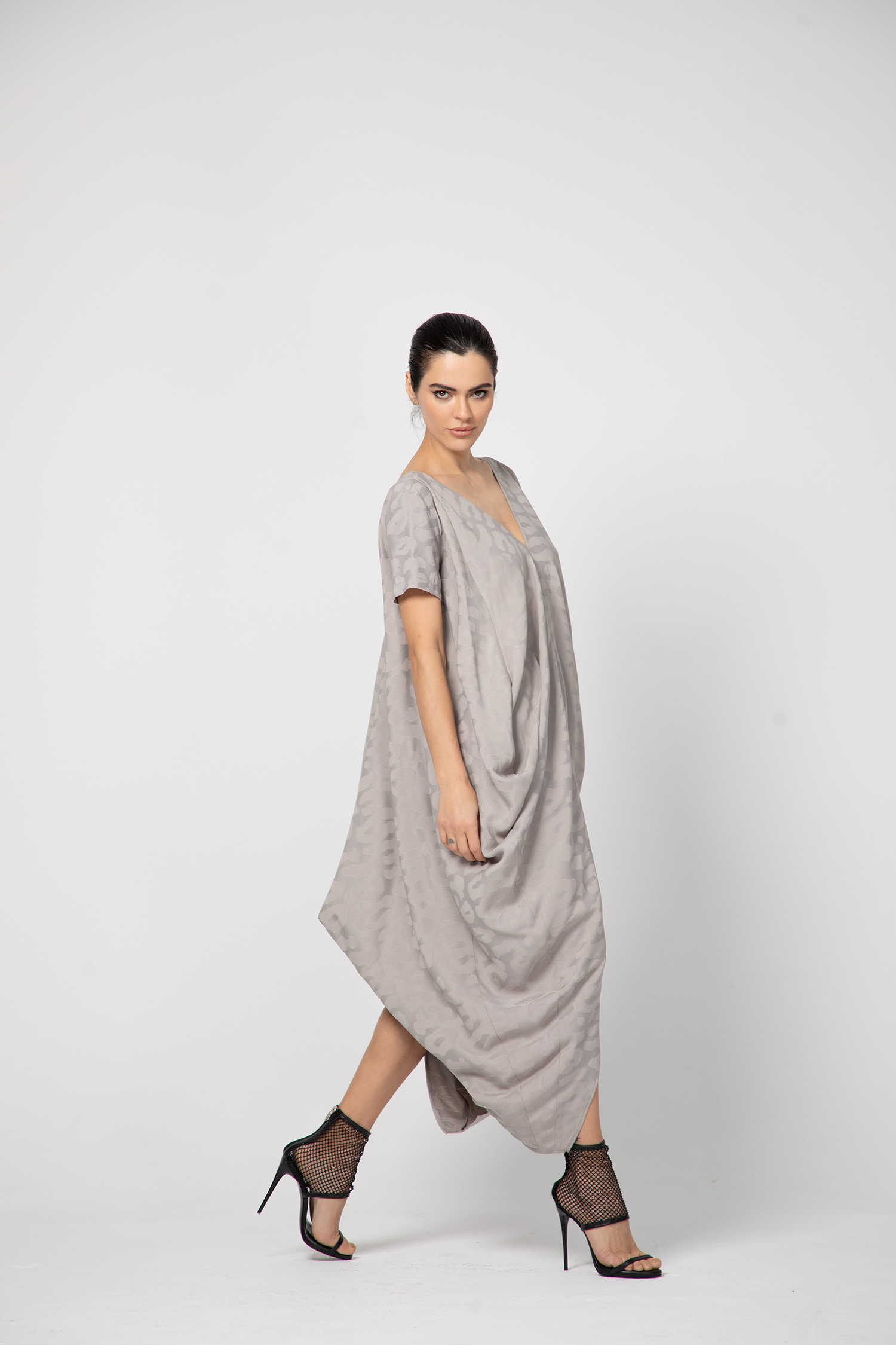 Роклята е с завладяваща движенията асиметрична конструкция, вътрешни връзки дават възможност за по- втален силует.