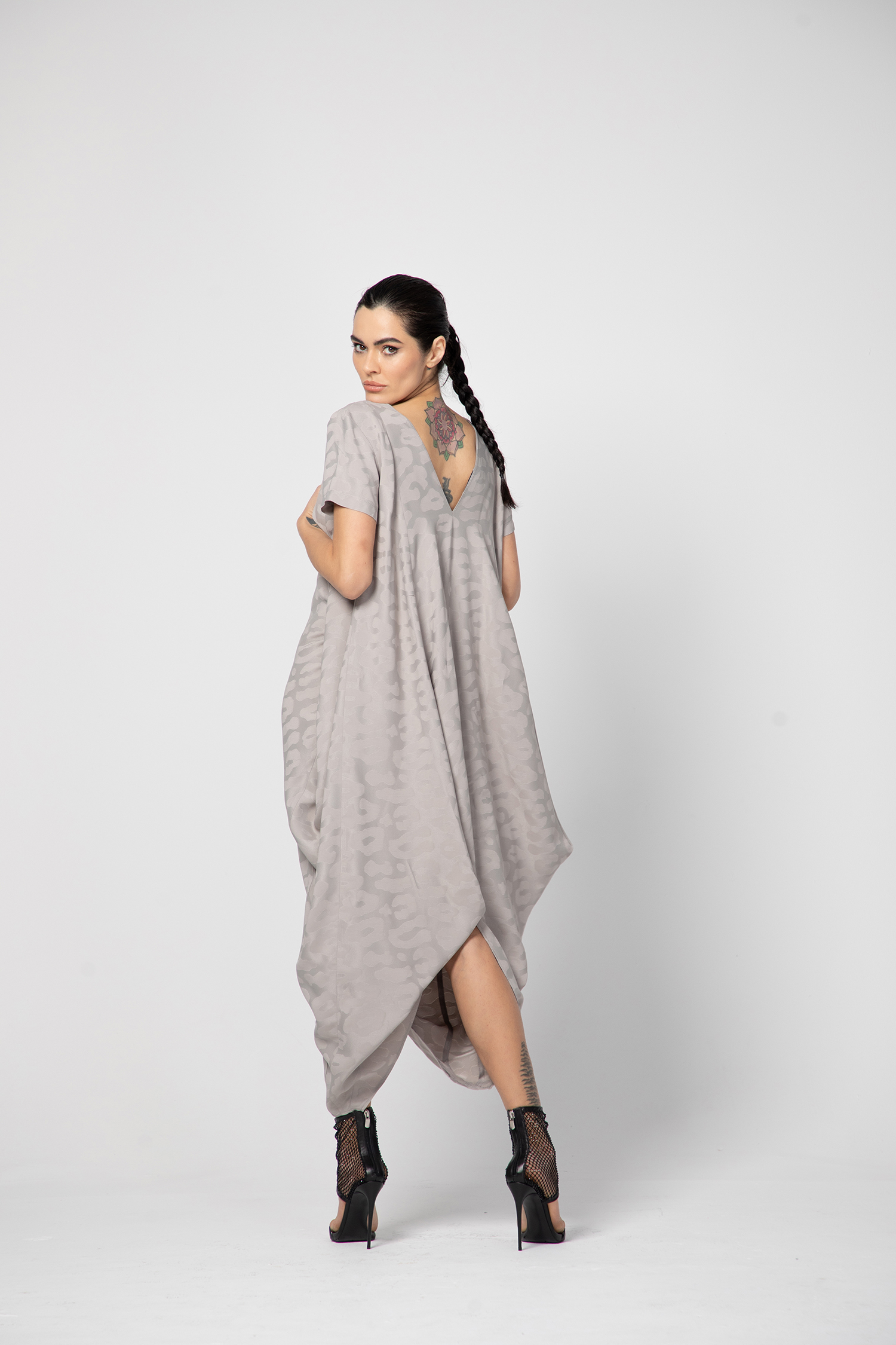 Удобна широка рокля, изработена от плътен ленен плат с бляскав ефект. Широки ръкави от коприна с връзки в горната част. Подходяща за всеки тип фигура.