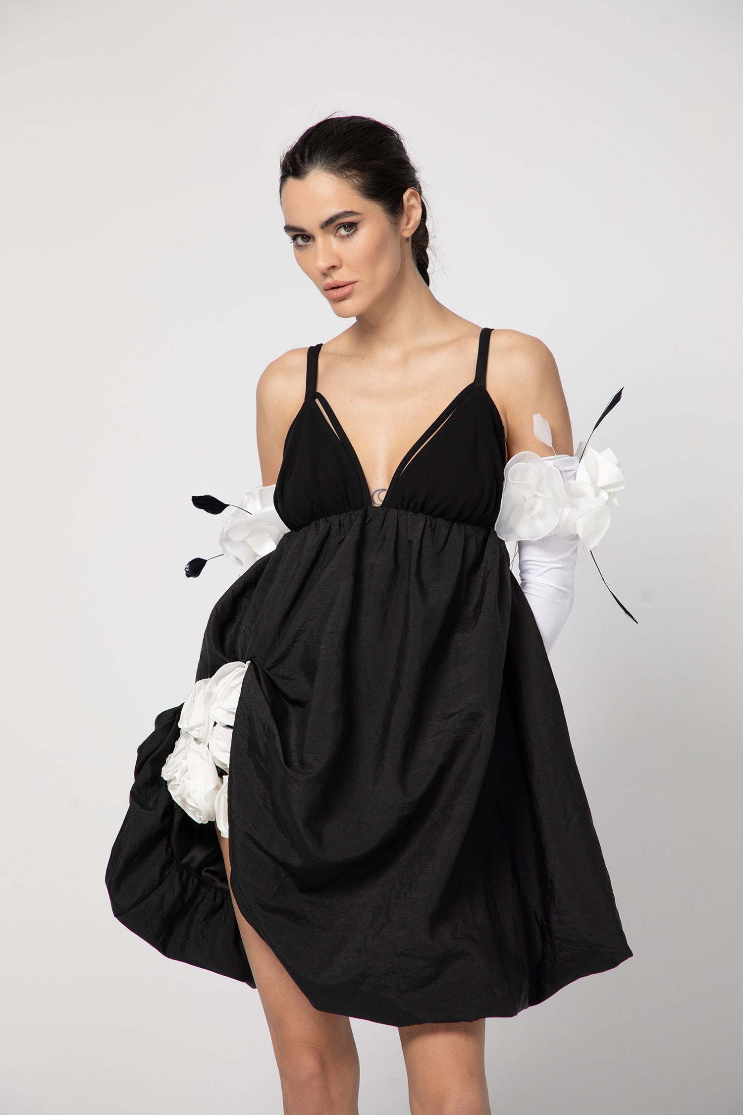 Тази впечатляваща пола е изработена от красива, плътна материя с фин блясък, която създава богат обем и изразително движение. Кройката е нестандартна и архитектурна, с меки конструкции и плавни линии, които оформят силуета по модерен и артистичен начин. Обемът е балансиран и придава драматичност, без да утежнява визията, превръщайки полата в силен акцент за стилни и концептуални комбинации.