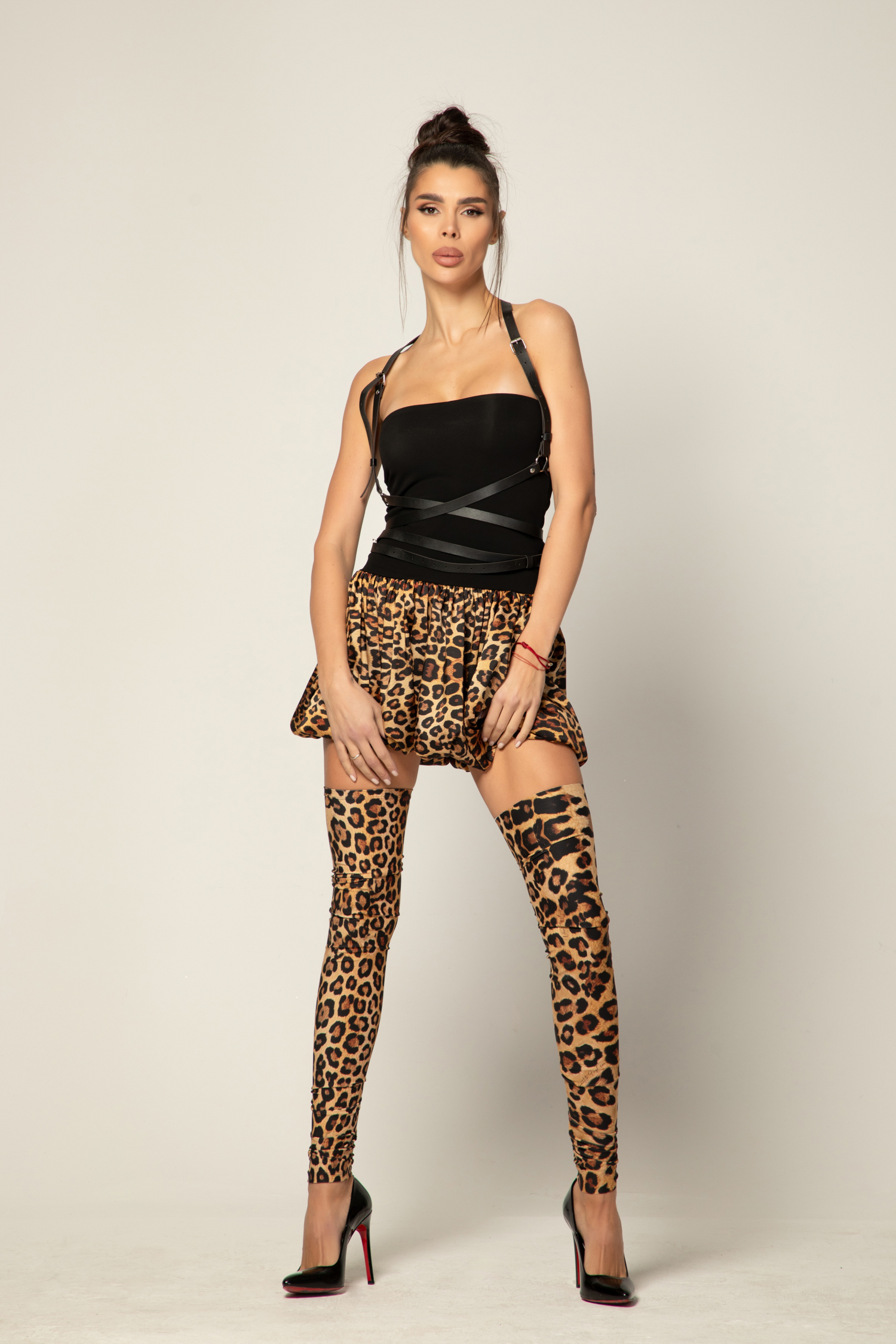 Тази рокля излъчва увереност, индивидуалност и закачлива енергия. Съчетавайки дръзкия животински принт с изтънчени аксесоари като кожения колан и чорапите, тя е създадена за дамите, които не се страхуват да бъдат в центъра на вниманието.