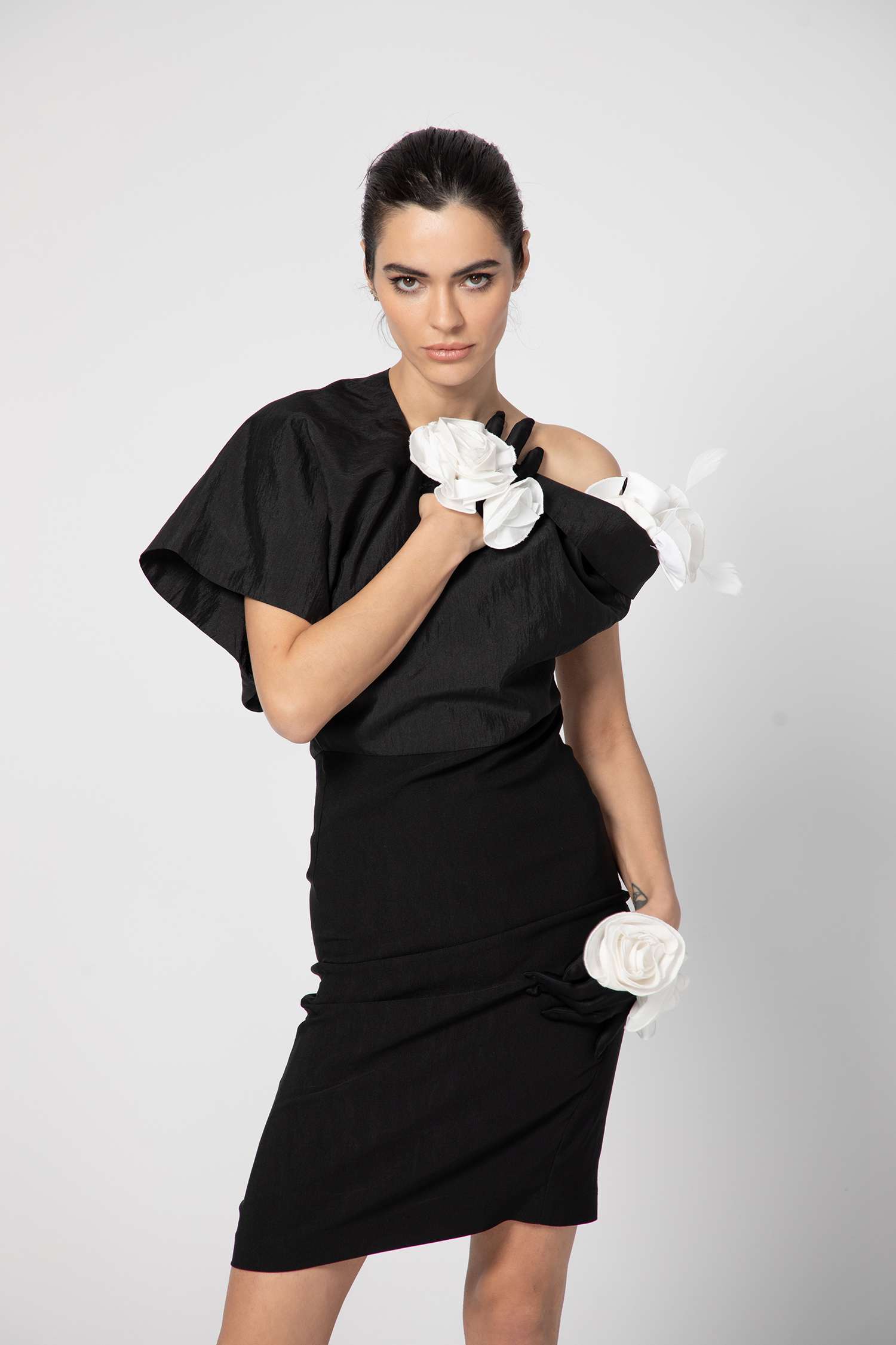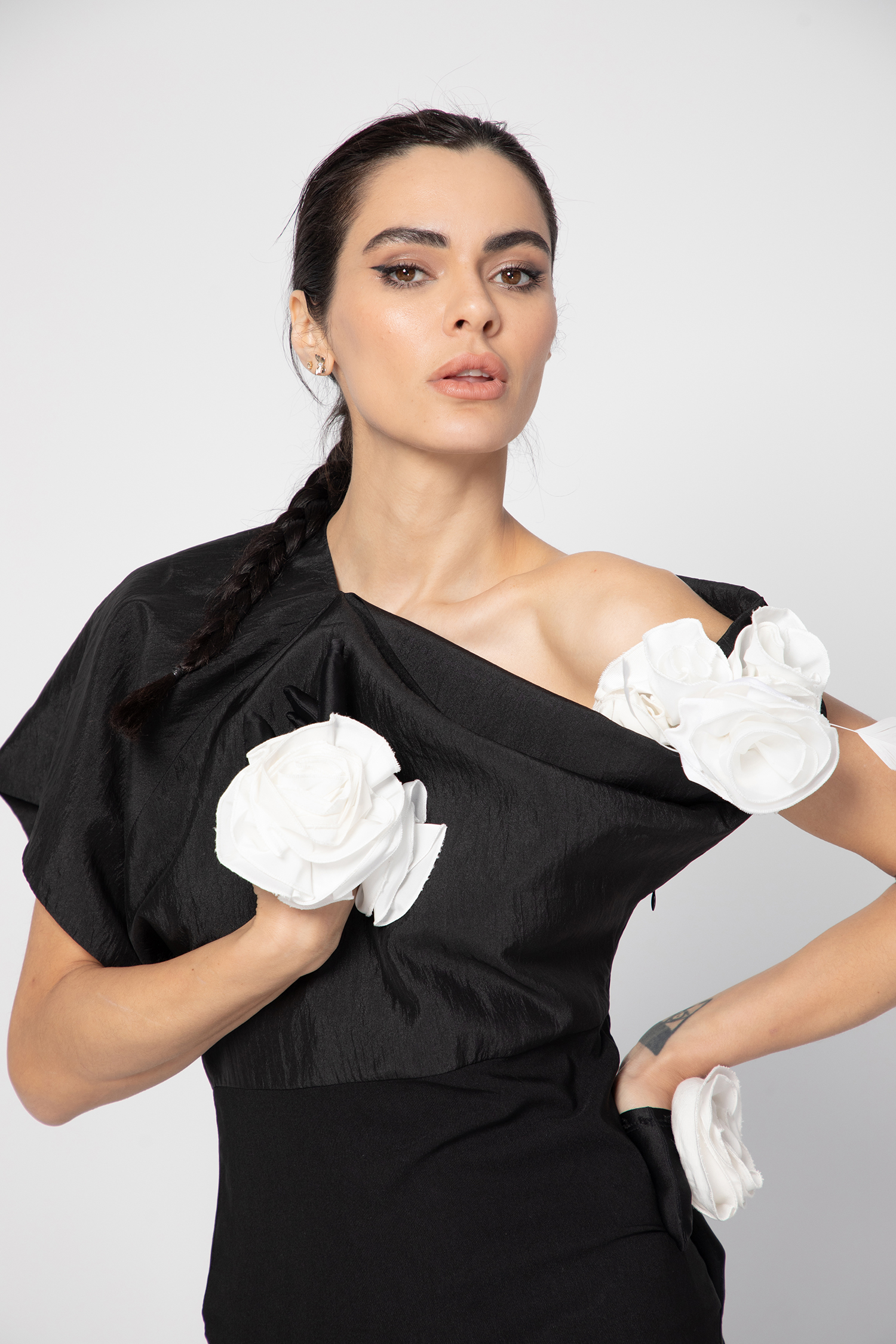 Прелестна рокля изработена от висококачествена тафта съчетана с еластичен плат в долната част. Асиметрична модерна кройка, закачлив флорален елемет от приказни рози, различна и неповторима визия, избери я за твоят празник!