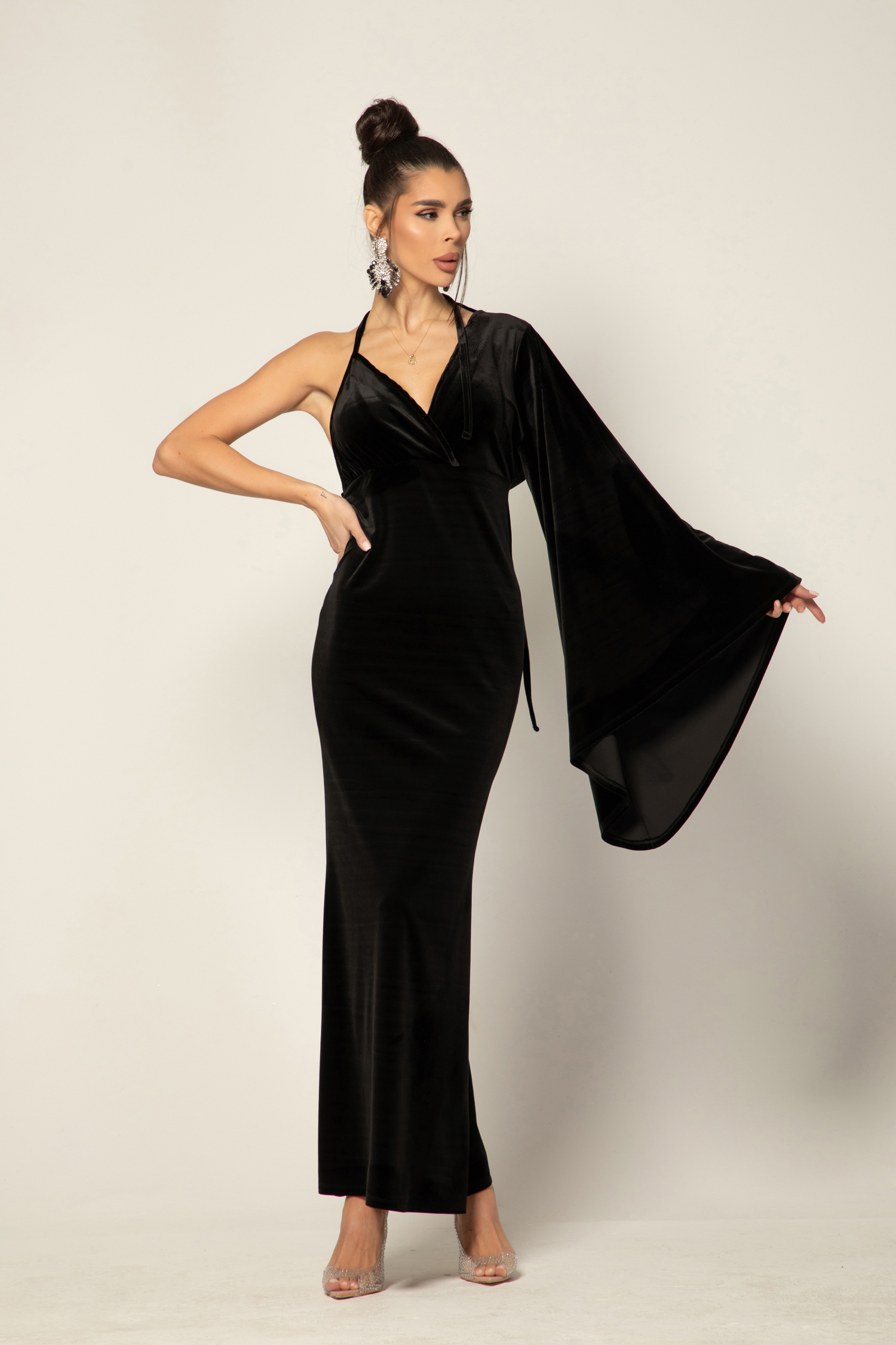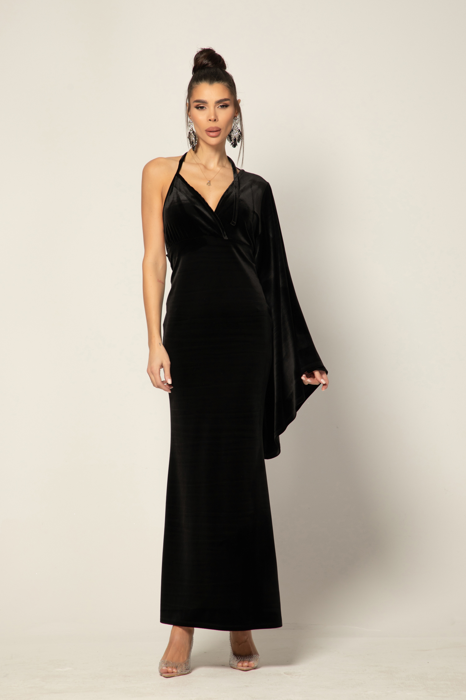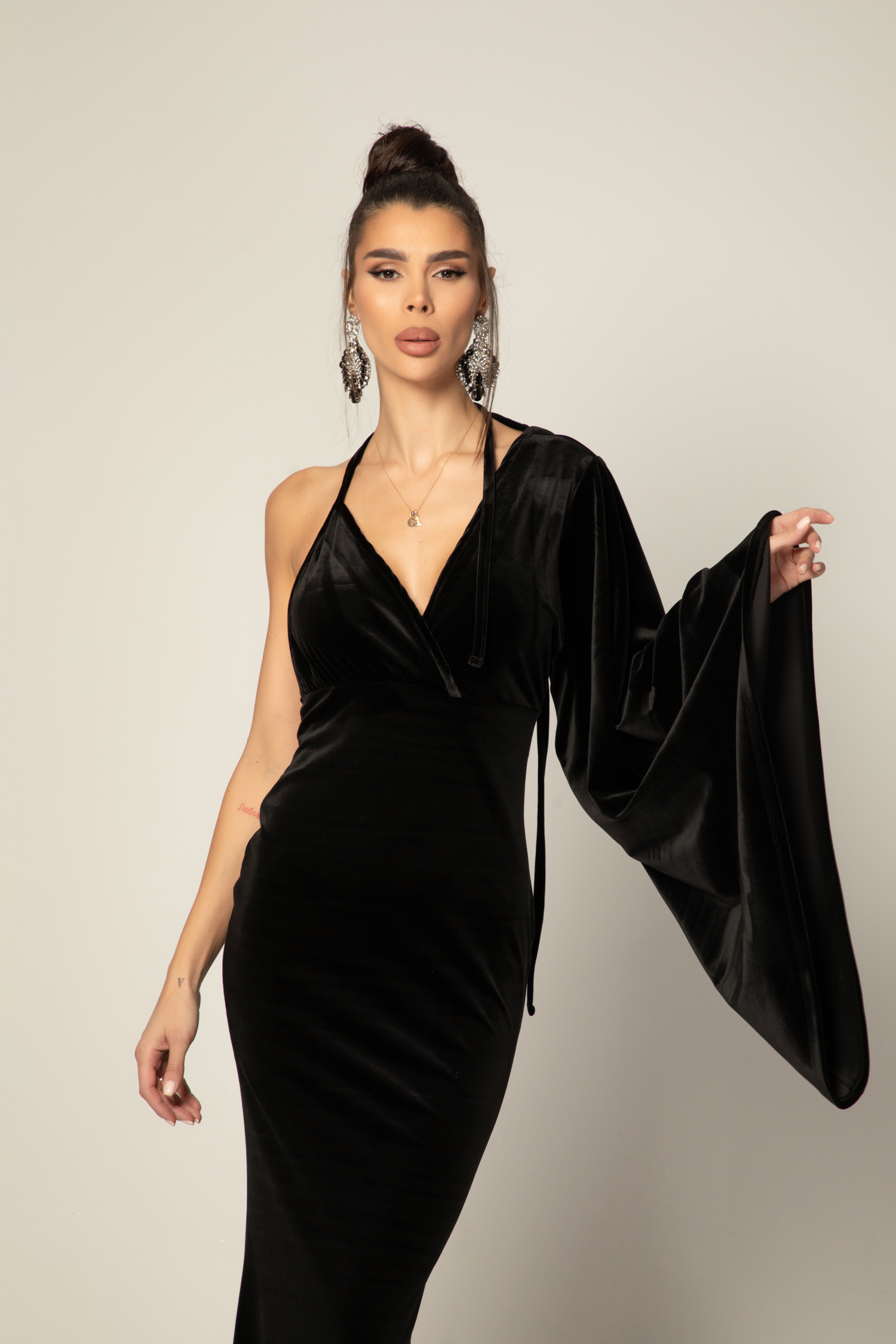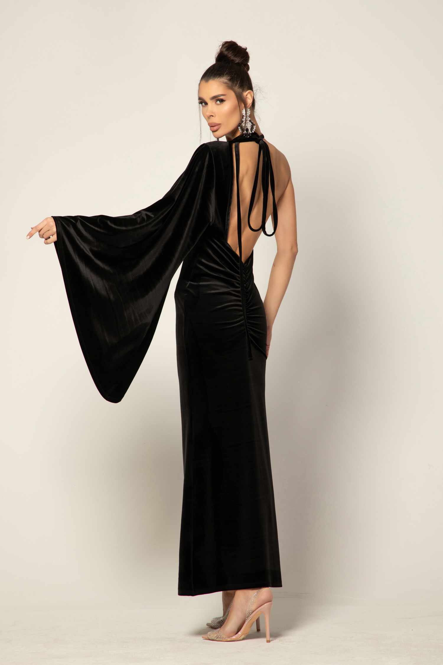 Кройката е женствена и подчертаваща фигурата, с изразителна асиметрия, която добавя модерен акцент. Широкият ръкав тип „камбана“ придава ефирност и движение, докато елегантно изрязаният отворен гръб разкрива деликатна чувственост и грация.