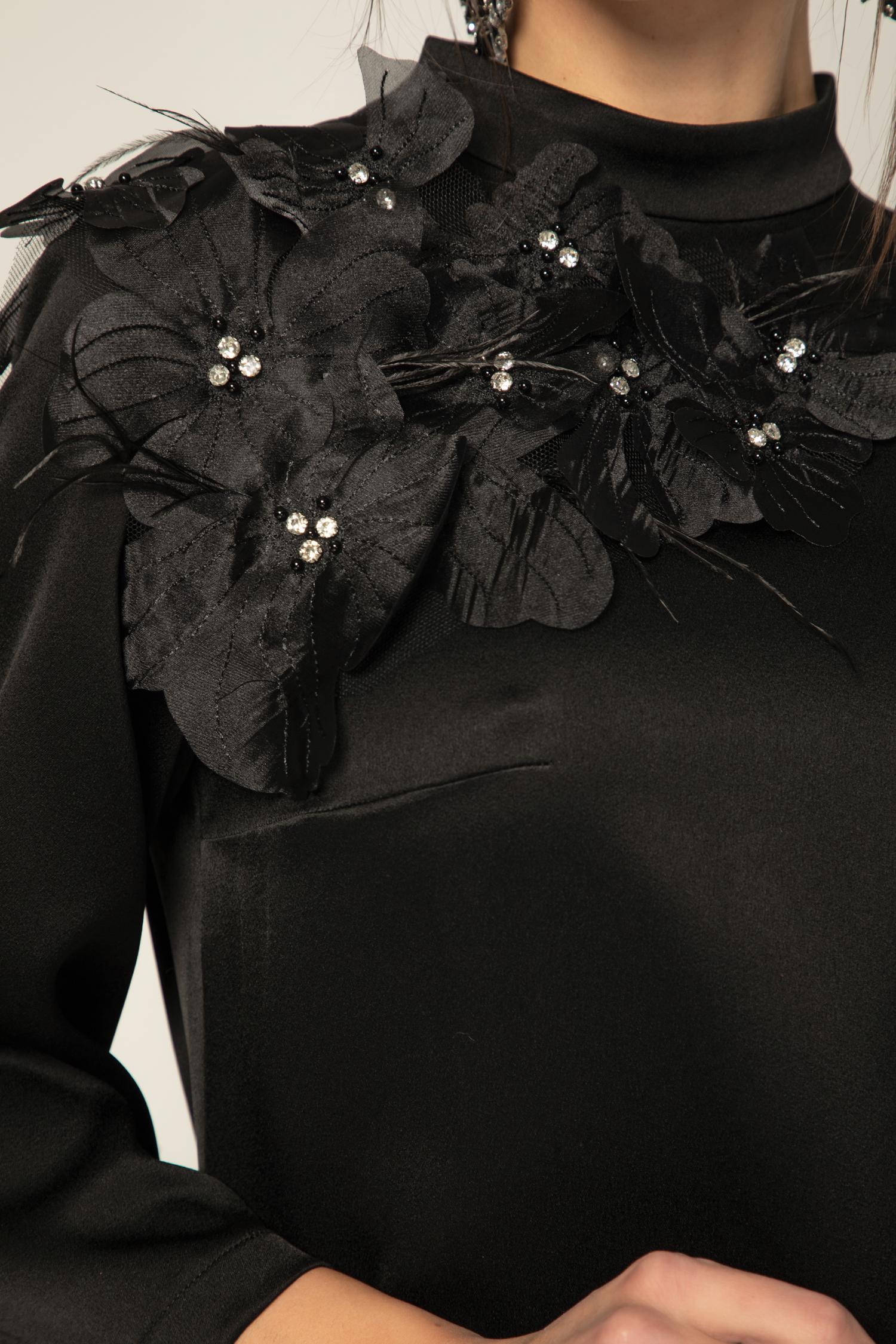 Декорацията в горната част на роклята е изящни цветя, ръчно изработени, сякаш нежно разцъфнали върху плата. Между тях са вградени малки, деликатно блестящи камъни, които улавят светлината и придават допълнителен чар. По краищата на декорацията се спускат естествени пера от щраус, които придават движение и драматичност на визията.