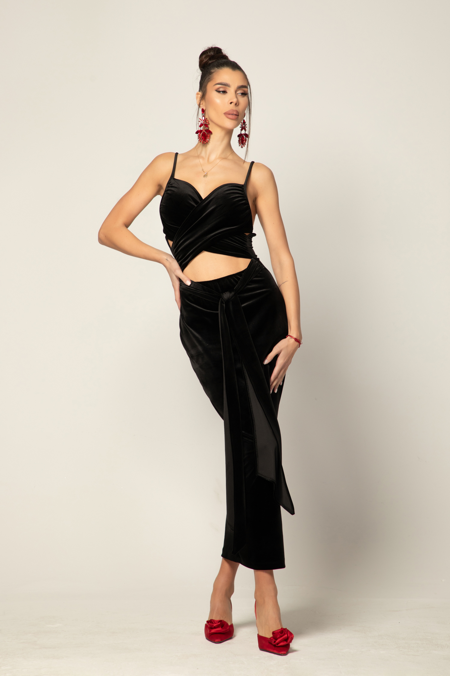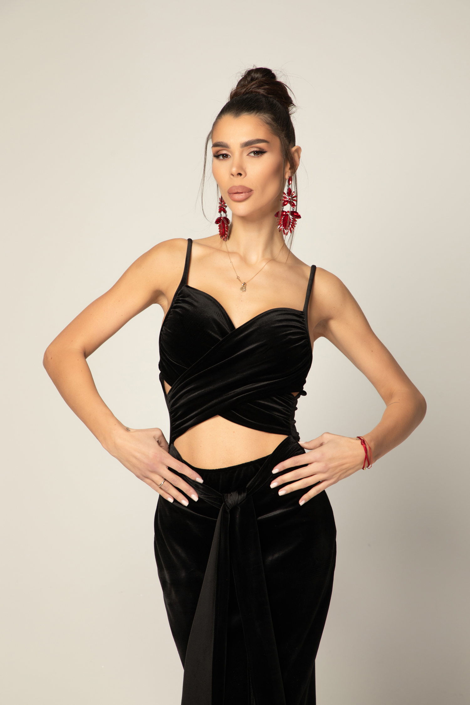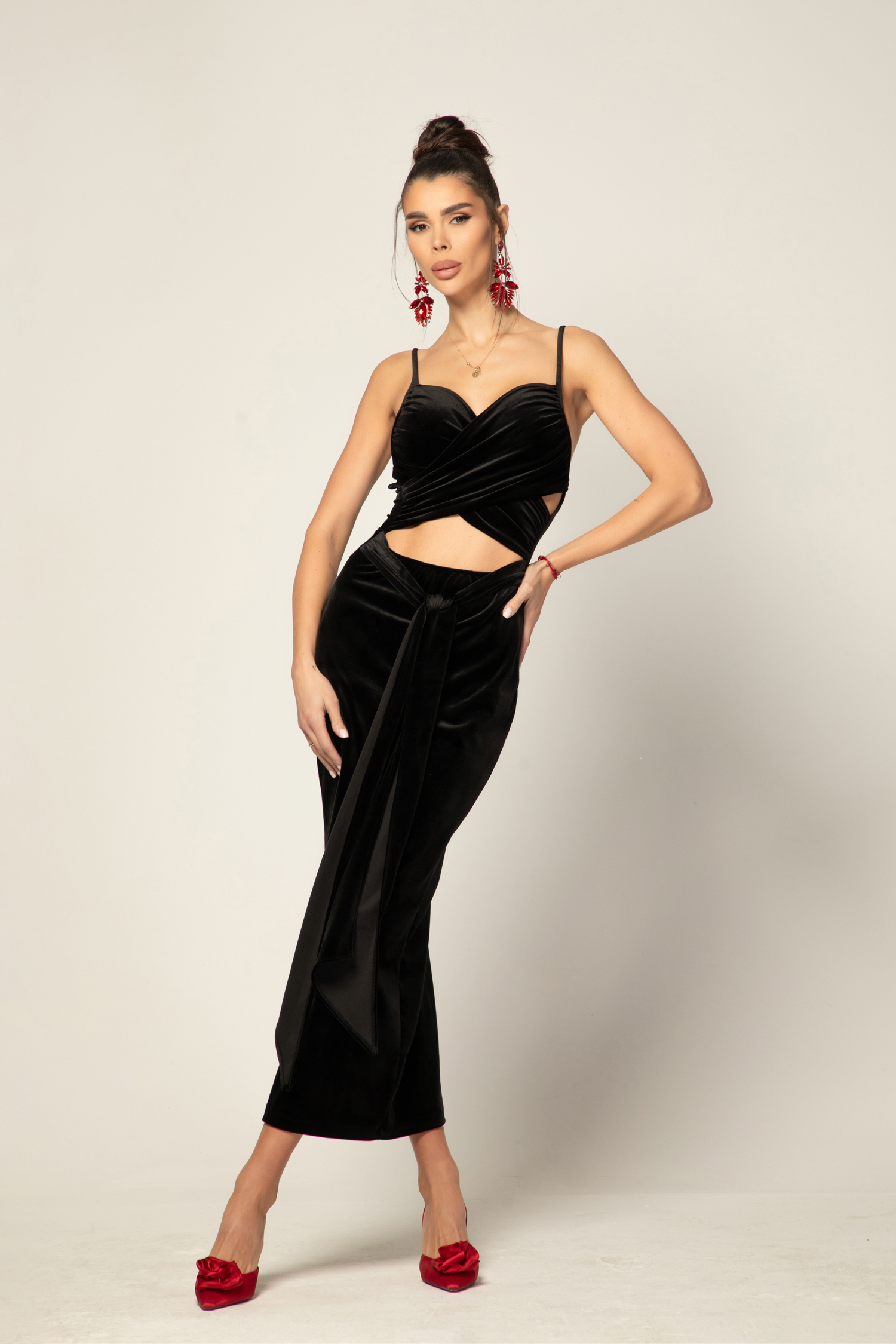 Тази рокля от меко кадифе е създадена да подчертае женствеността и да осигури изтънченост на всяка дама. Със своята елегантна кройка и финни детайли, тя е перфектният избор за изискани поводи, като коктейлни вечери, балове и официални събития.