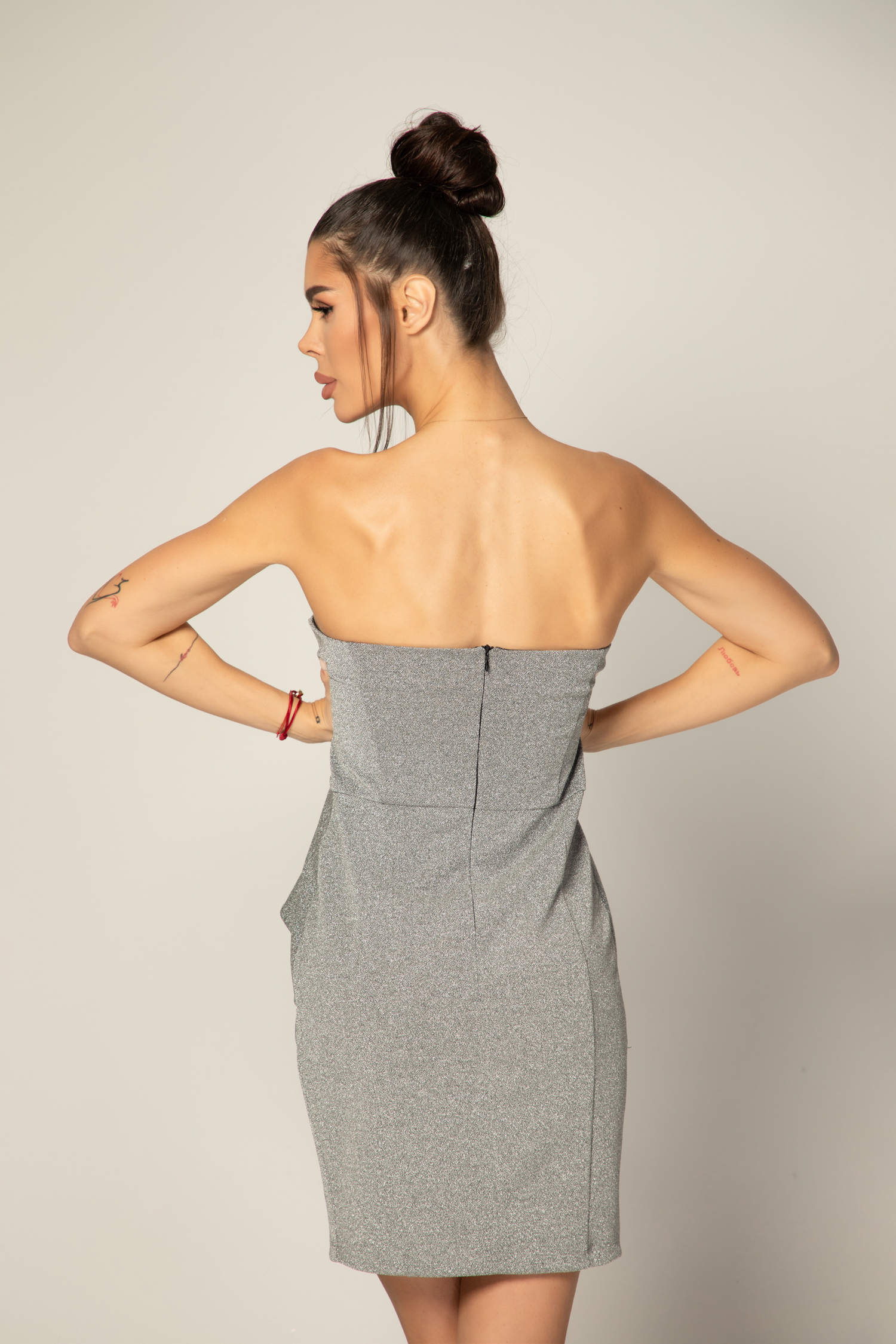 Представяме ви нашата въздействаща дамска рокля, изработена от ефектен сребрист плътен плат. Горната част е тип бюстие изящно подчертава силуета, а елегантният елемент на талията добавя акцент на силуета.