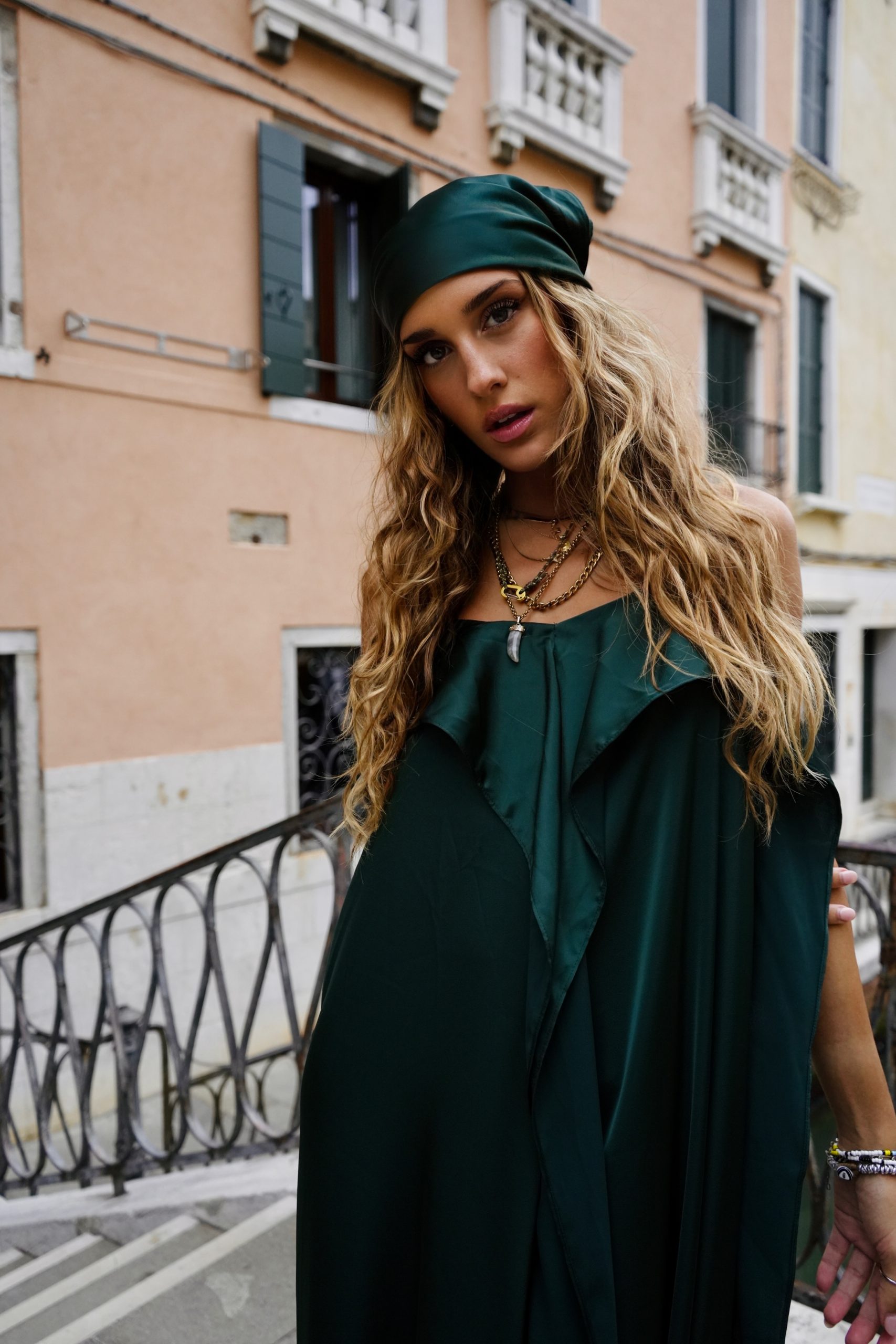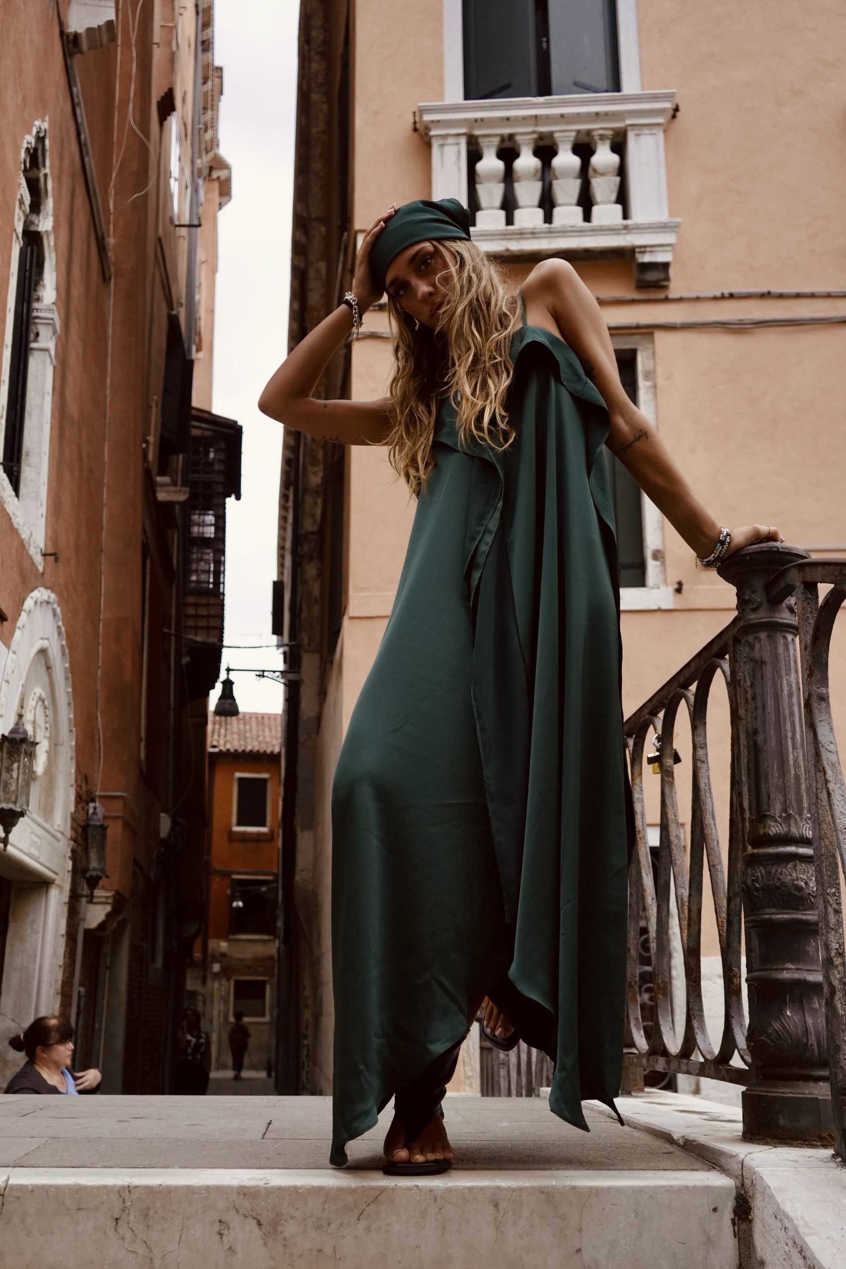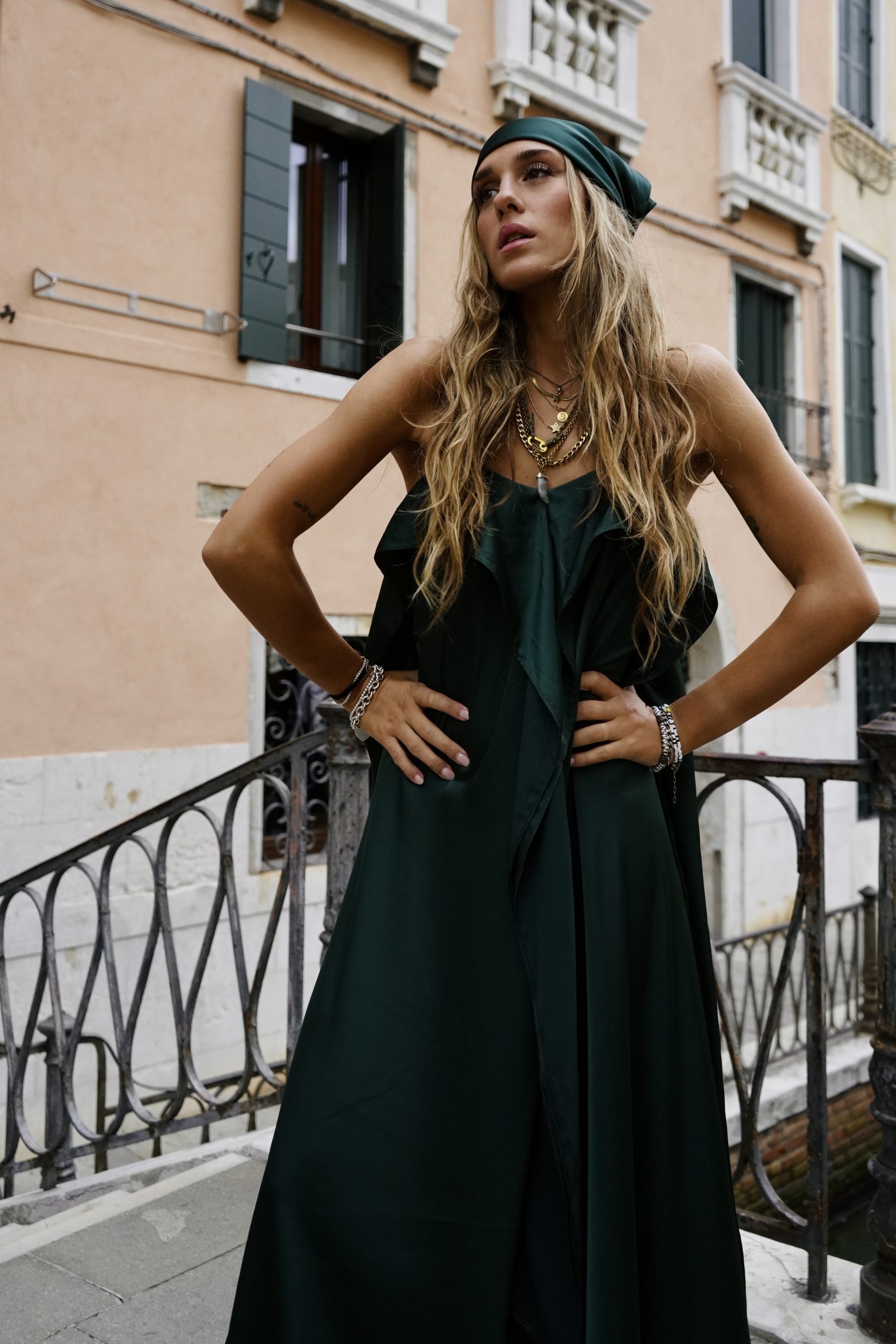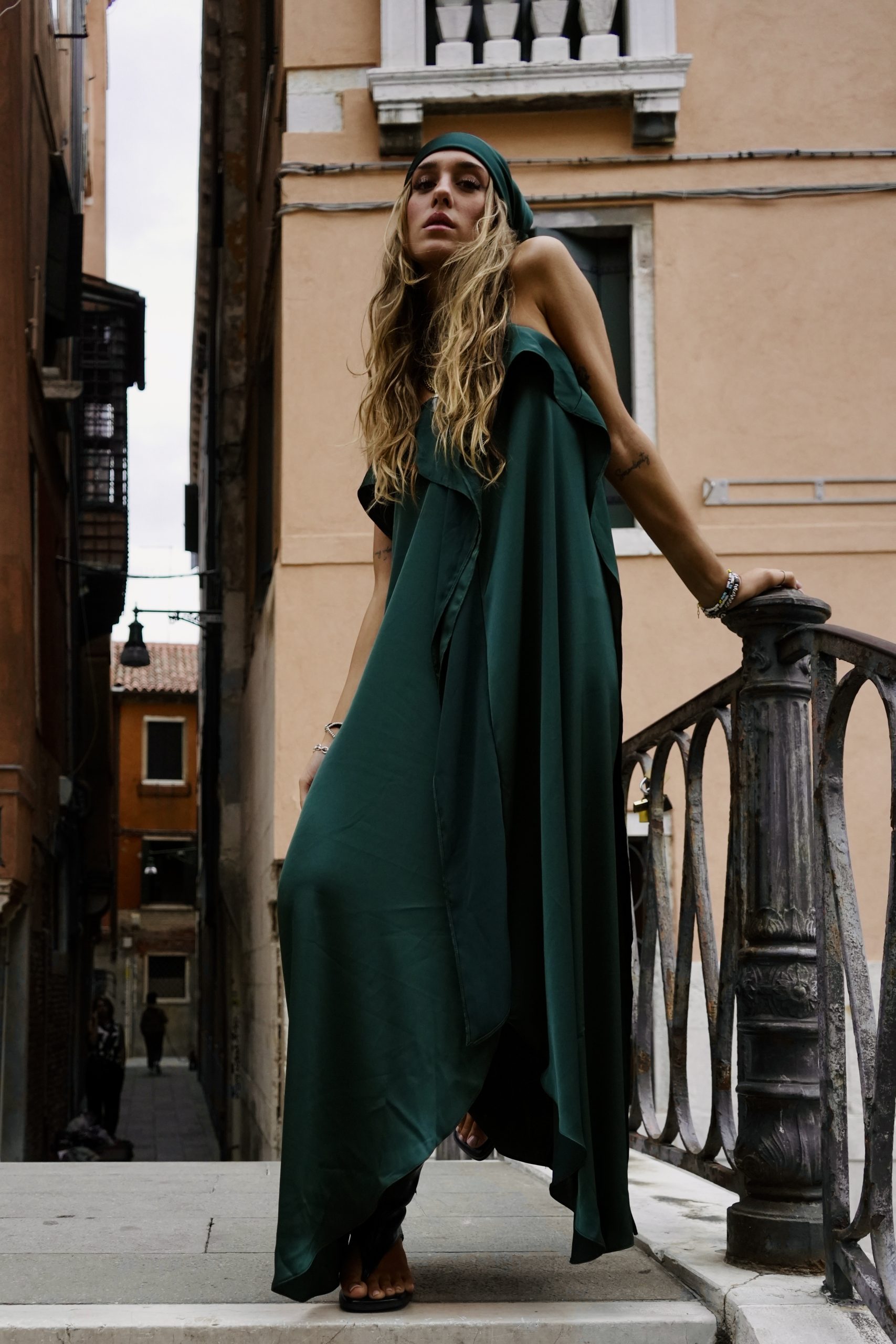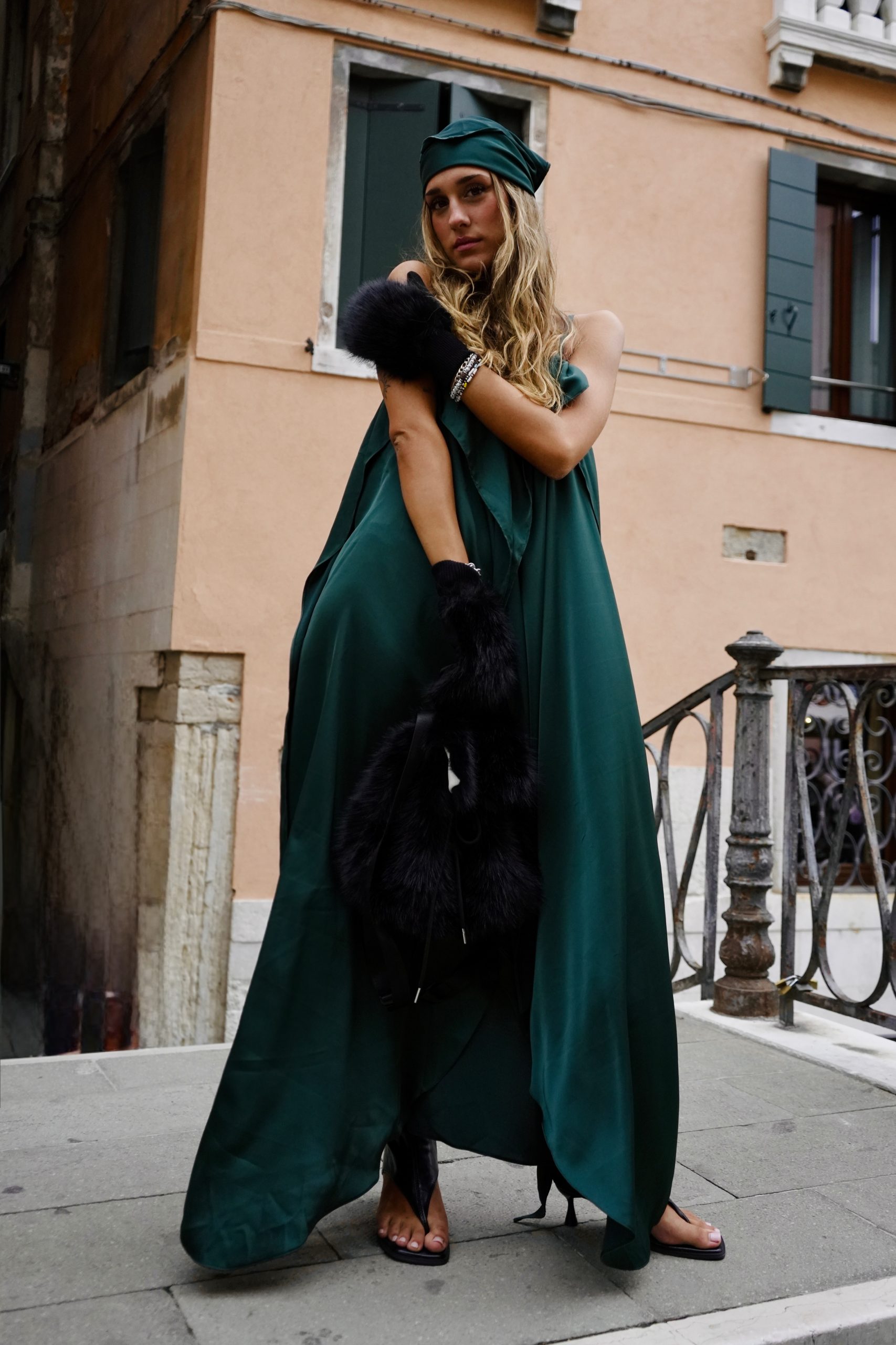 Роклята е изработена от фин сатен с елегантно свободен силует, който пада плавно и създава усещане за лекота и изисканост. Предната част е с двуредна линия, която наподобява ефекта на пелерина и придава допълнителен обем и драматичен шик. В комбинация с палто, този модел се превръща в изключително шикозен и модерен тоалет – едновременно класически и съвременен. Сатенът подчертава блясъка на материята, а цялостната визия е супер актуална и в крак с най-новите тенденции.
