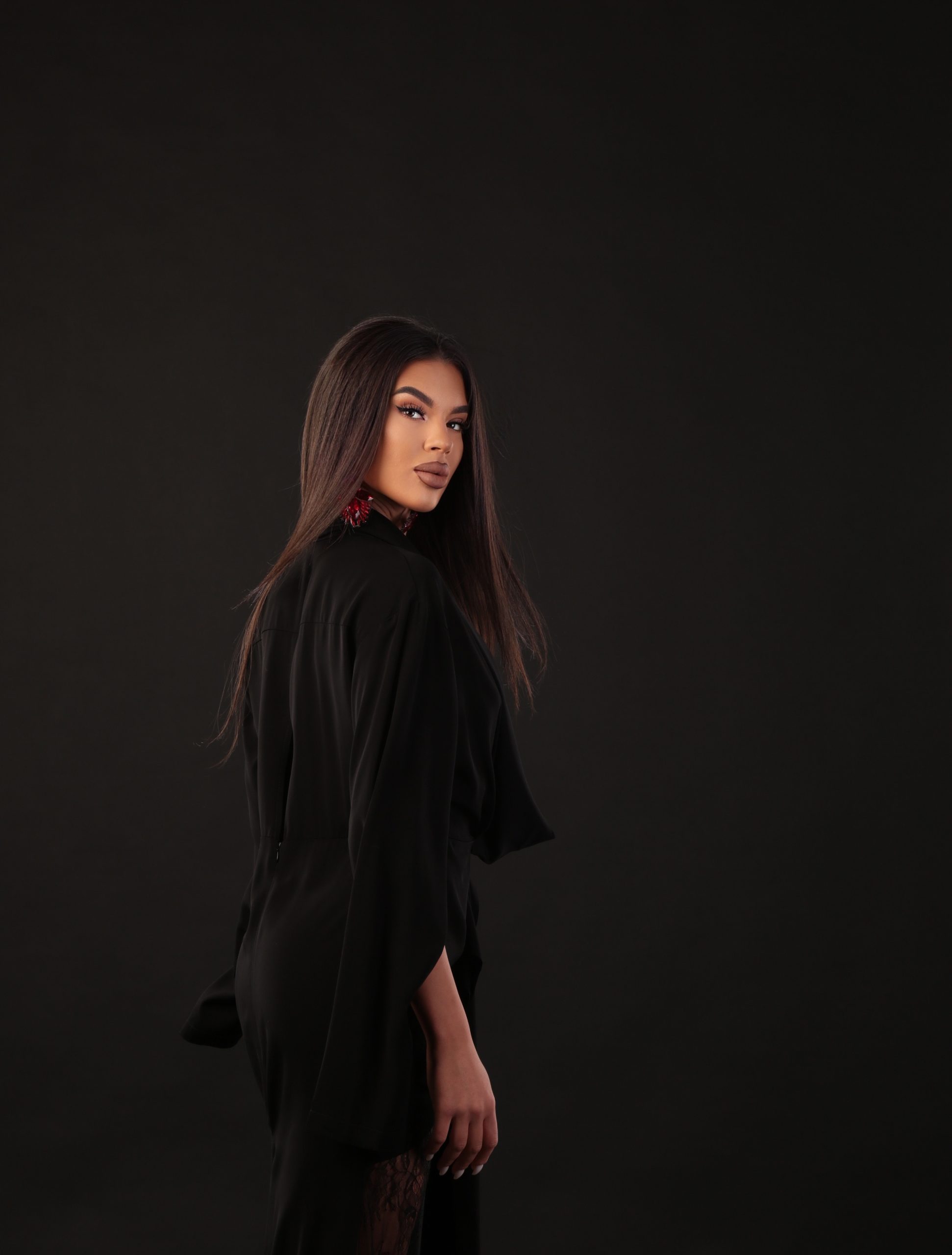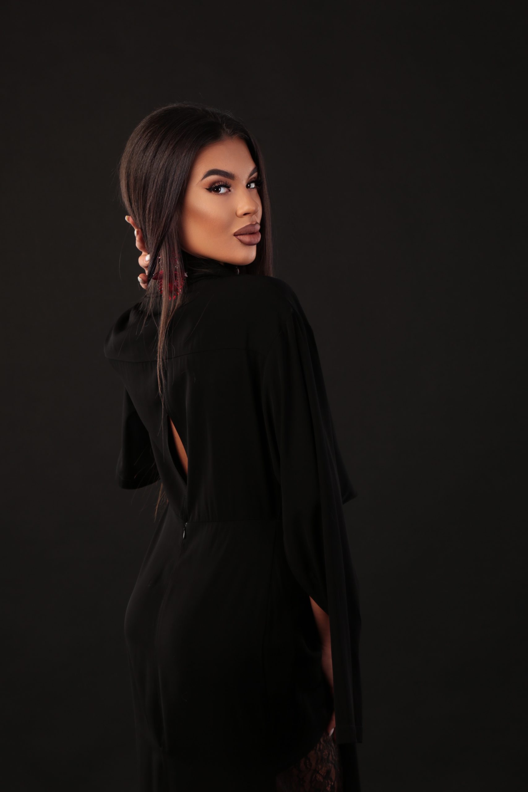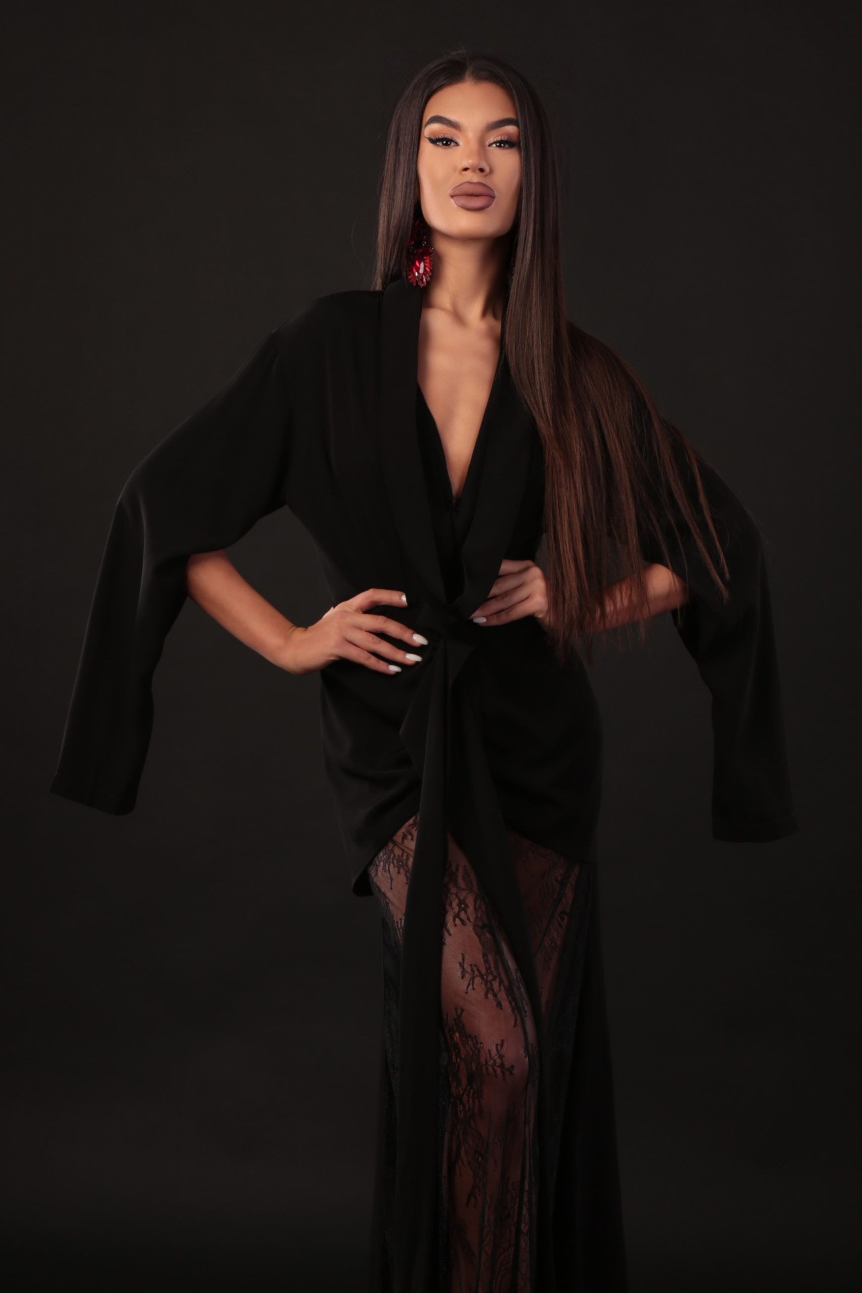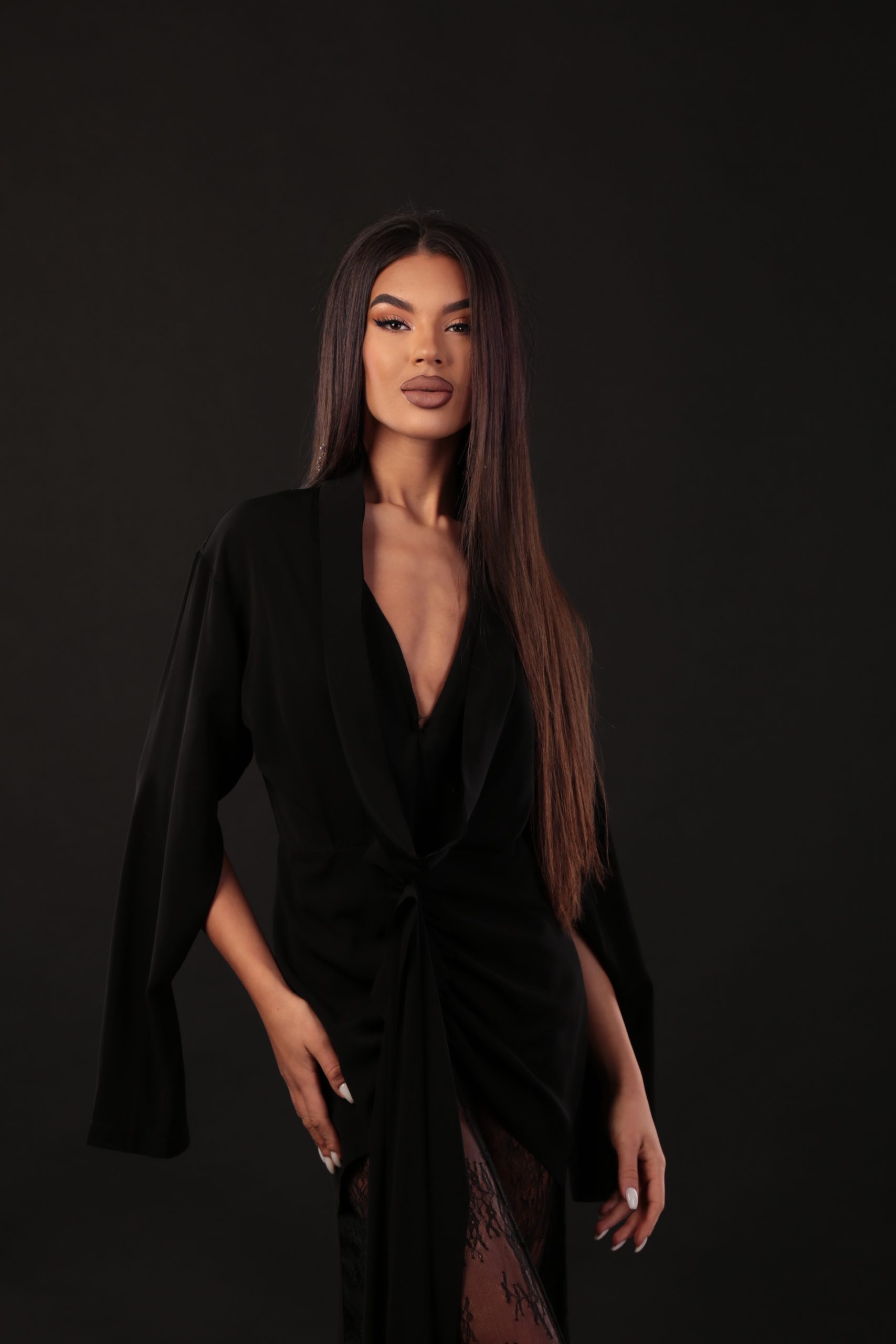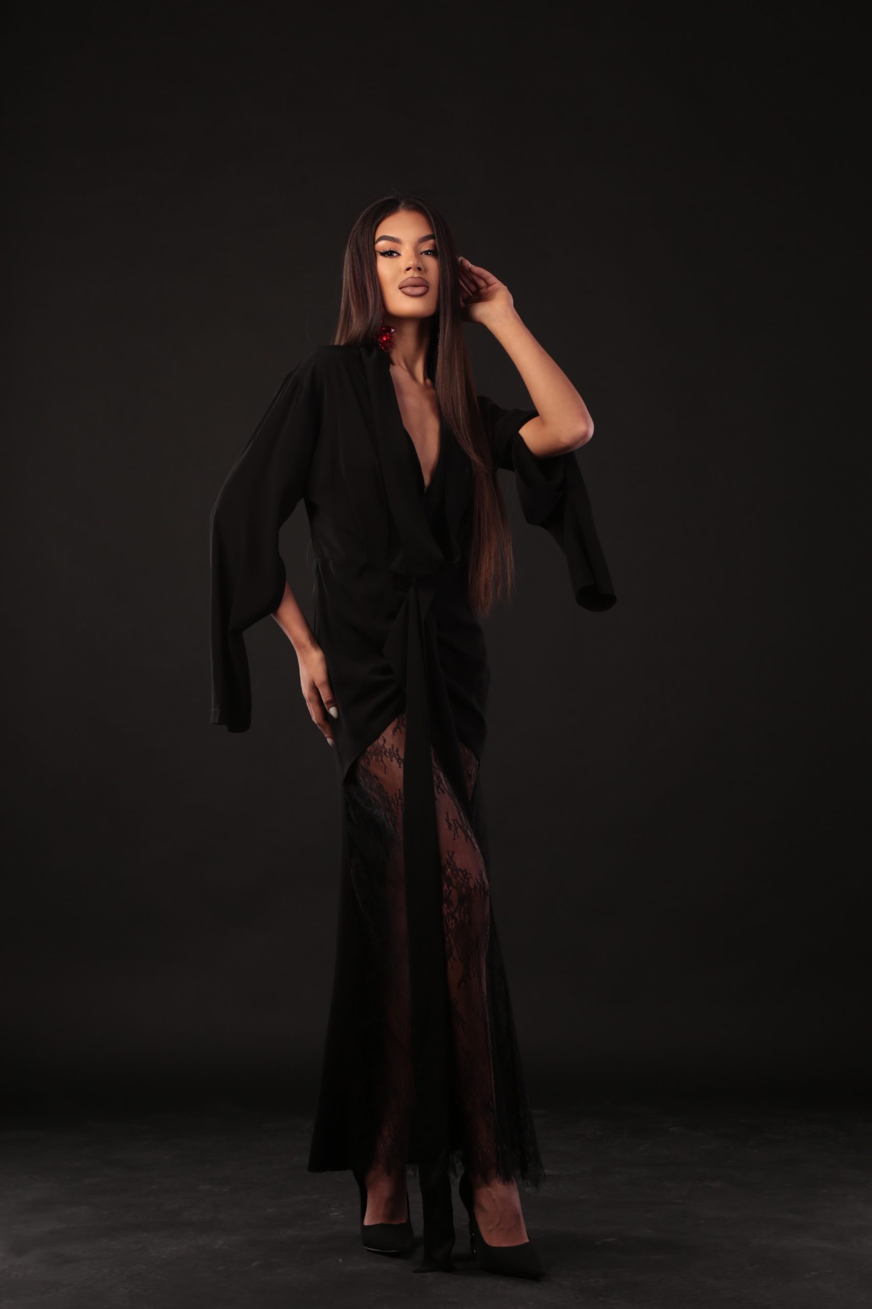Елегантна дълга рокля, създадена да впечатлява с иновативната си кройка и подчертана женственост. Горната част е оформена с кимоно ръкави, които могат да се носят както свободно, така и като класически ръкав с процеп – детайл, който добавя модерност и функционалност. В долната част роклята разкрива деликатна дантела, която придава загадъчност, ефирност и изящен силует при движение. Модел, който съчетава стил, комфорт и дръзка елегантност – идеален за специални събития и запомнящи се вечери.