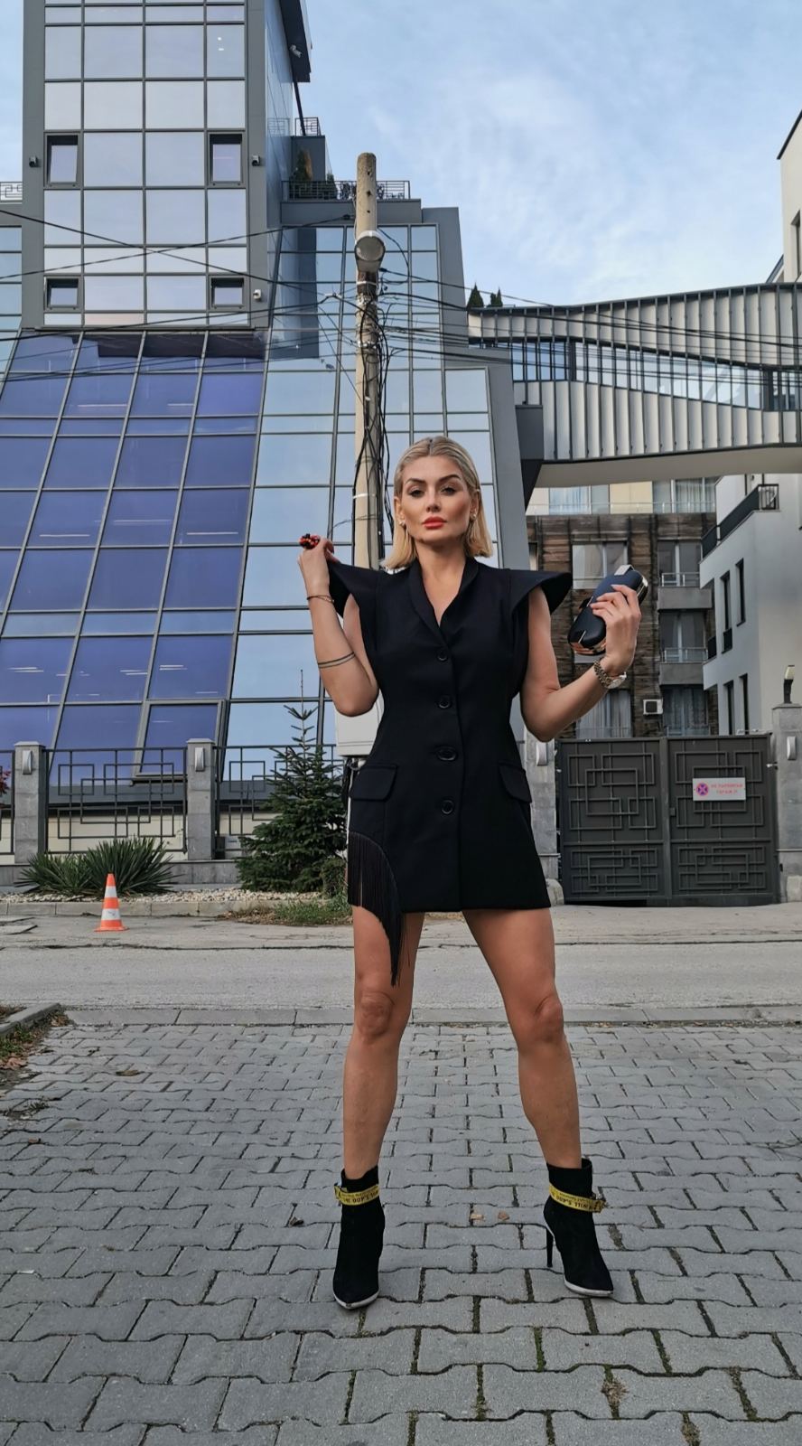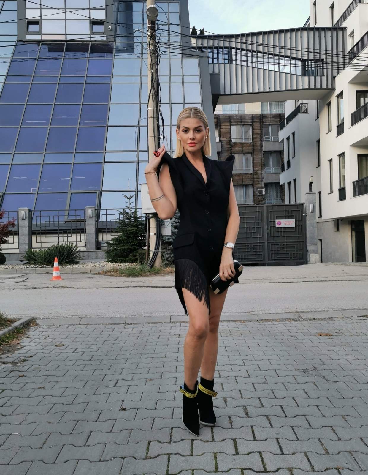 Елегантна рокля тип сако с копчета в предната част, изработена от финна вълна. Широките фианки и закачливите ресни придават на моделът една елегантна и екстравагантна визия.
