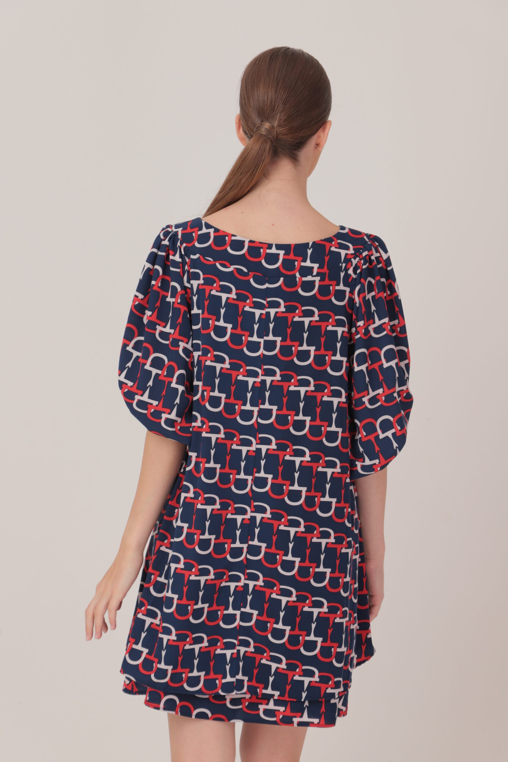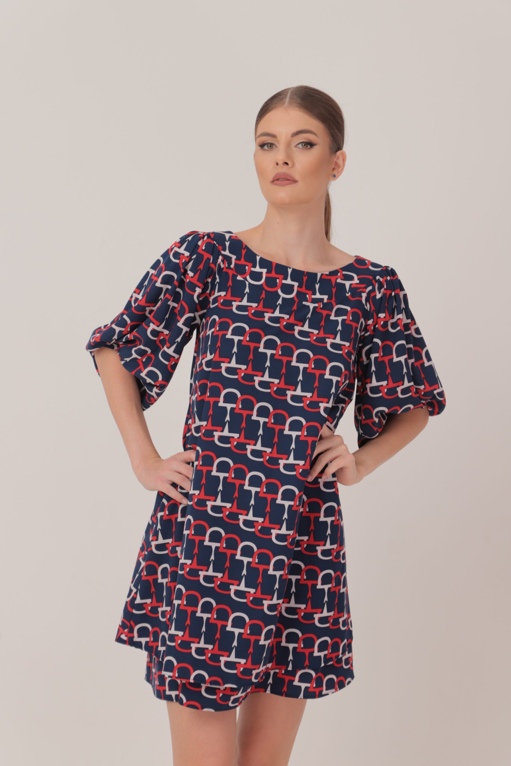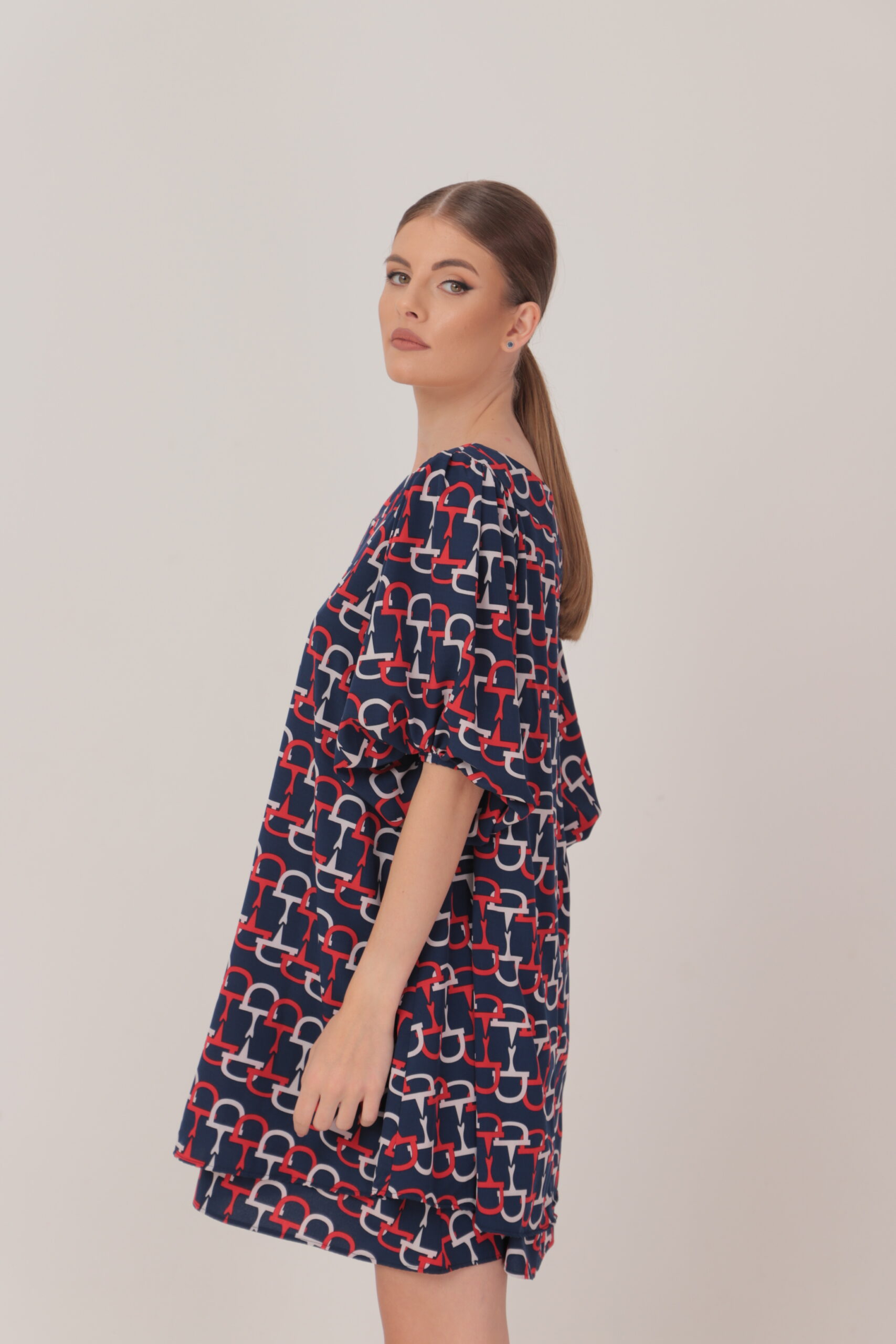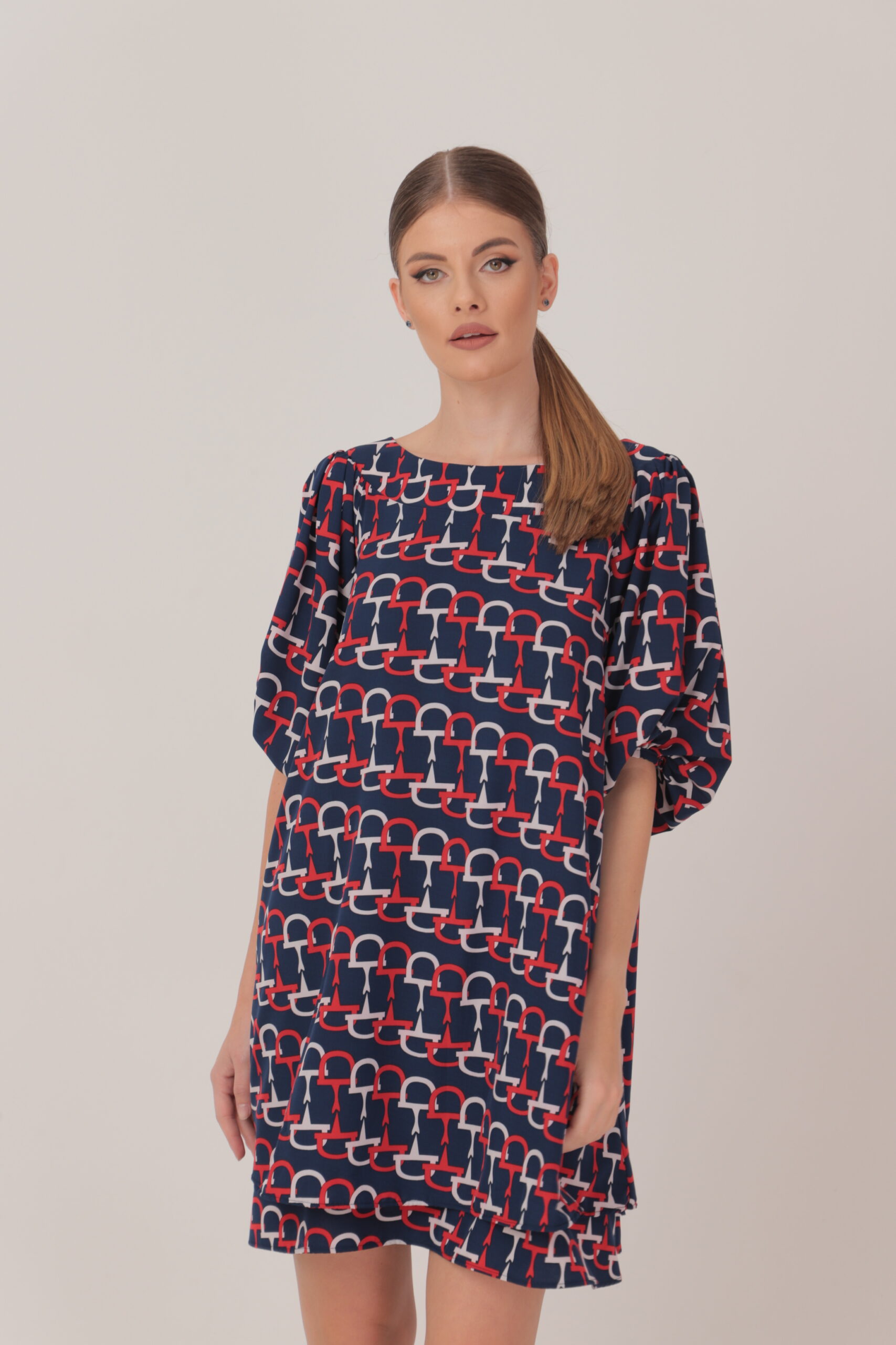 Красива, елегантна и широка рокля от нежен еластичен полиестер в стилен десен с ефектни, широки ръкави.