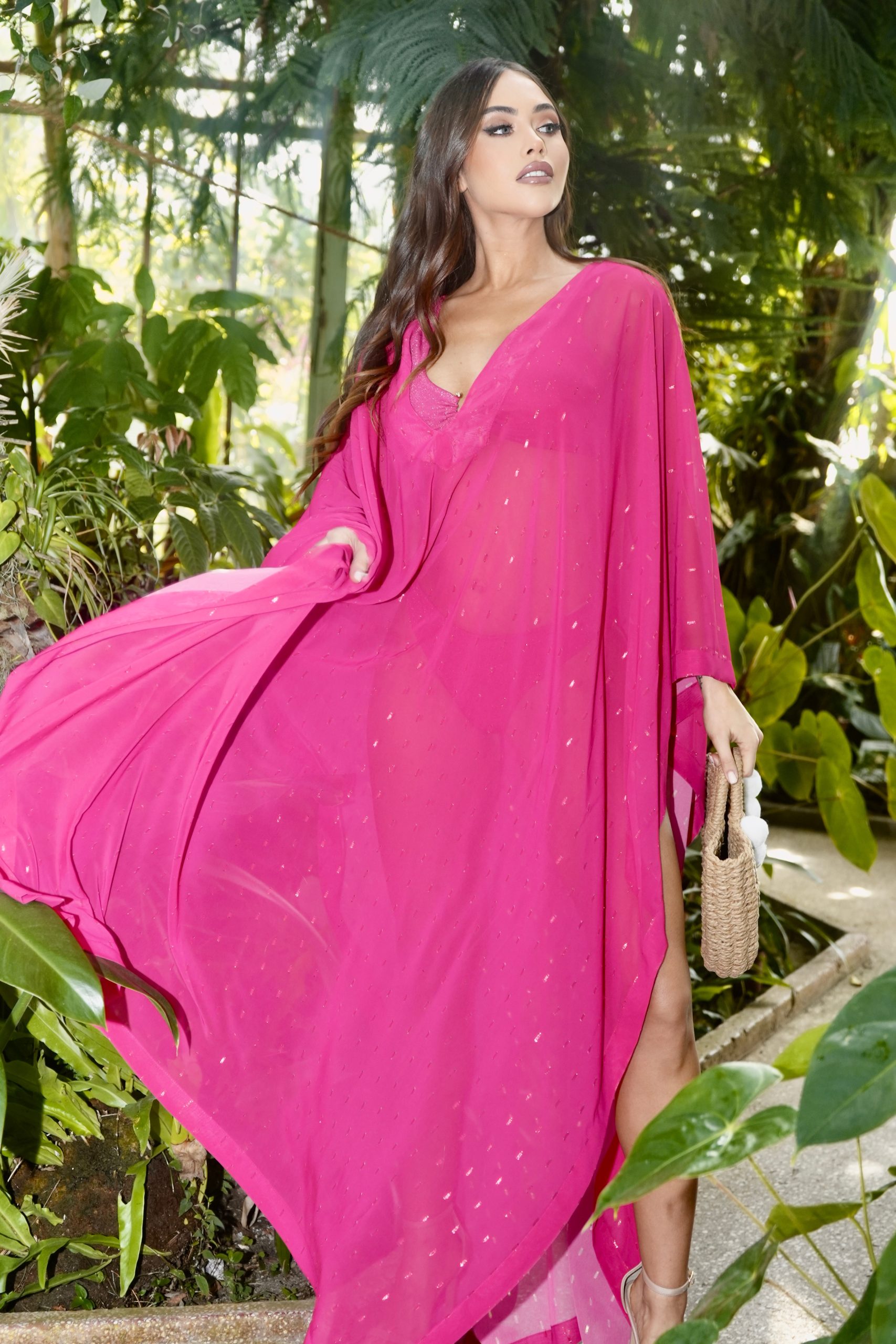 Невероятно ефирна и свободна плажна туника, създадена да впечатлява със своята лекота и изразителен силует. Моделът е изработен от фин, прозрачен шифон в наситен и дълбок циклама цвят, който придава изключително стилно и елегантно излъчване.