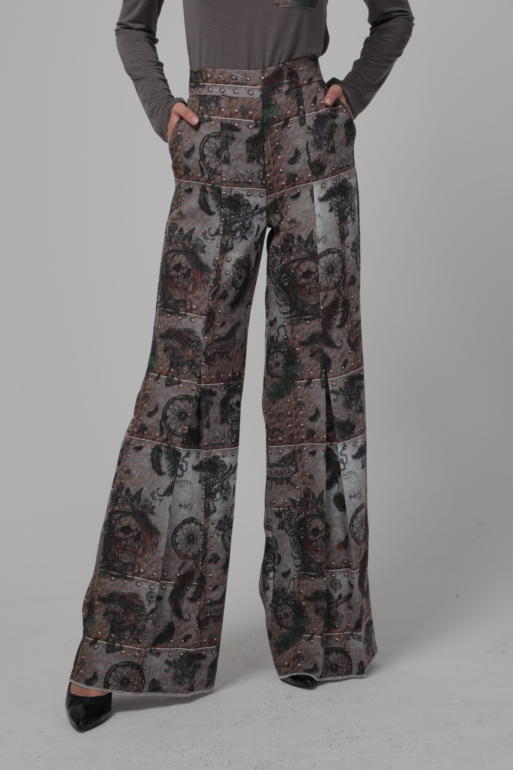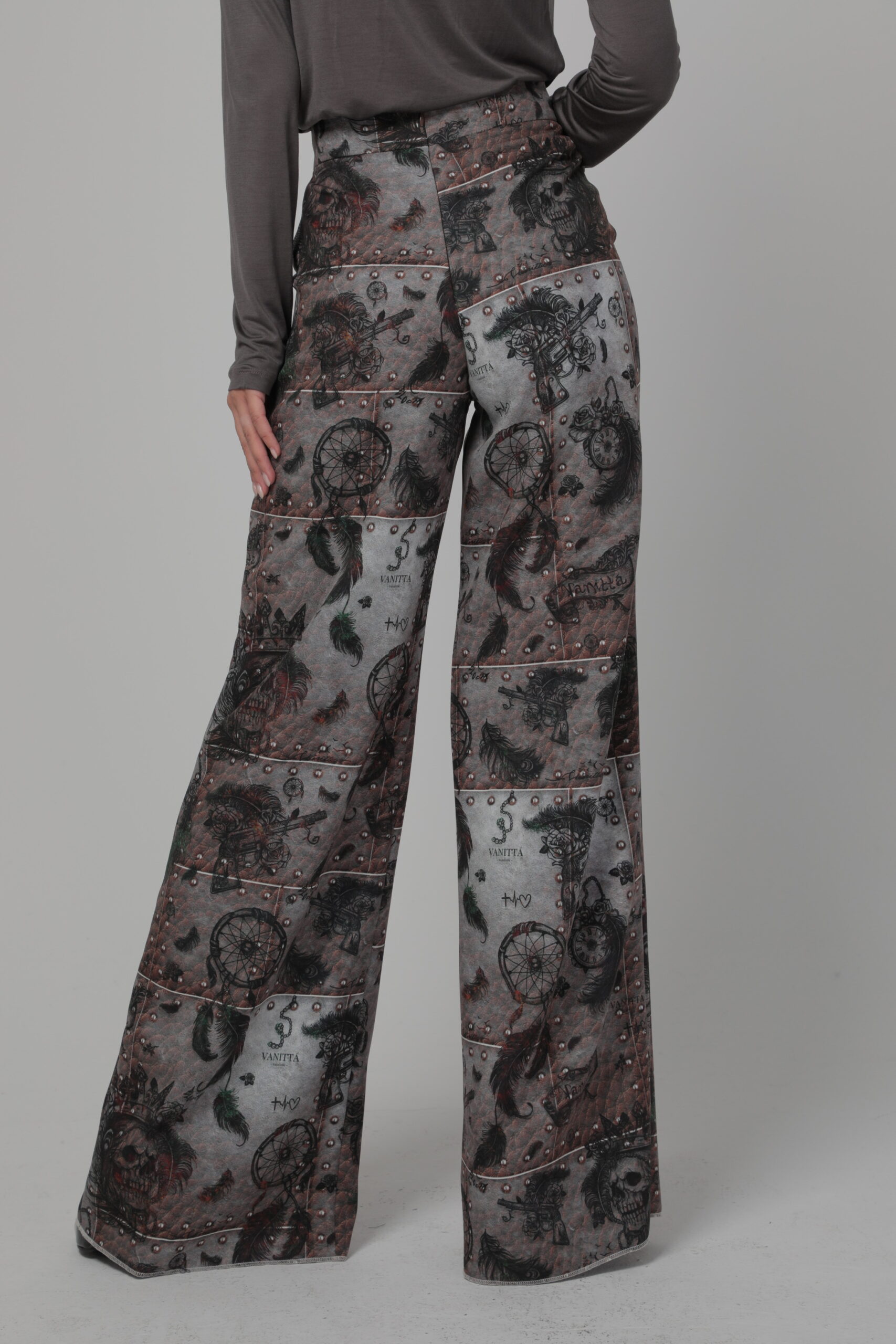 Елегантен дамски панталон, изработен от красив дизайнерски десен. Прав силует с широки крачоли, цип в задната част. Панталона е с висока талия и свободен силует.