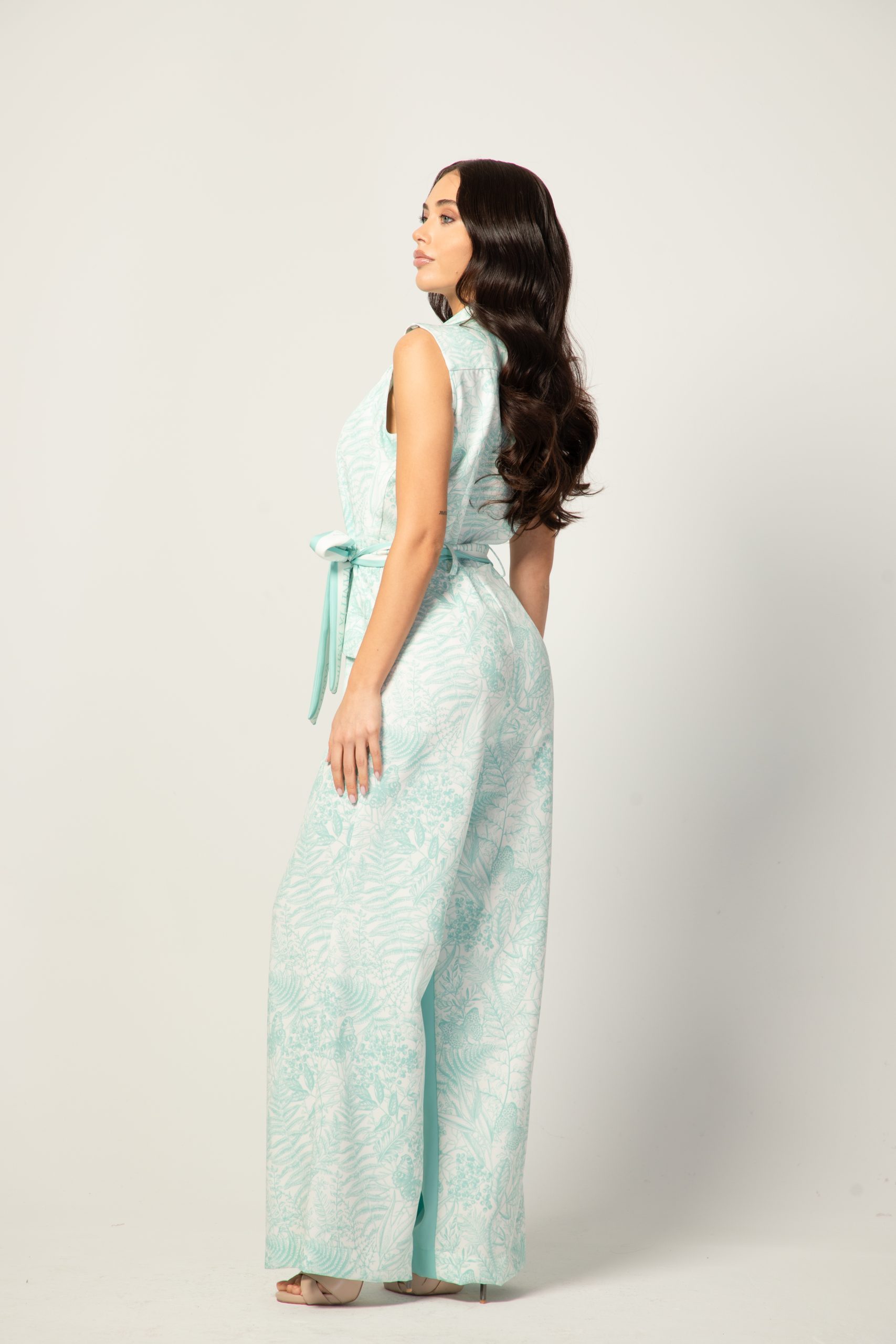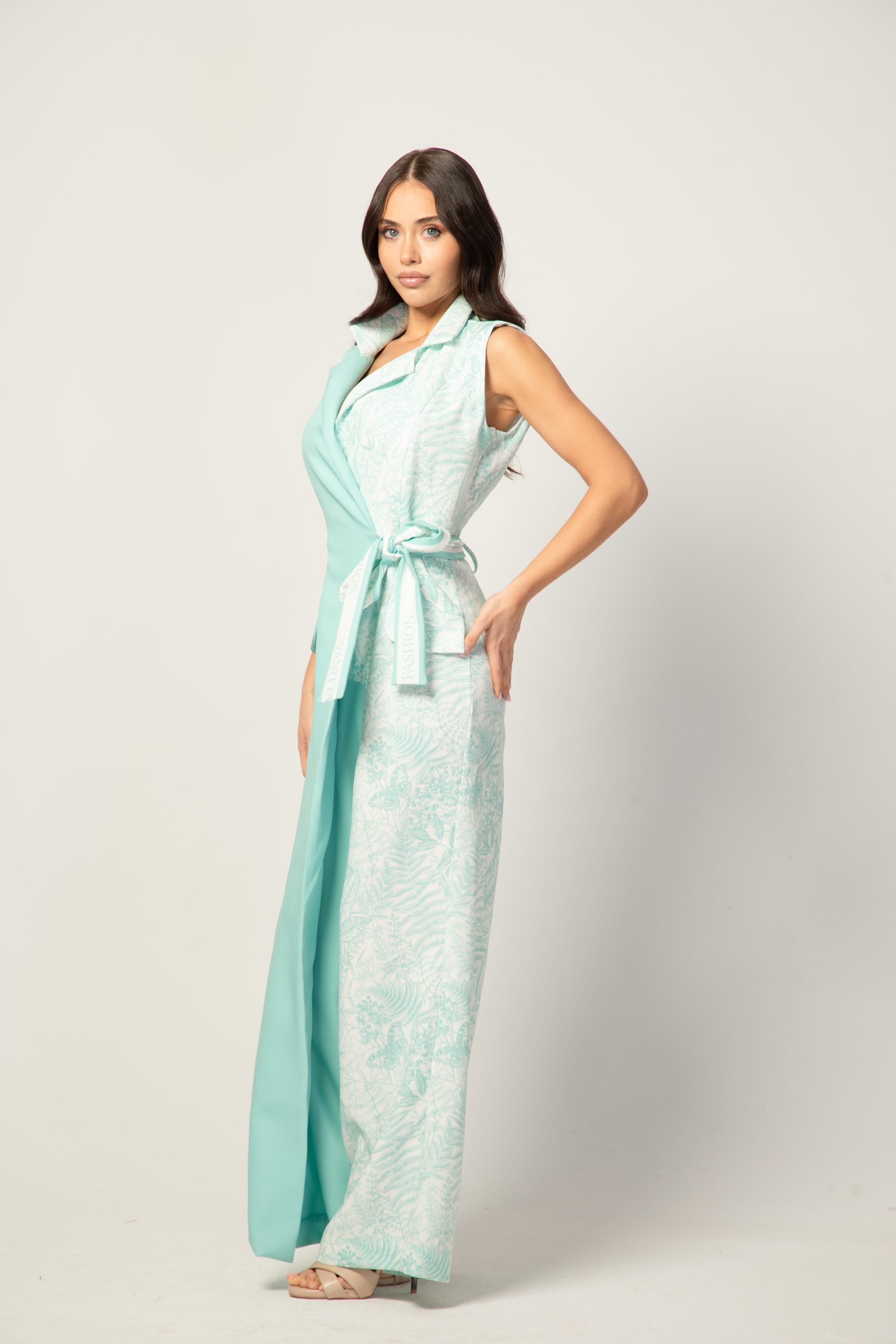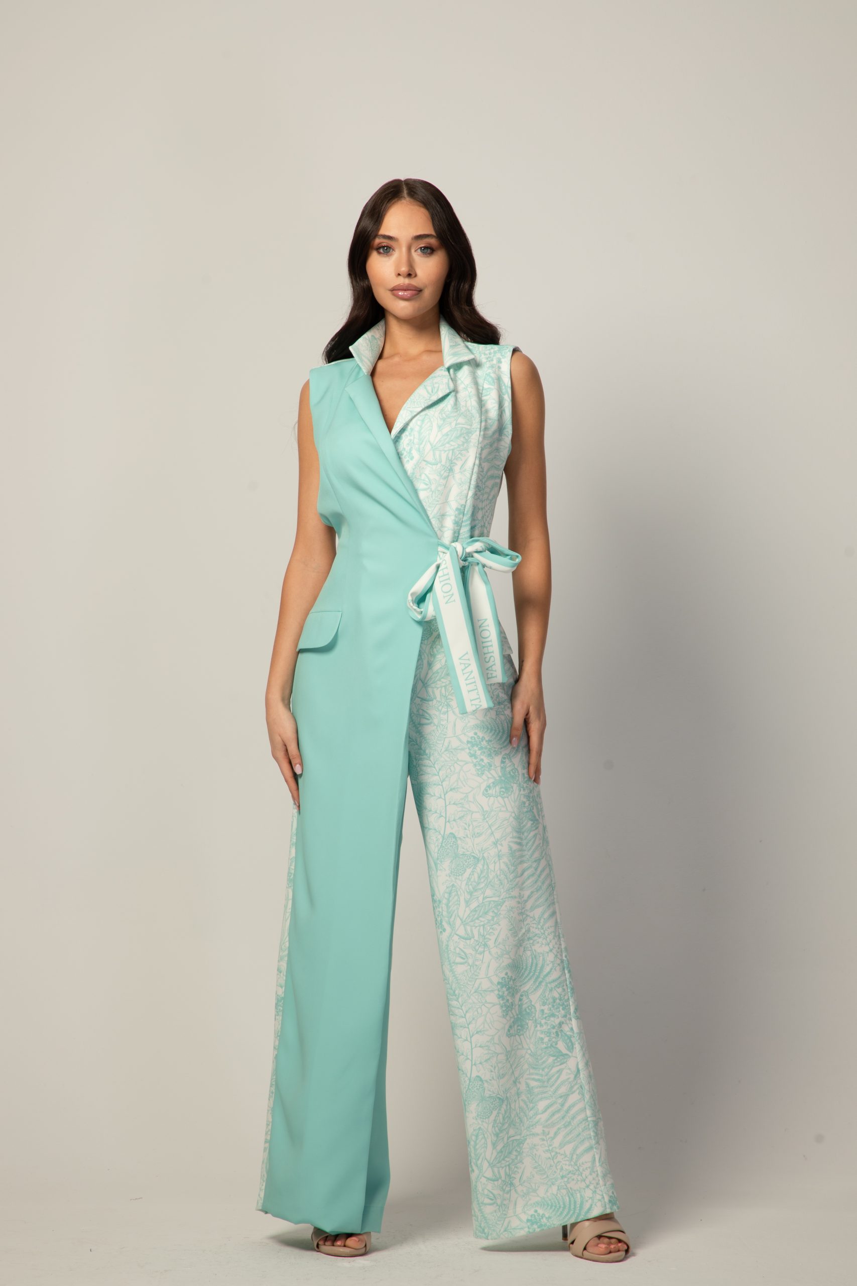 Горната част на гащеризона е с изискан ревер, който добавя структура и акцент към деколтето. Кройката „прегърни ме“ е нежна и женствена, създава визуален ефект на препокриване, подчертавайки талията и оформяйки красиво деколте.