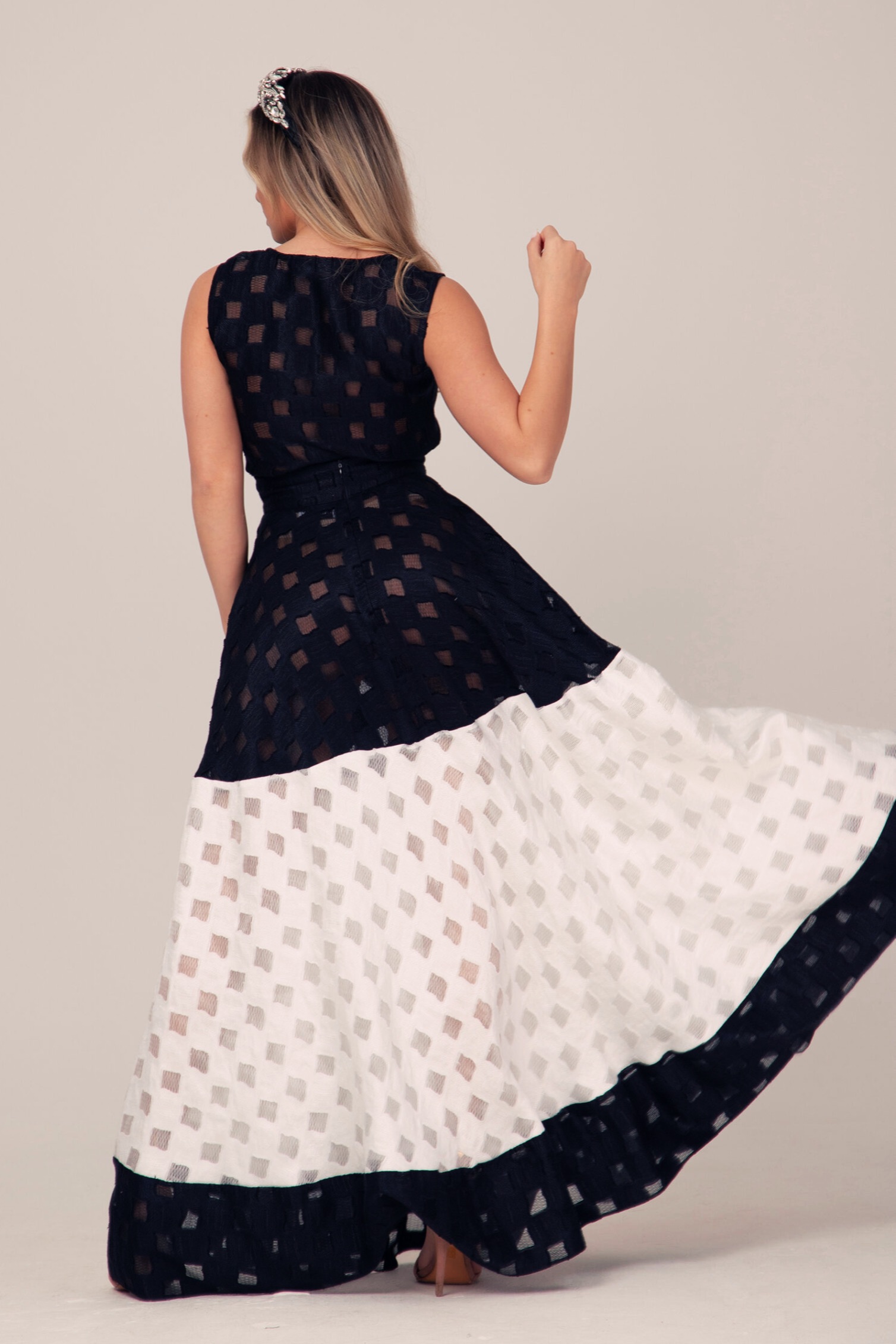 Горната част е изпълнена в дълбок черен цвят, с фина полупрозрачна текстура и геометричен мотив, който добавя лекота и стилна доза загадъчност. Долната част контрастира в светъл нюанс, също с деликатен геометричен десен, като удължената асиметрична линия създава издължен силует и визуален акцент.