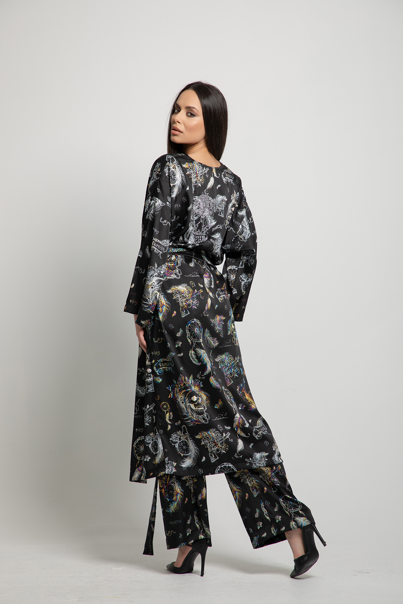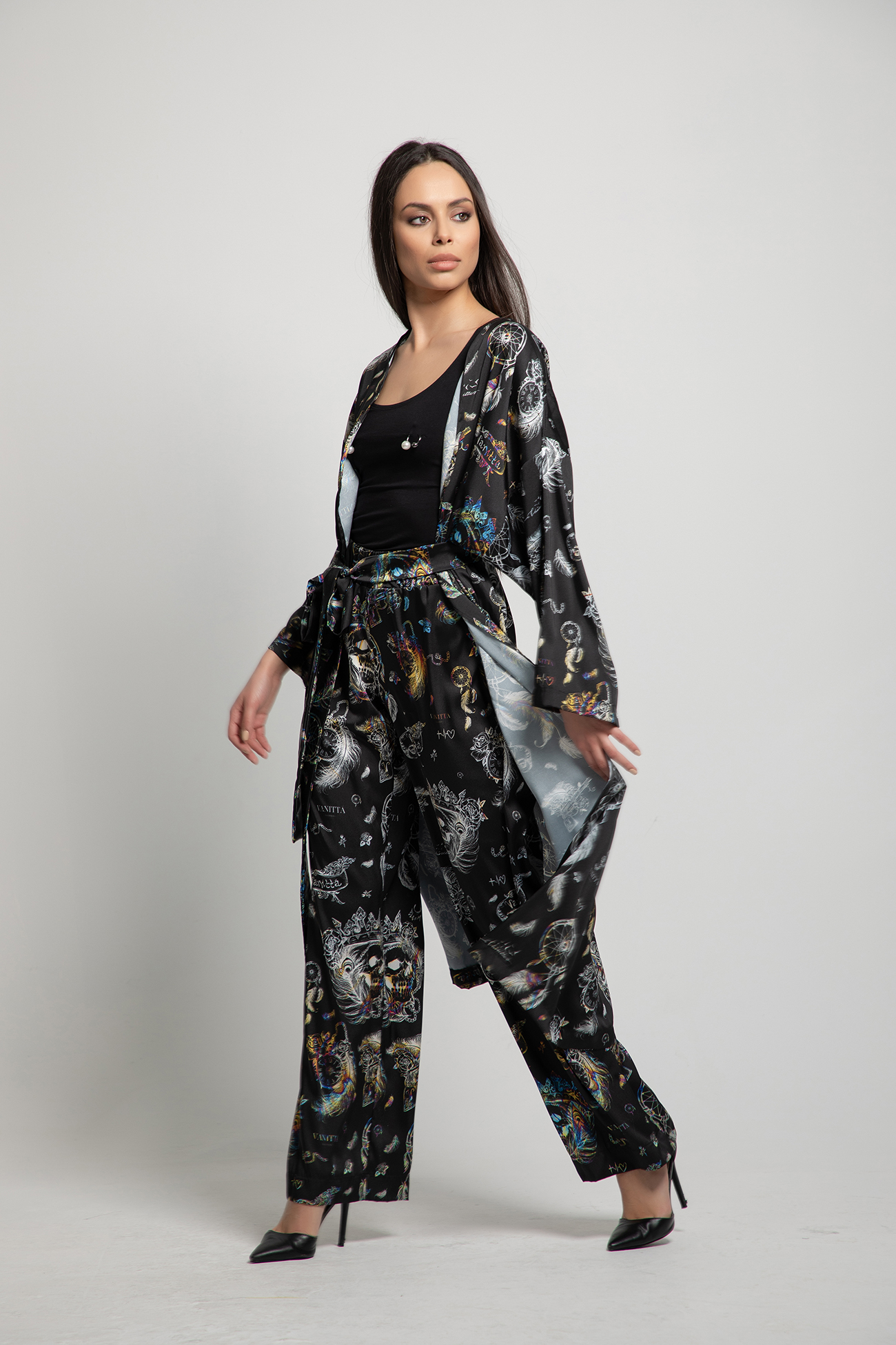 Кимоното е със свободен прав силует, панталонът е с прав крачол и ластик в талията.
