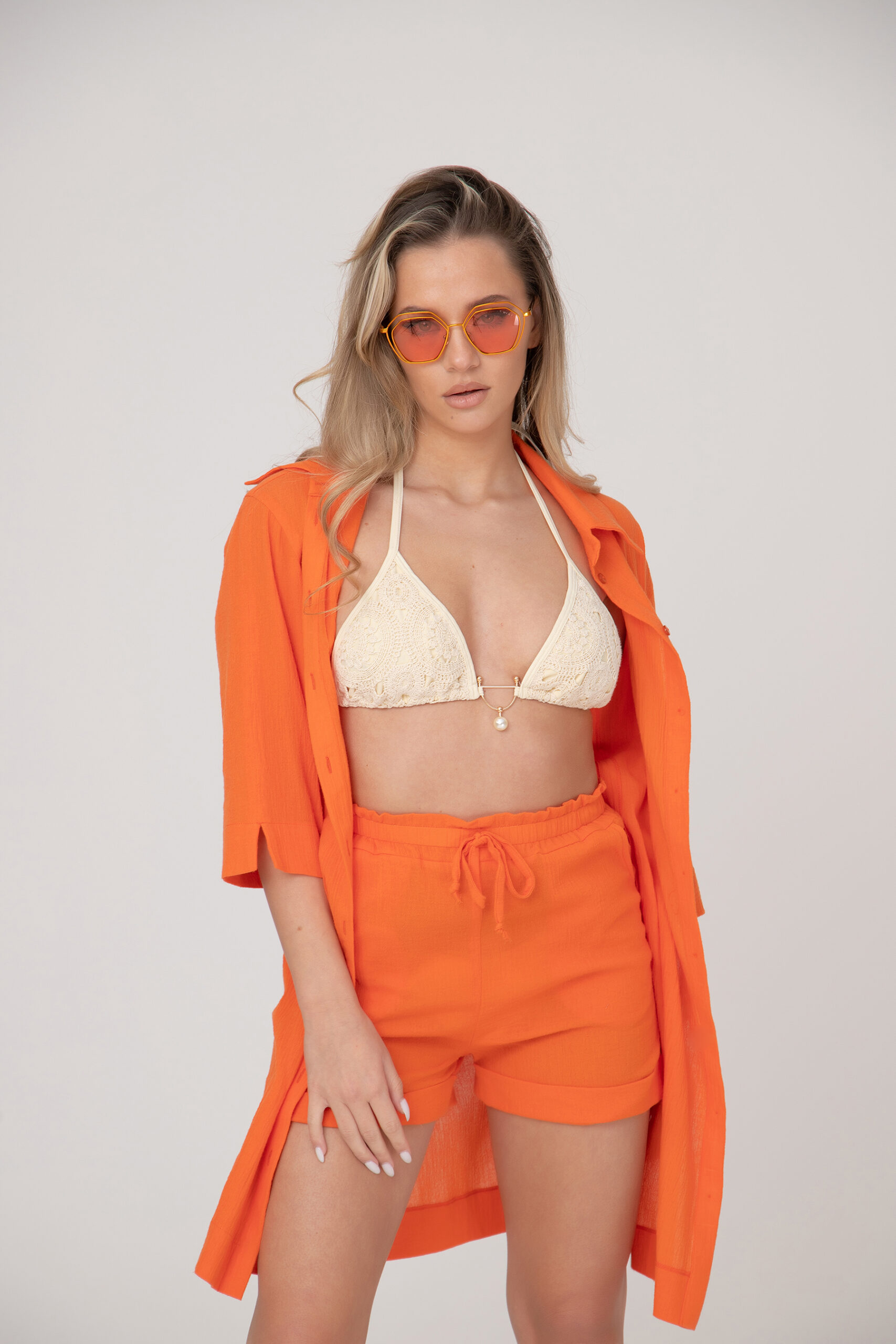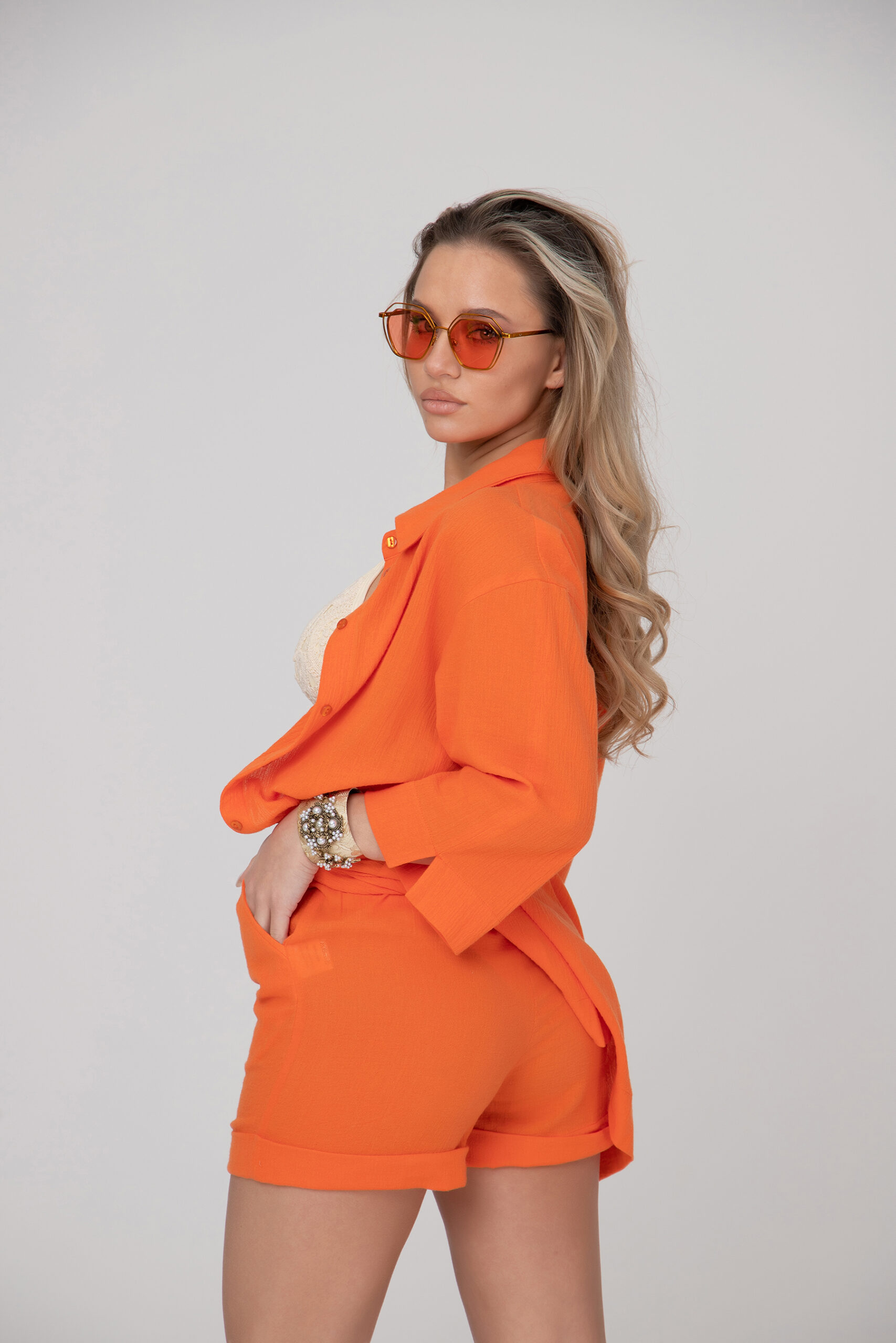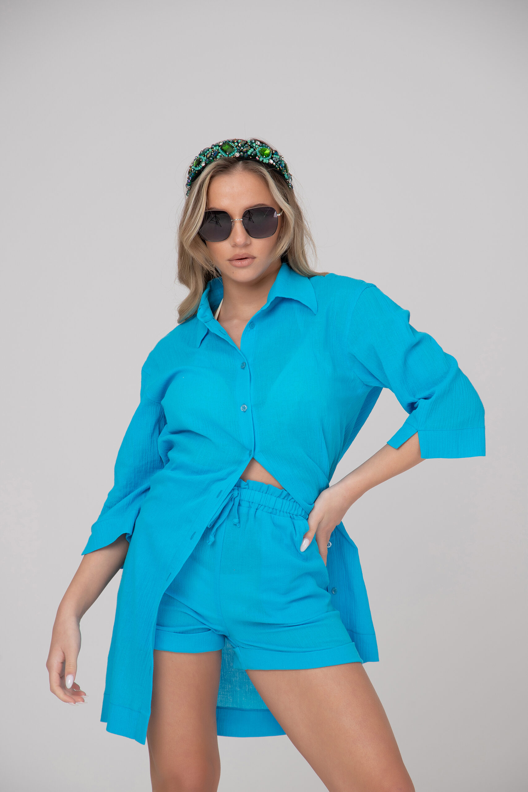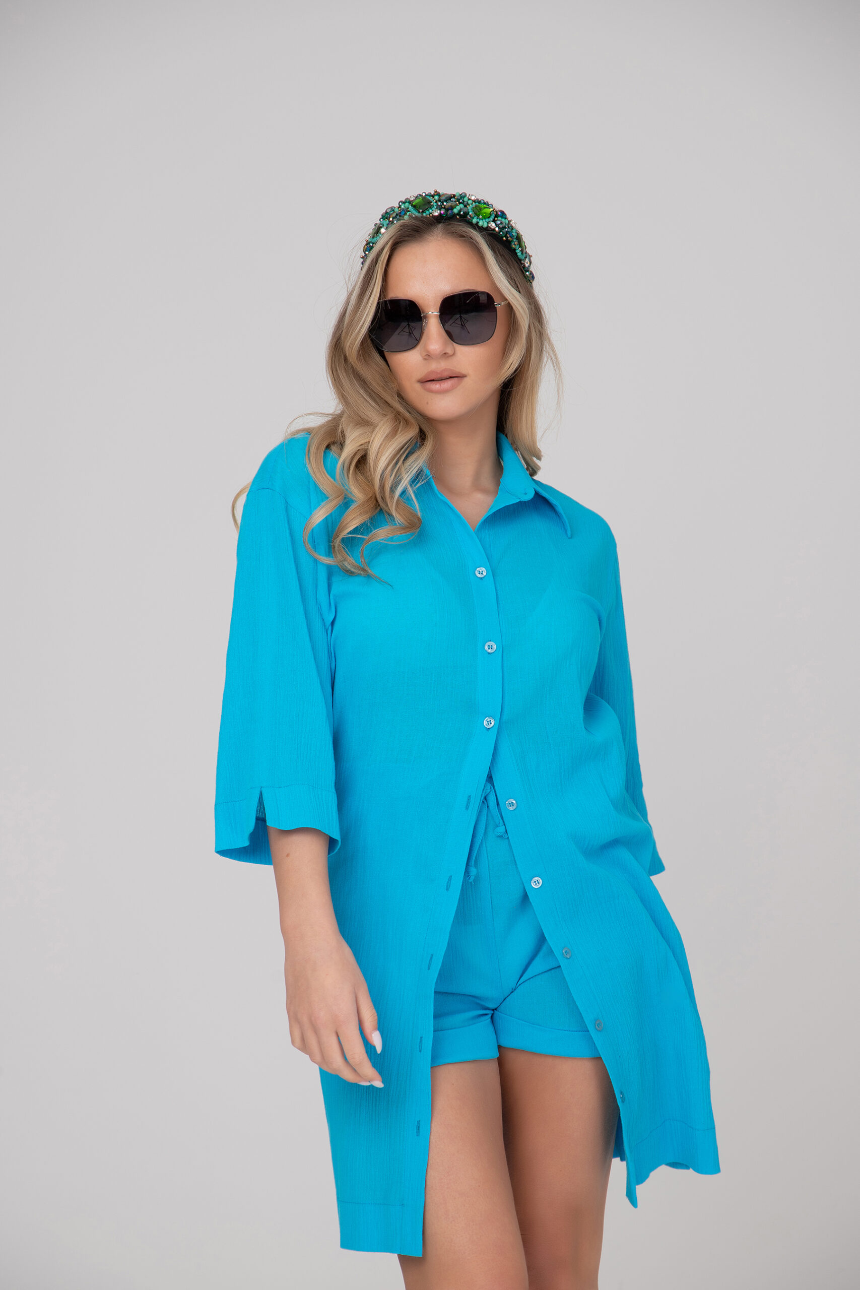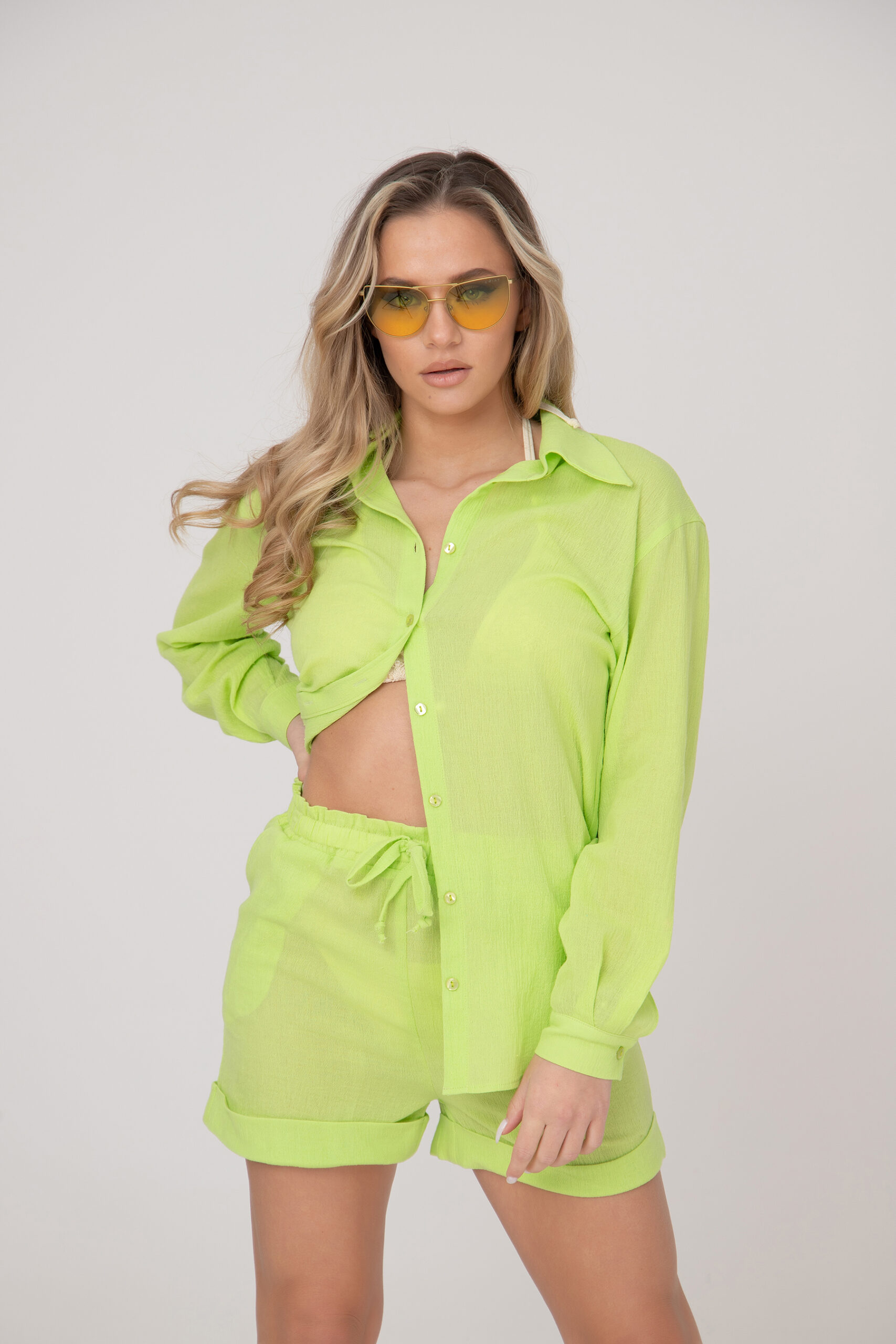 Дамски кенарен комплект в две части. Класическа риза с 7/8 широк ръкав с цепки и прав удължен силует, панталонките са къси с ластик на талията. Комплектът се предлага в наситени и свежа цветна гама.
