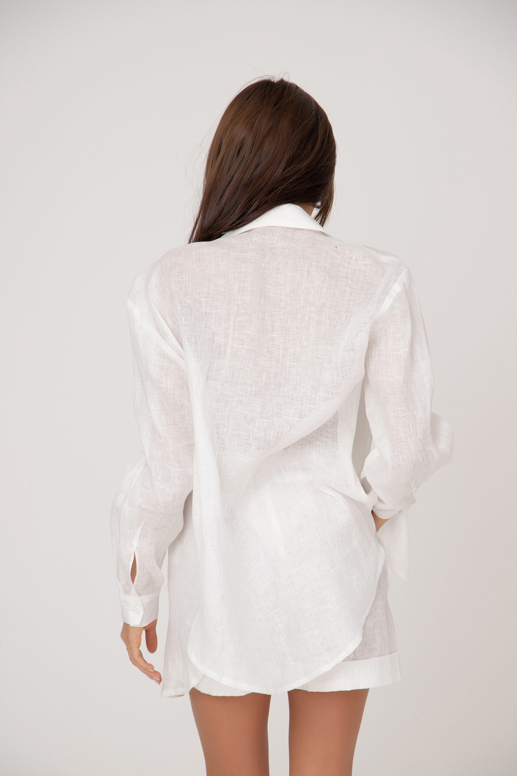 Нежен, транспарентен дамски ленен комплект в две части. Класическа риза с платка и прав силует и къси панталонки с ластик на талията.