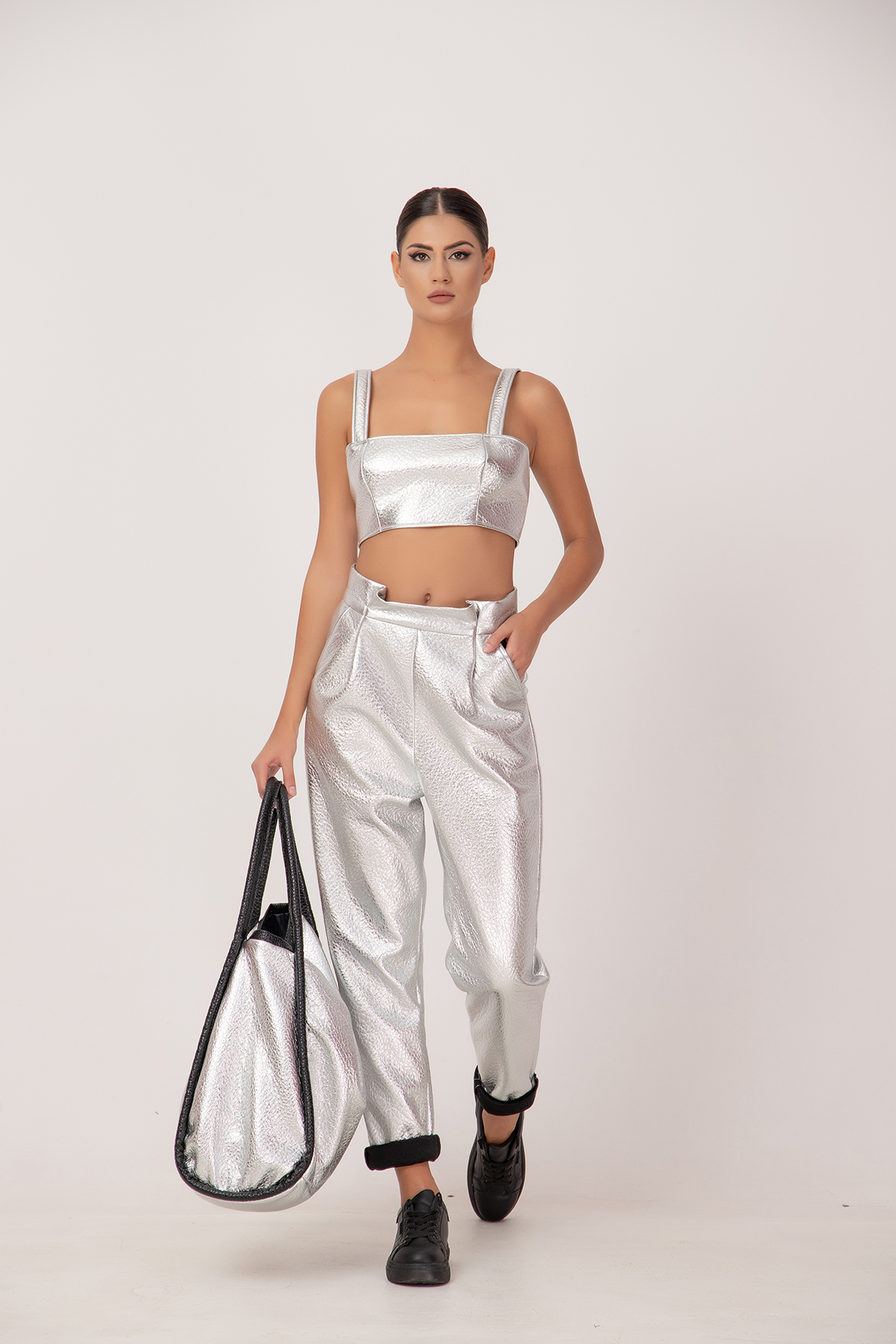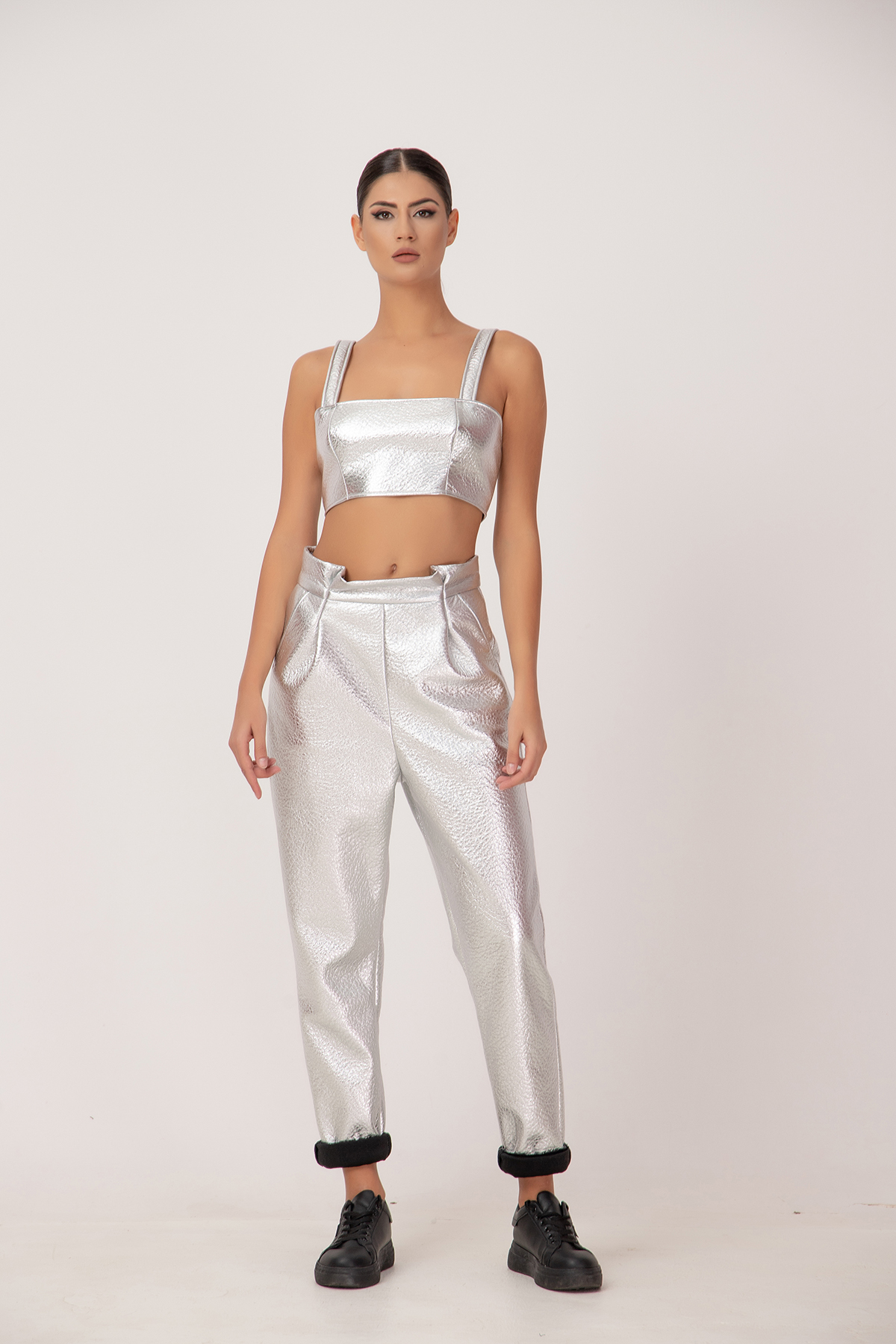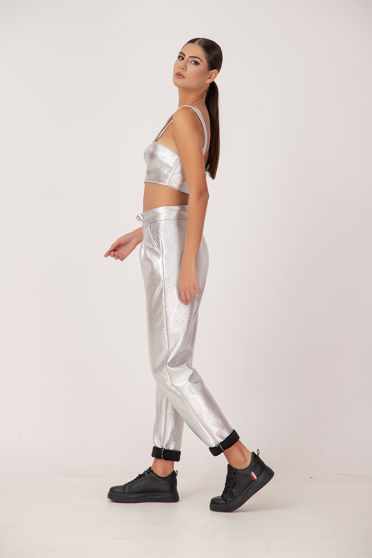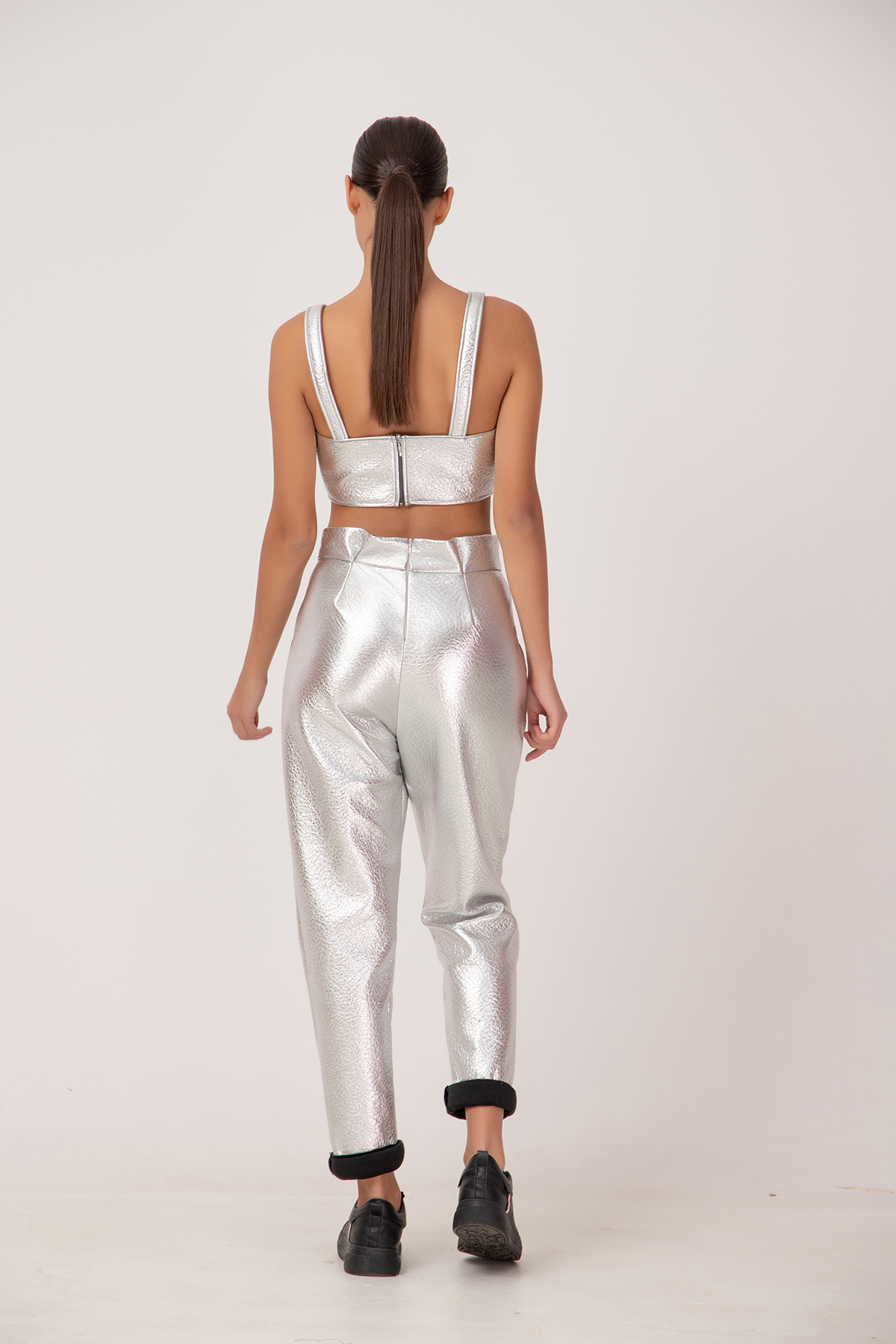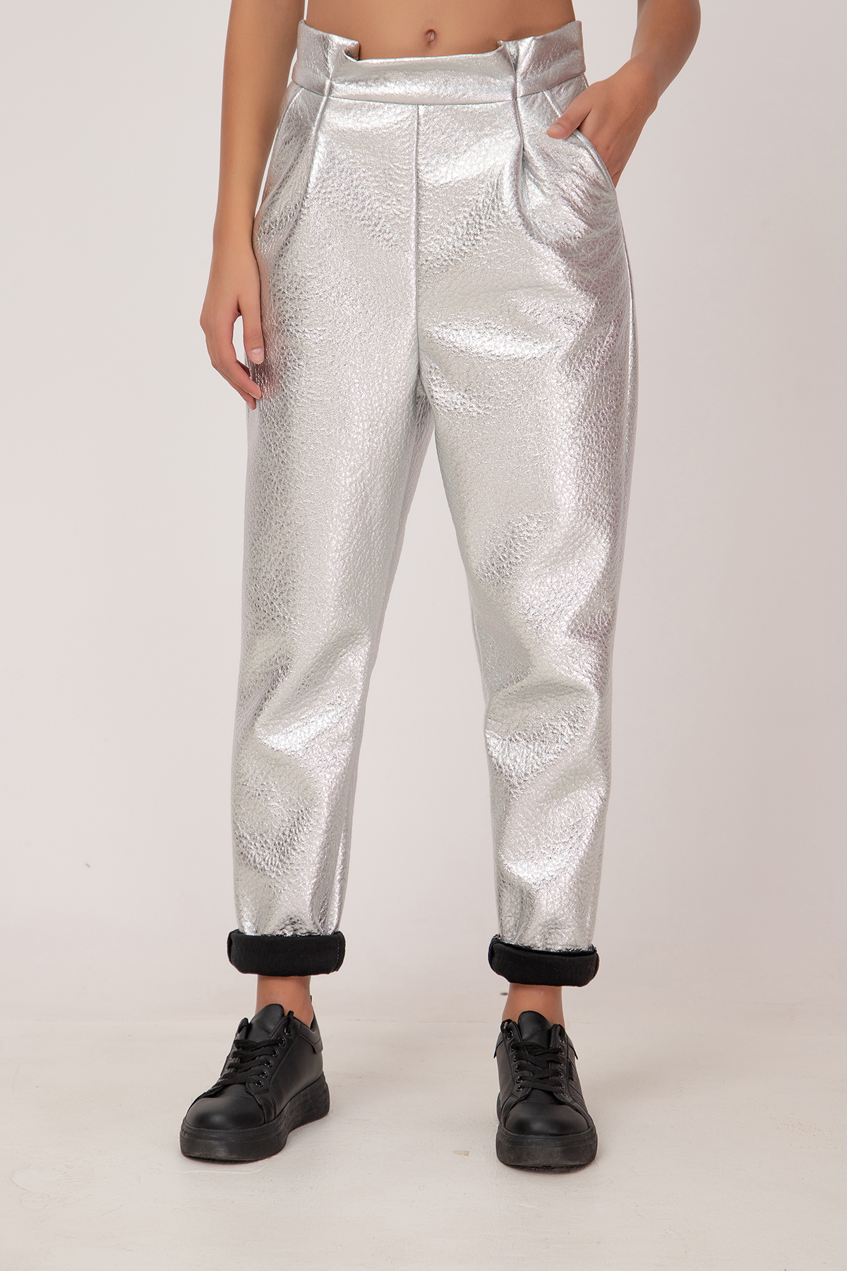 Сребърен панталон с неопреново подплатена кожа със сребрист слой. Панталонът е с висока талия и цип в предната част.