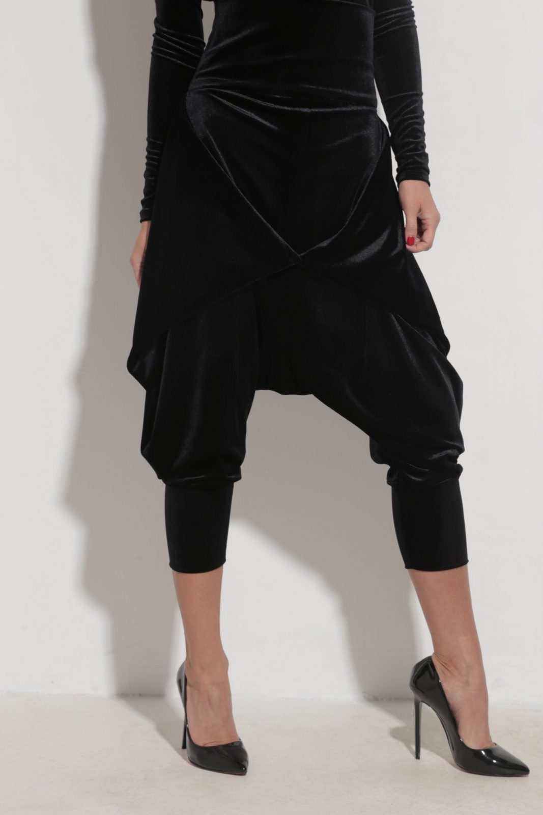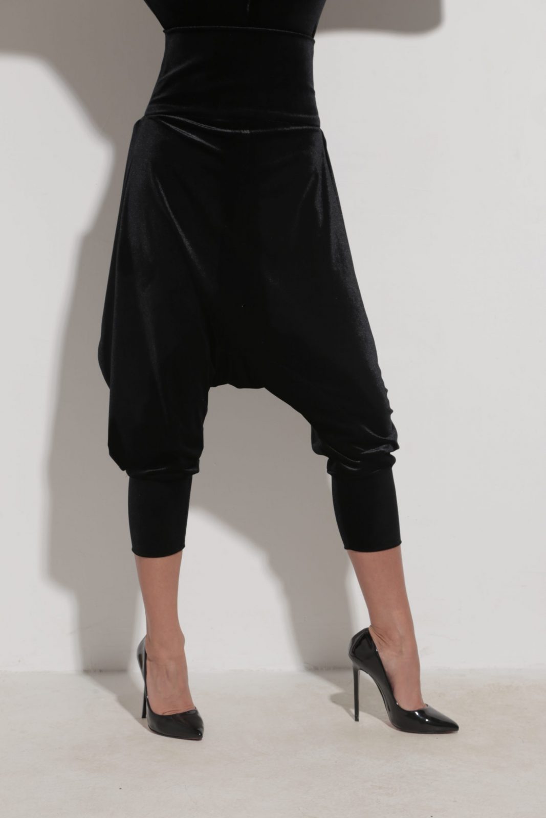 Дамски панталон тип потур със 7/8 крачоли, изработен от кадифе.