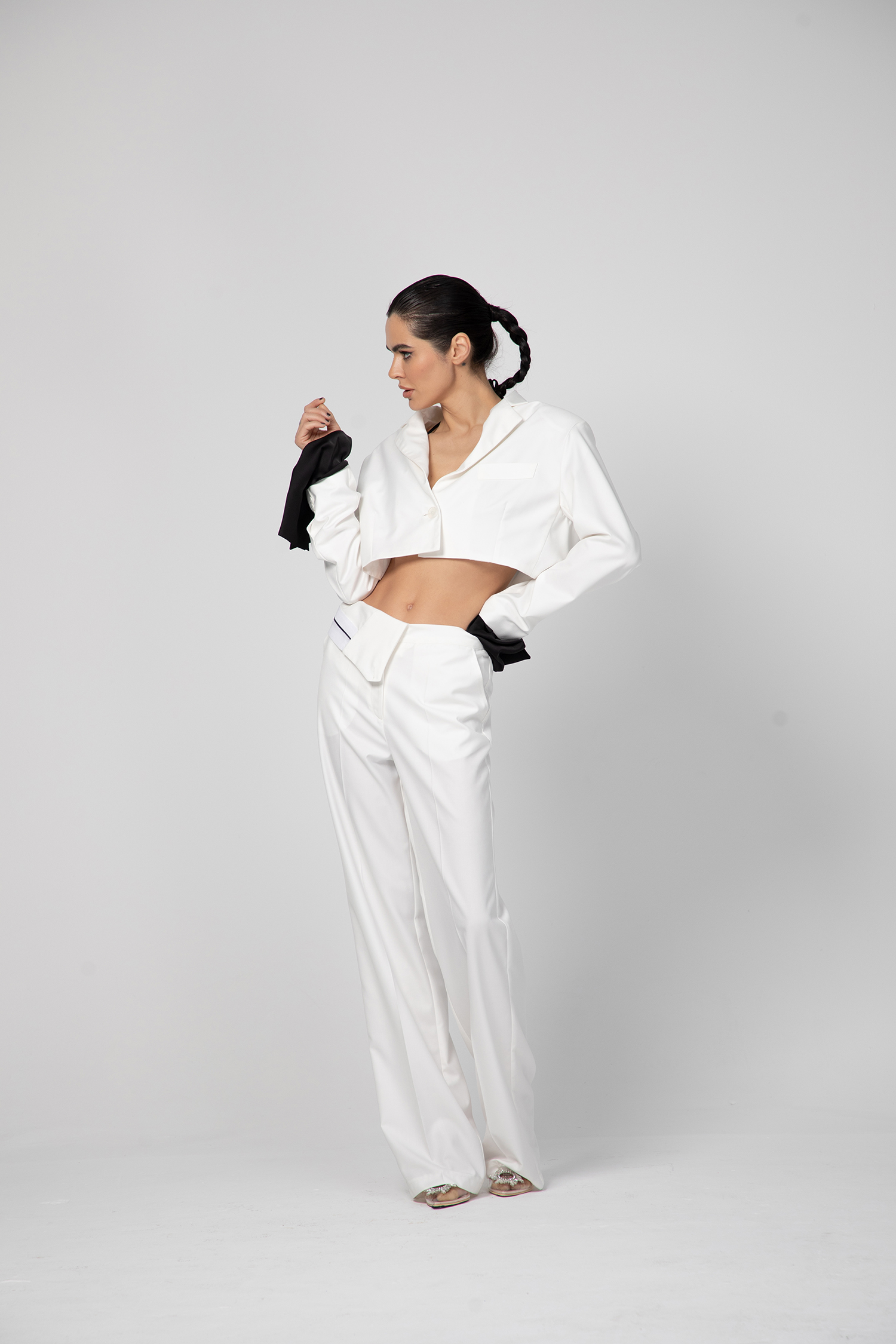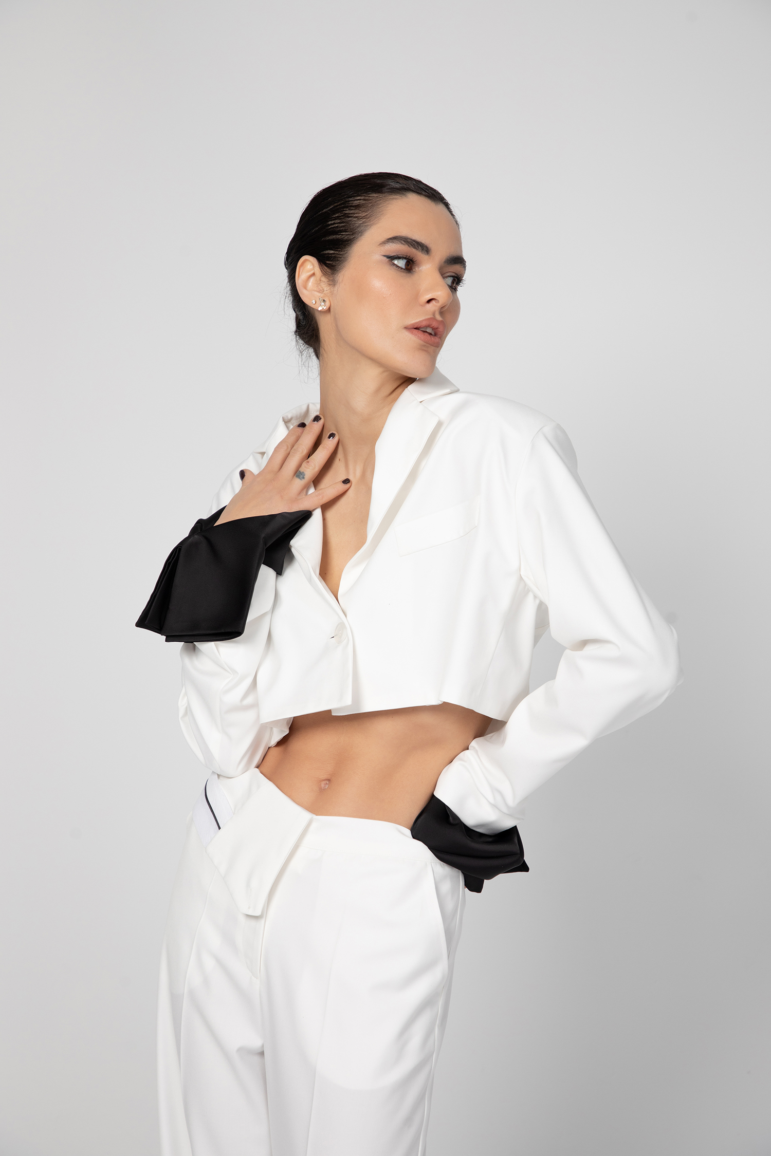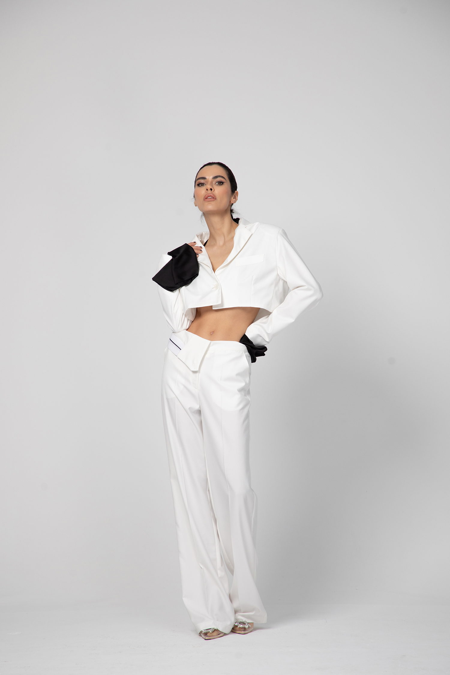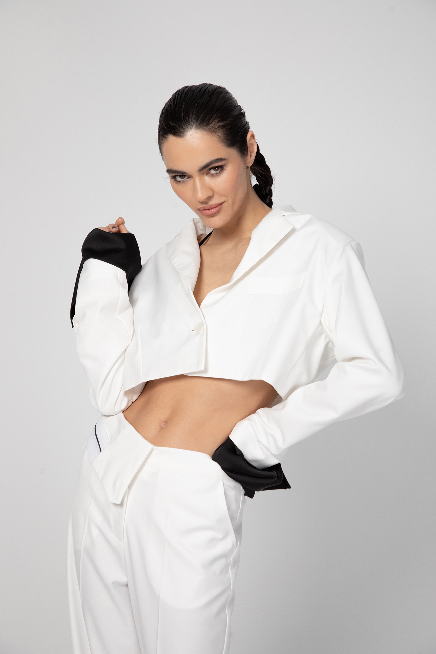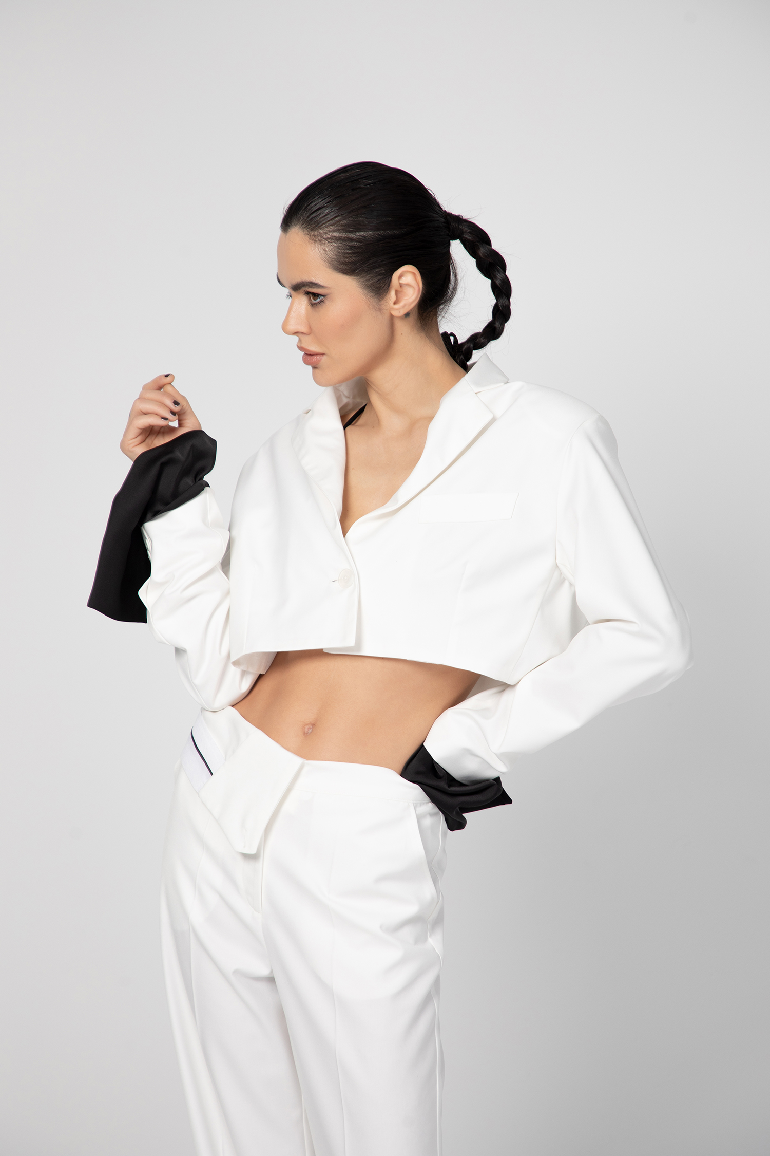 Екстравагантно дамско сако, изработено от памук в горната част и коприна с полиестер в долната. Асиметрично, късо отзад и силно разкроено отпред.