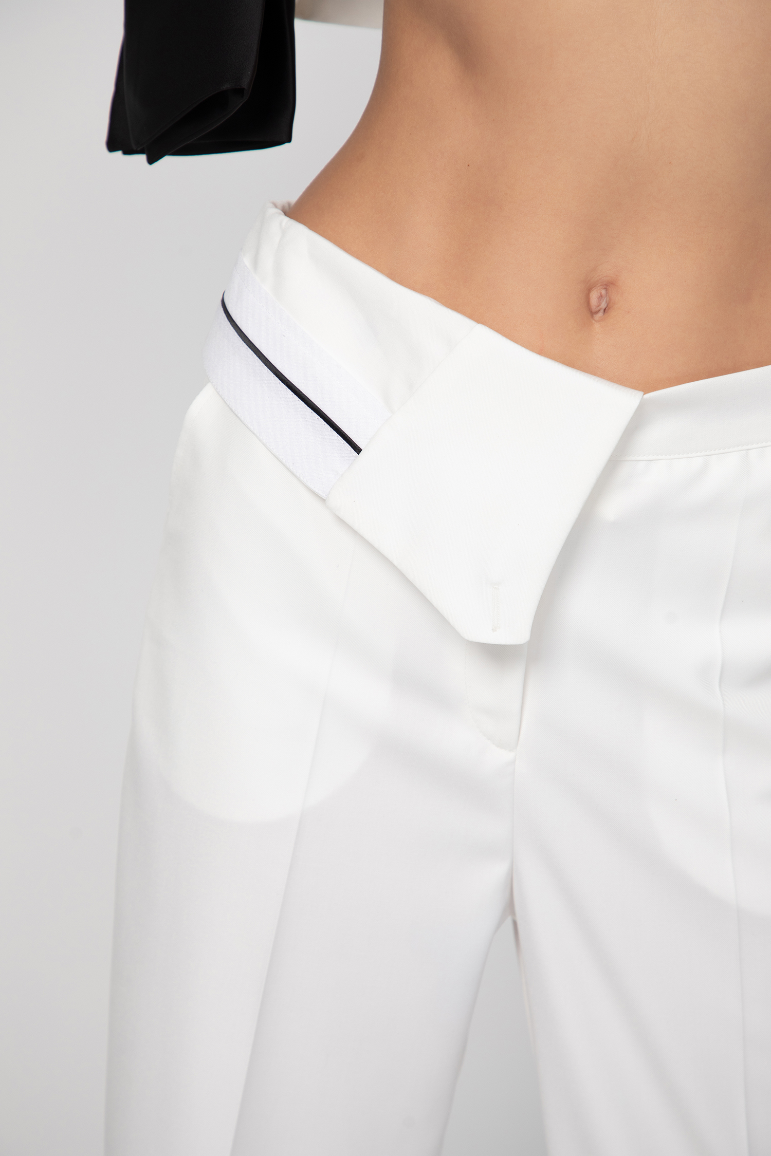 Горната част е изпълнена в дълбок черен цвят, с фина полупрозрачна текстура и геометричен мотив, който добавя лекота и стилна доза загадъчност. Долната част контрастира в светъл нюанс, също с деликатен геометричен десен, като удължената асиметрична линия създава издължен силует и визуален акцент.