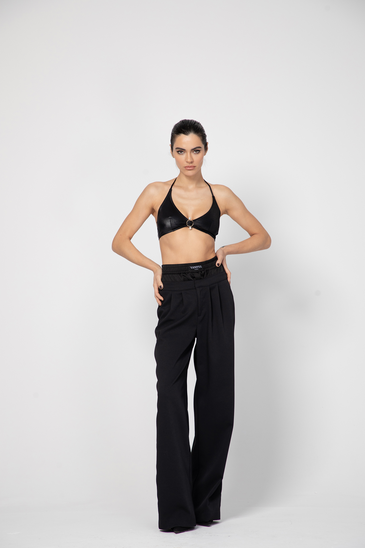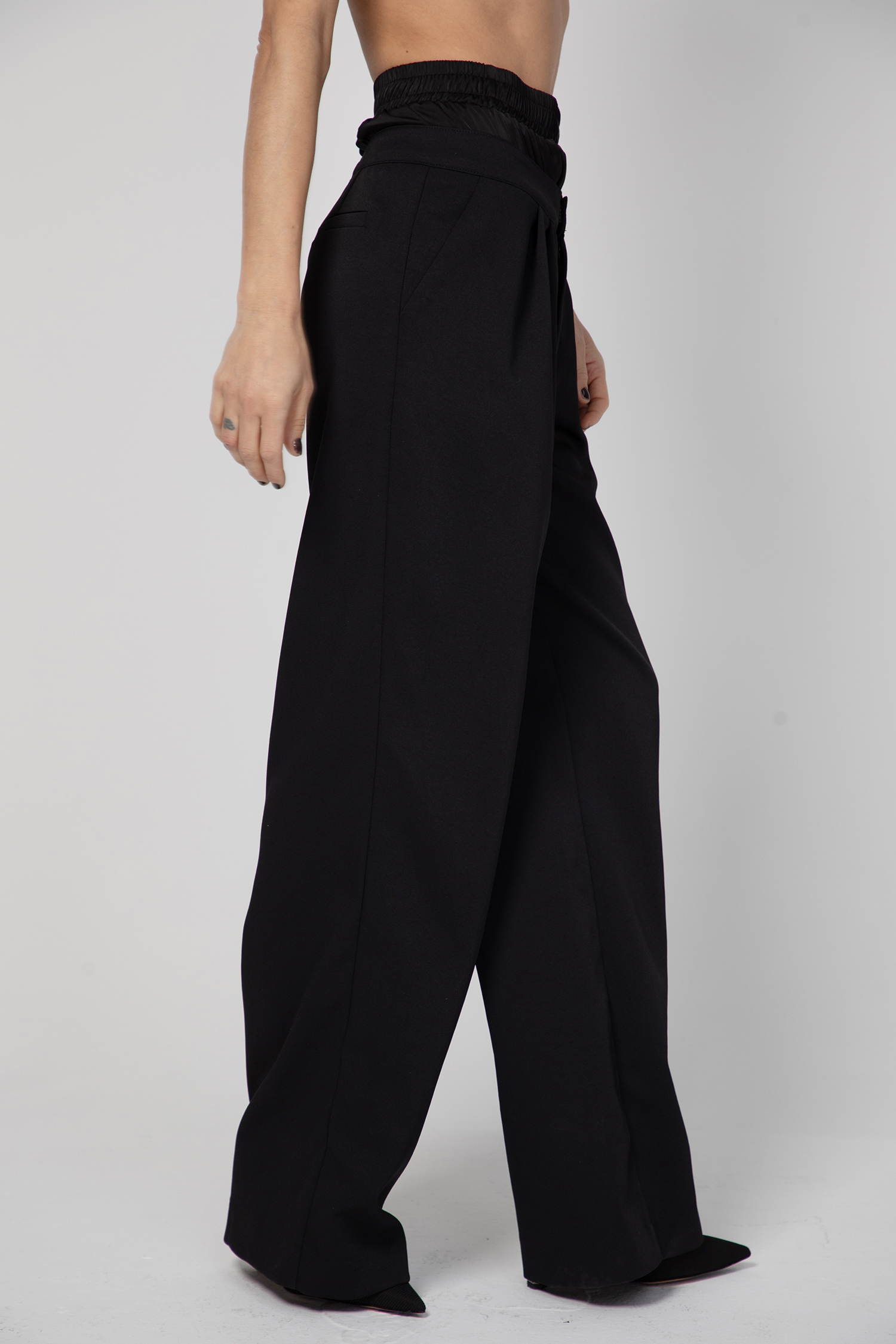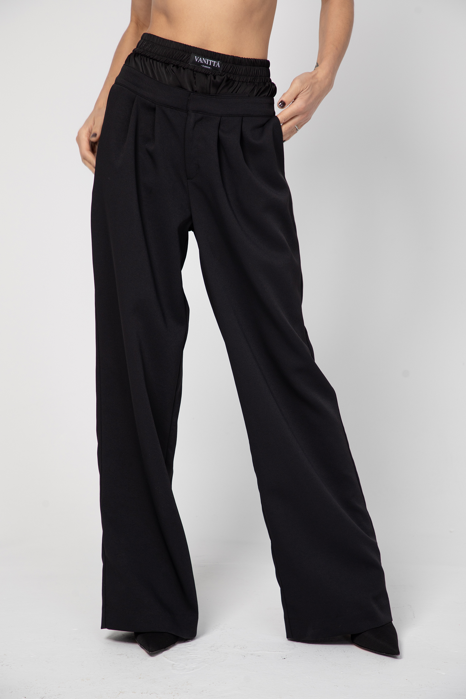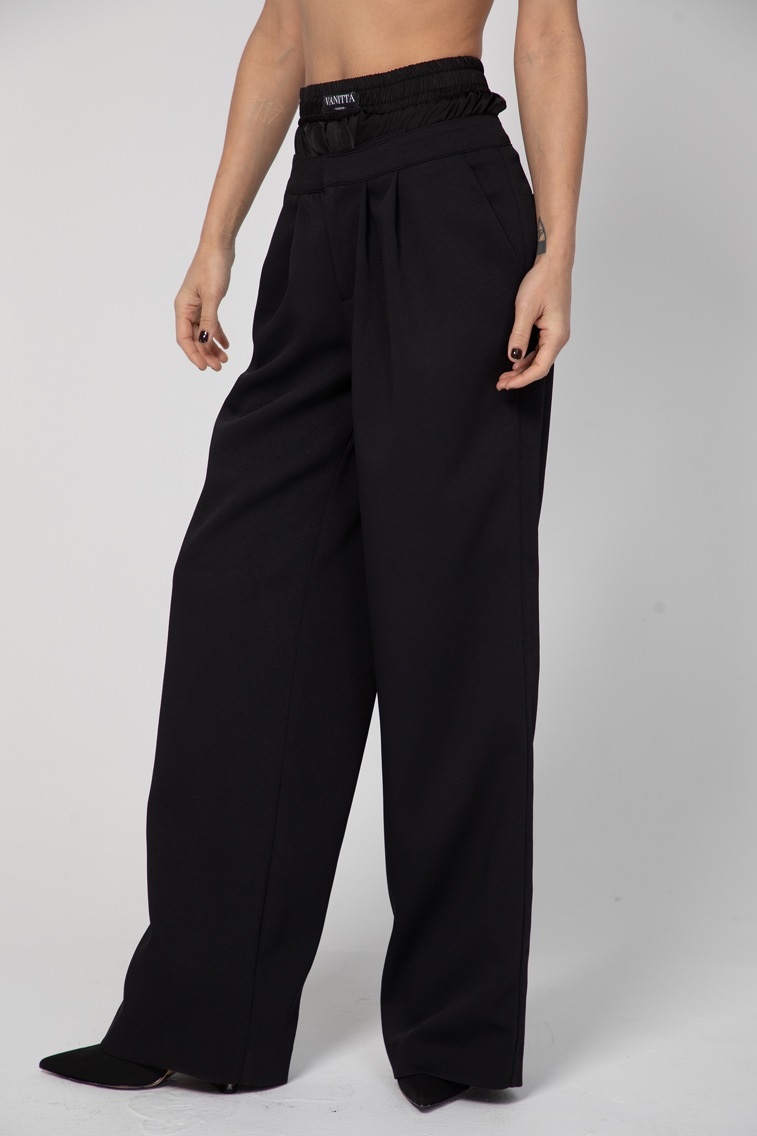 Дамски панталон с модерна и стилна визия, изработен от тежко падаща материя с чупки в предната част.