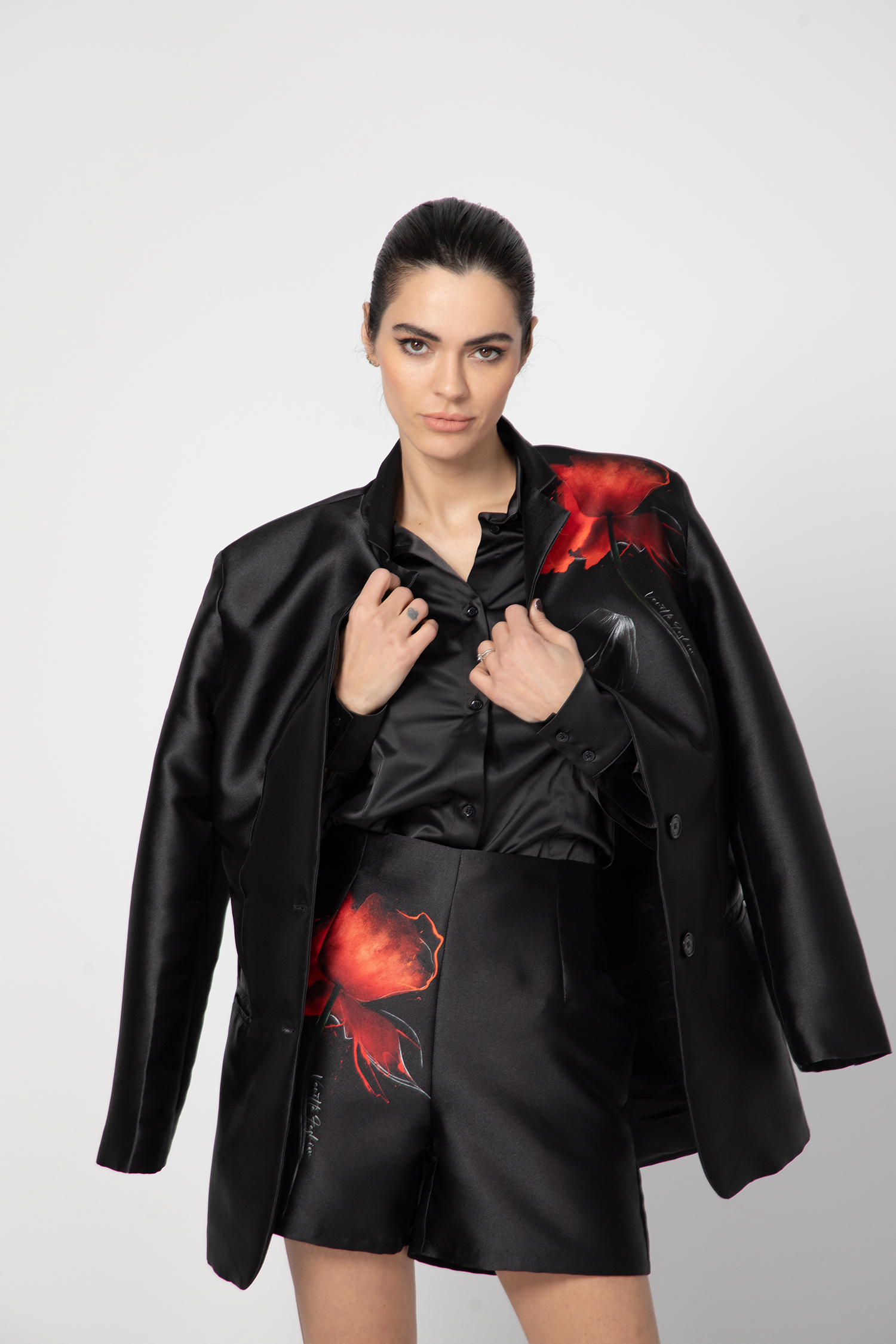 Ефирна риза от фина коприна с изчистен дизайн и нежно падащ преден панел. Моделът е с висока яка и свободен силует, който подчертава елегантността и лекотата на материята. Подходяща за стилни и модерни визии – от дневни до вечерни.