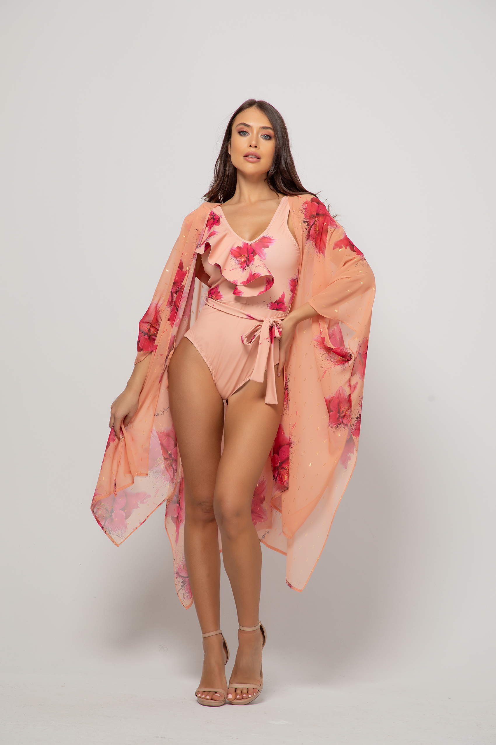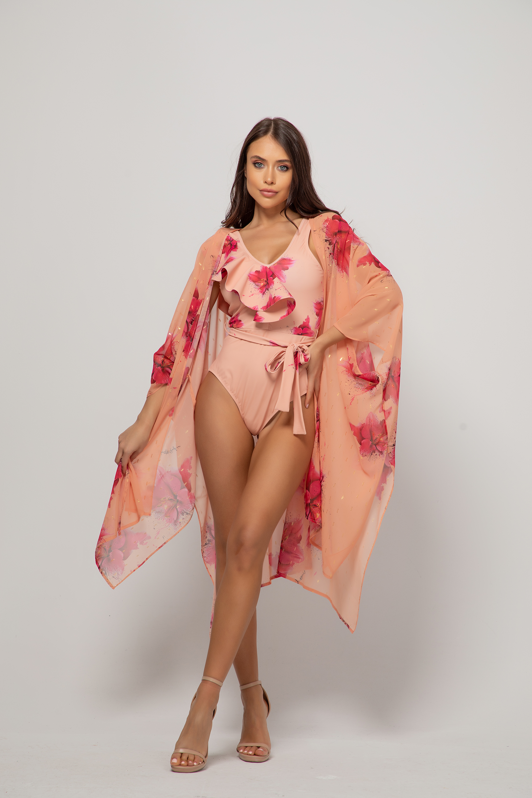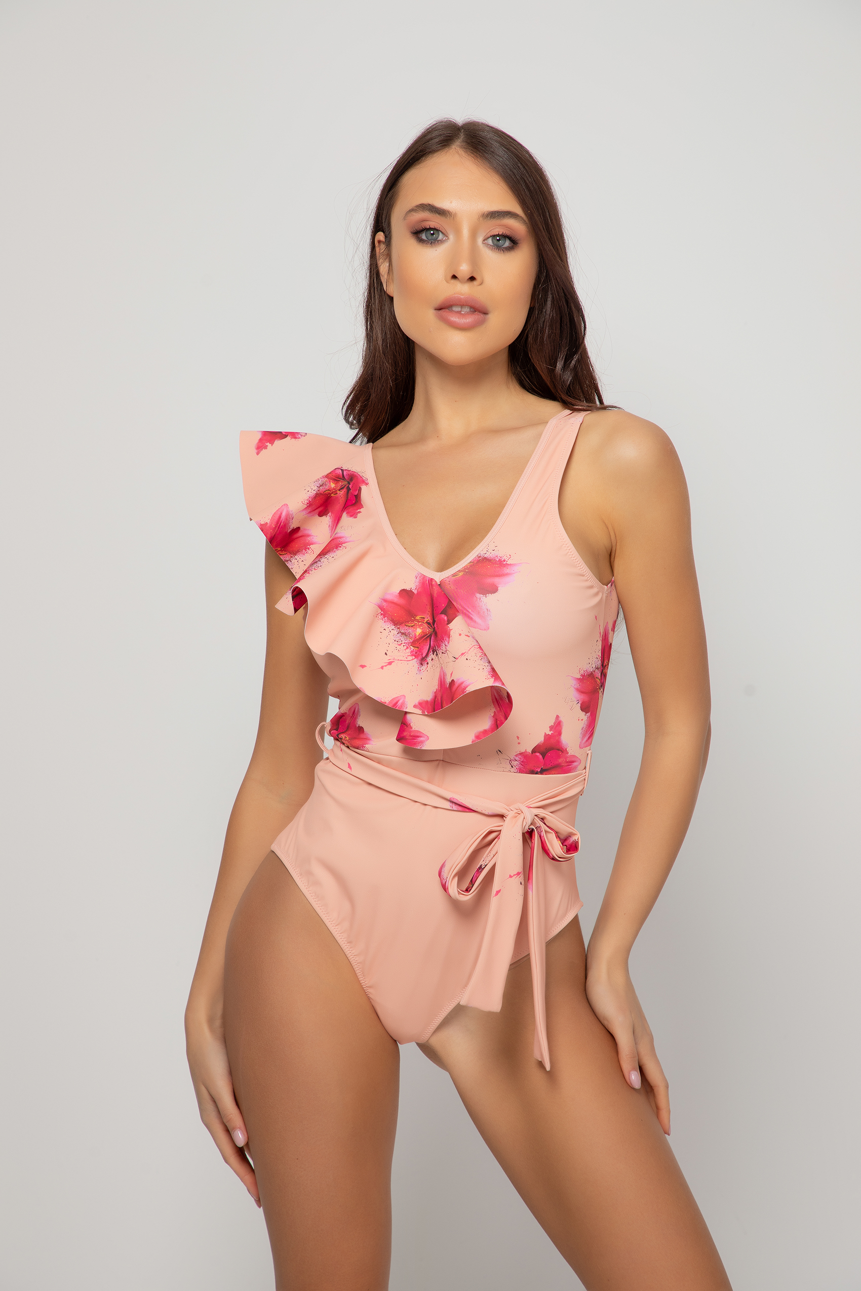 Моделът е с асиметрично воалено деколте и коланче. Женствен и колоритен бански.