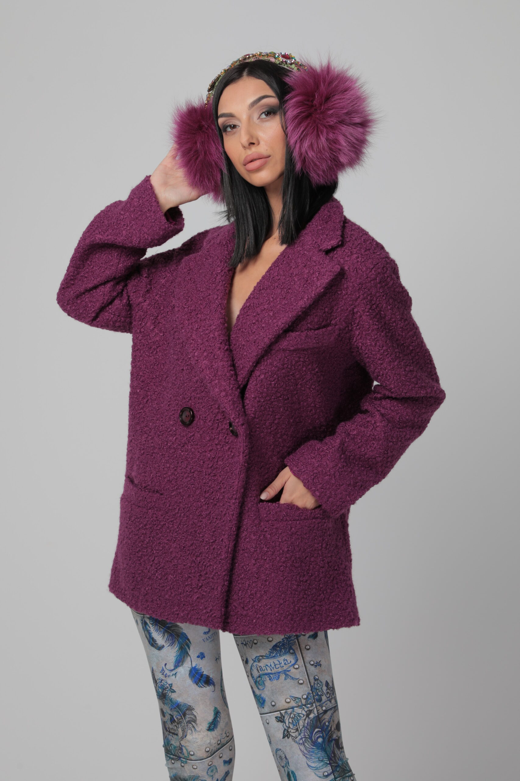 Късо дамско палто, изработено синтетичен /изкуствен астраган. Странично закопчаване и висока яка, подходящо за ежедневието.