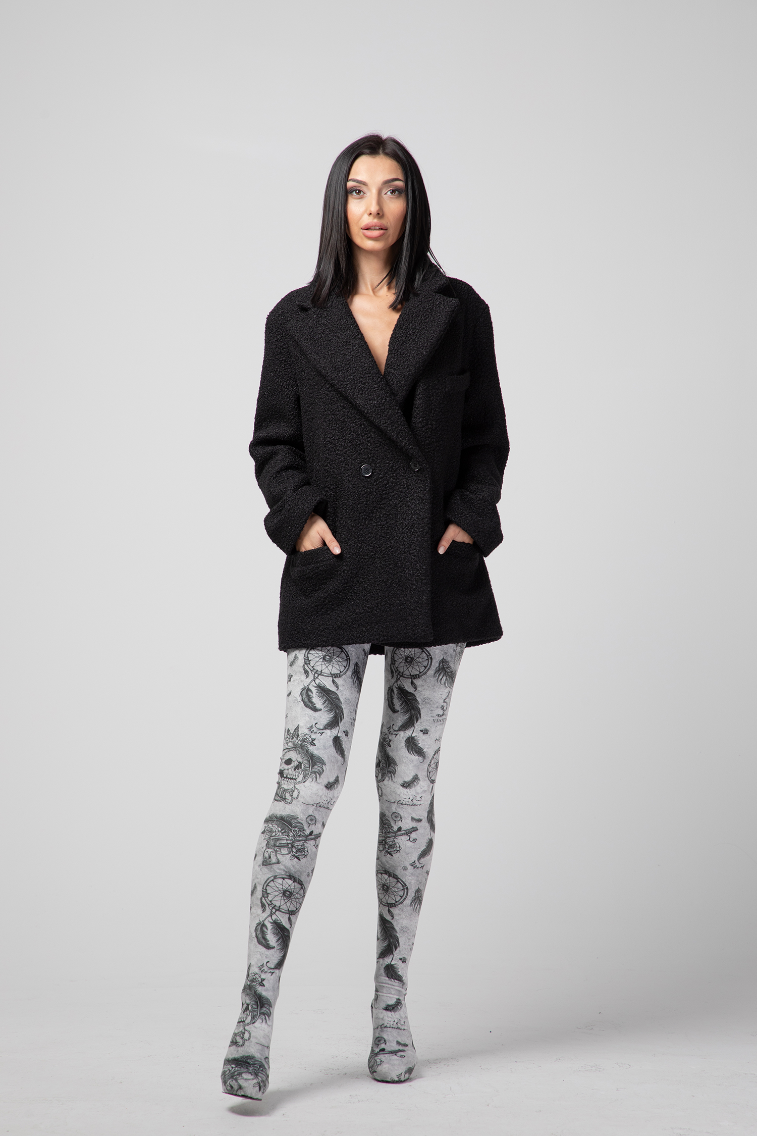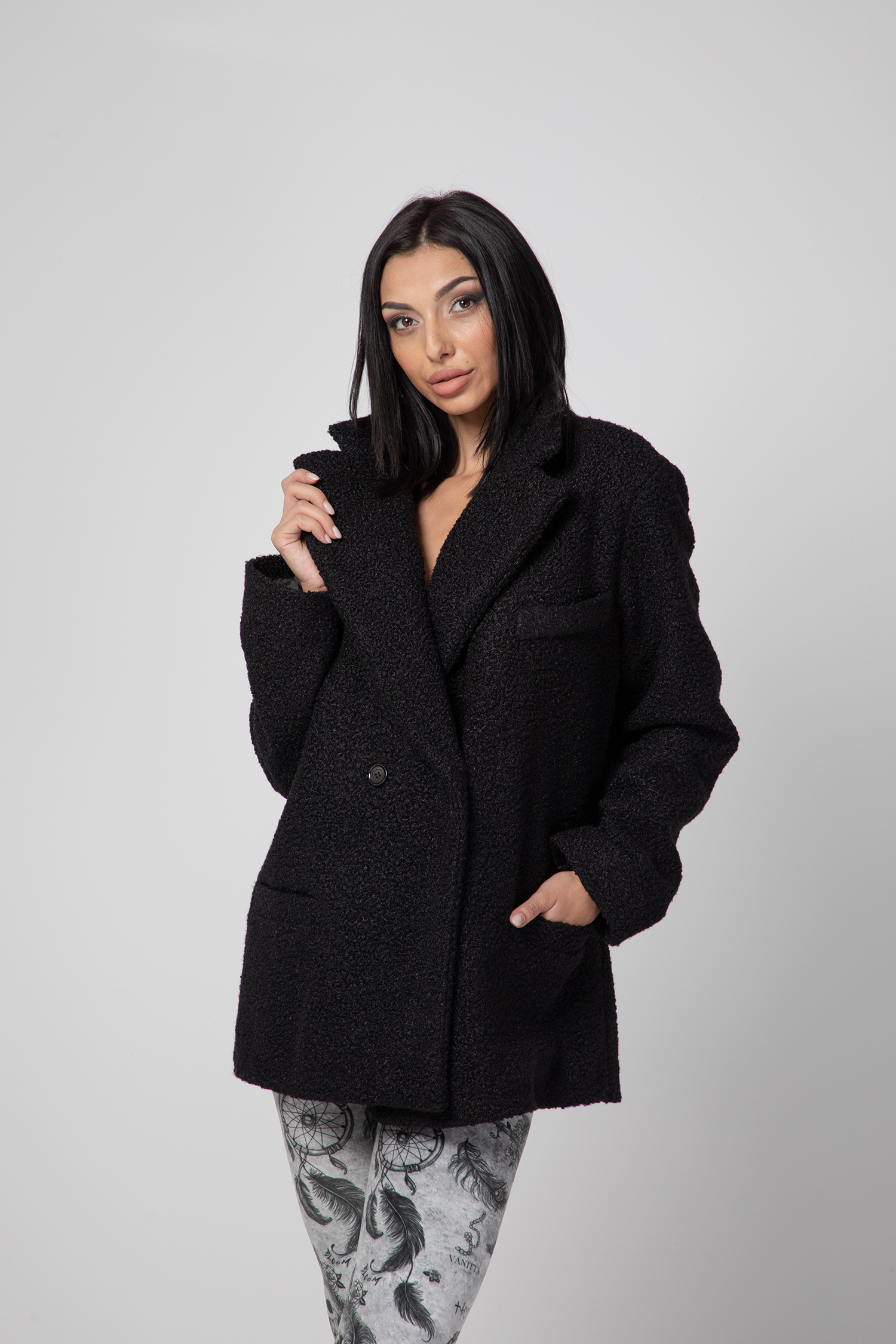 Стилно дамско палто, изработено от мека вълнена материя, с детайли от естествена кожа на ръкавите и гърба. С шал яка и предно закопчаване с тик-так копчета.