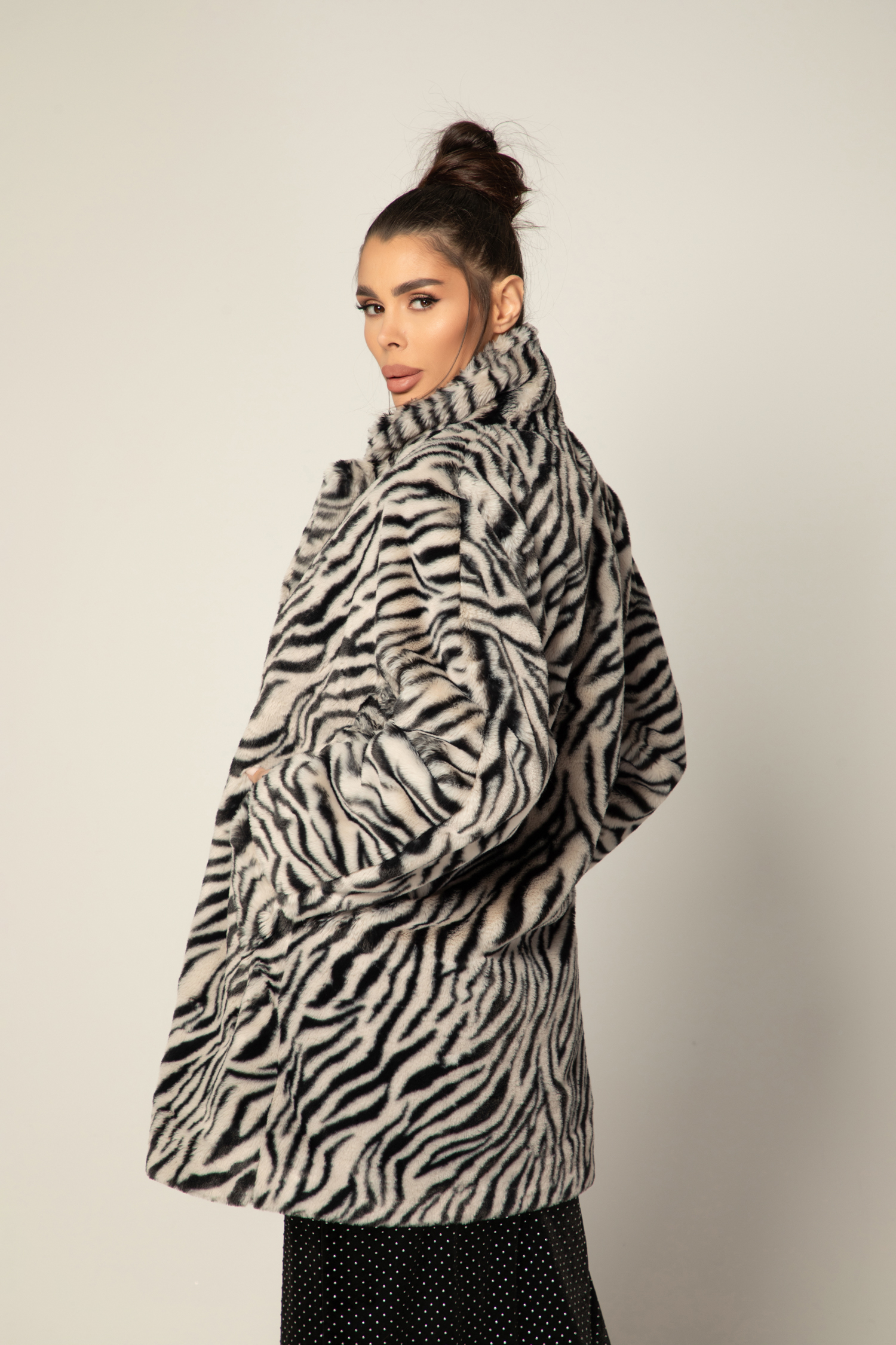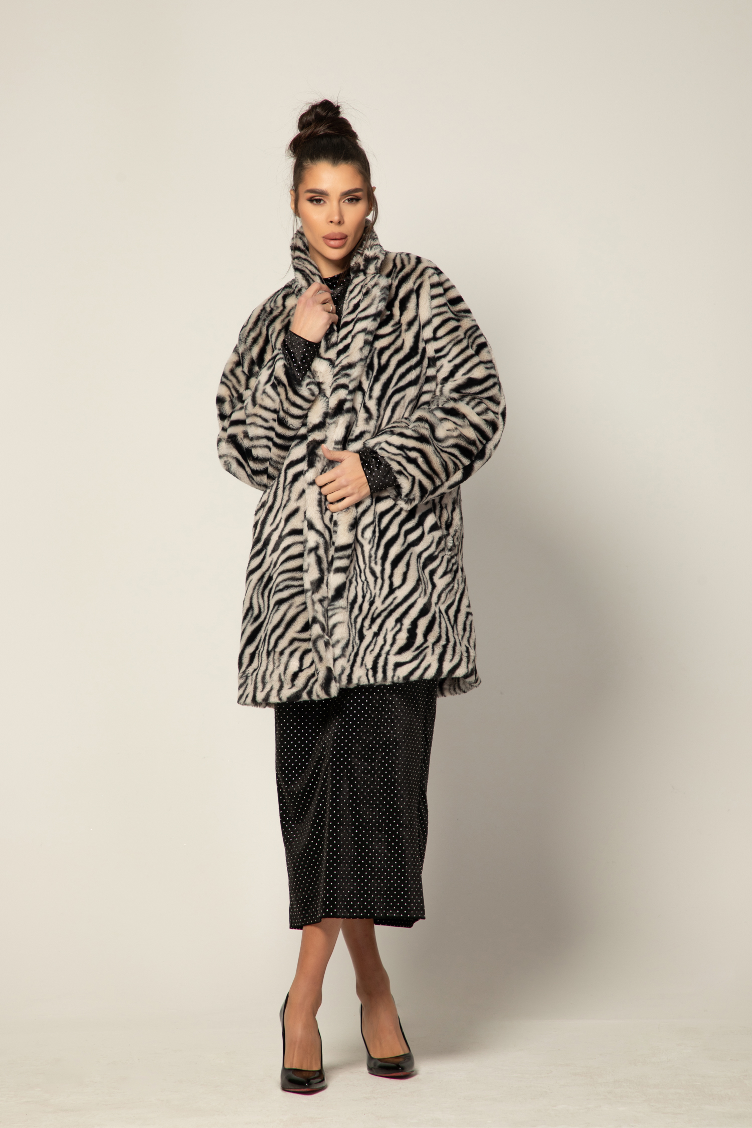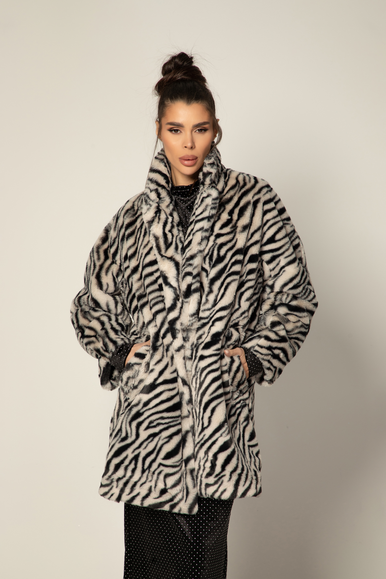 Невероятно палто от синтетичен астраган и гарнитура на ревера от плътна еко кожа.