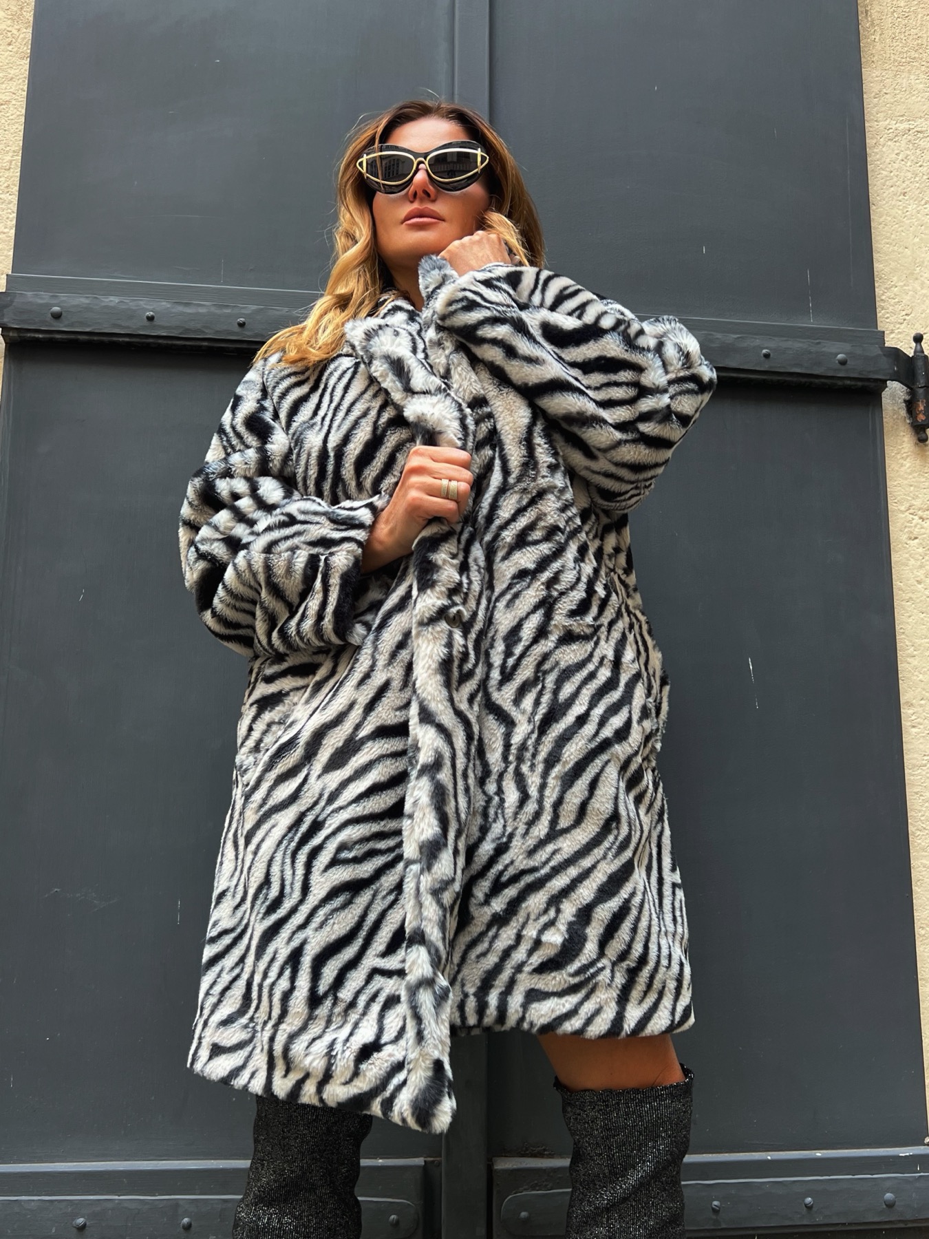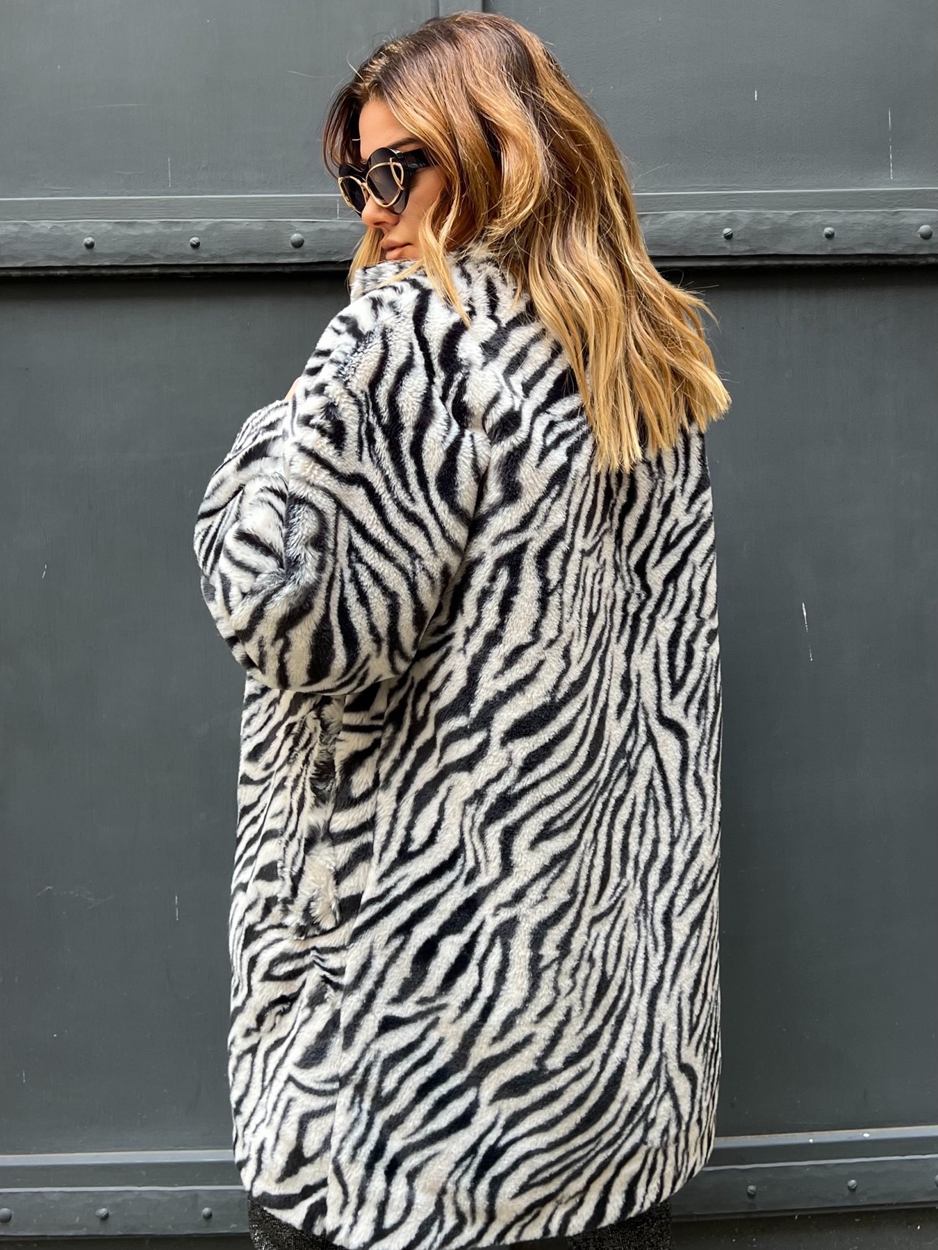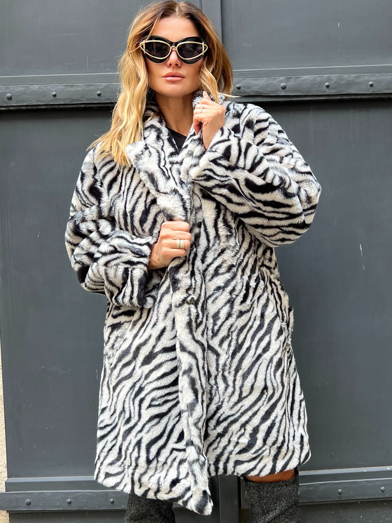 Невероятно палто от синтетичен астраган и гарнитура на ревера от плътна еко кожа.