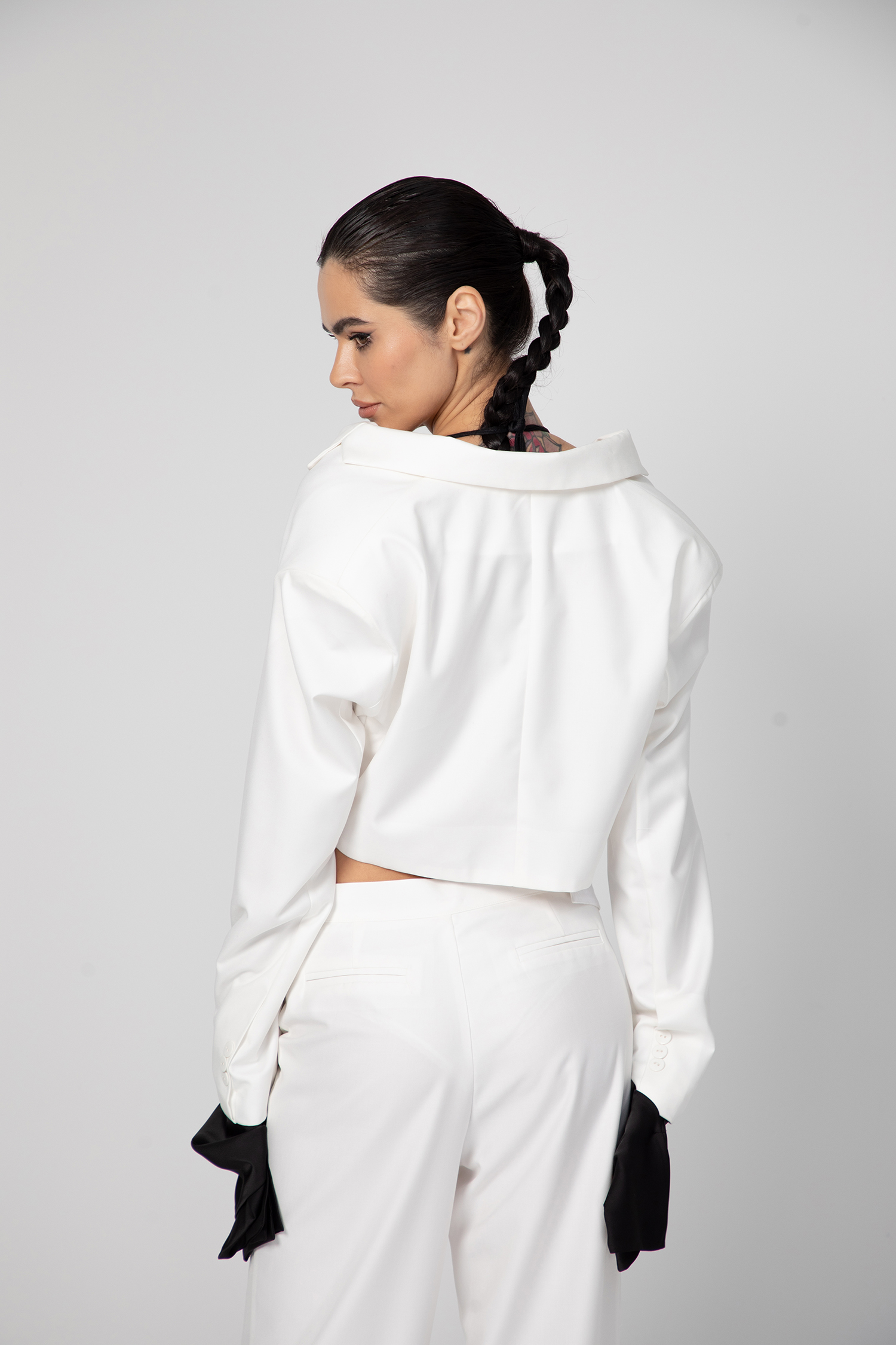 Ефектни контрастни маншети с възможност за демонтиране, прикачени са с допълнителни копчета.