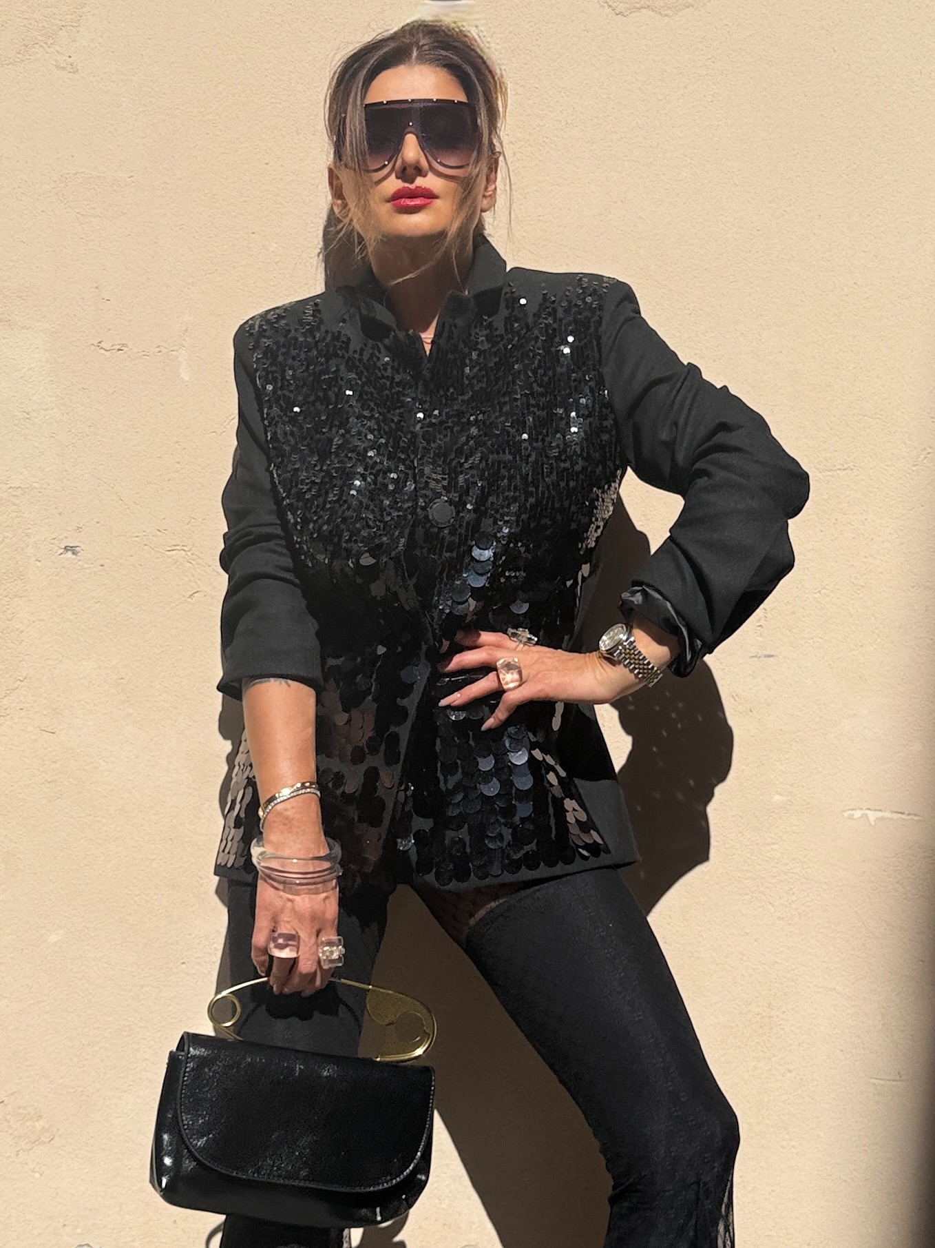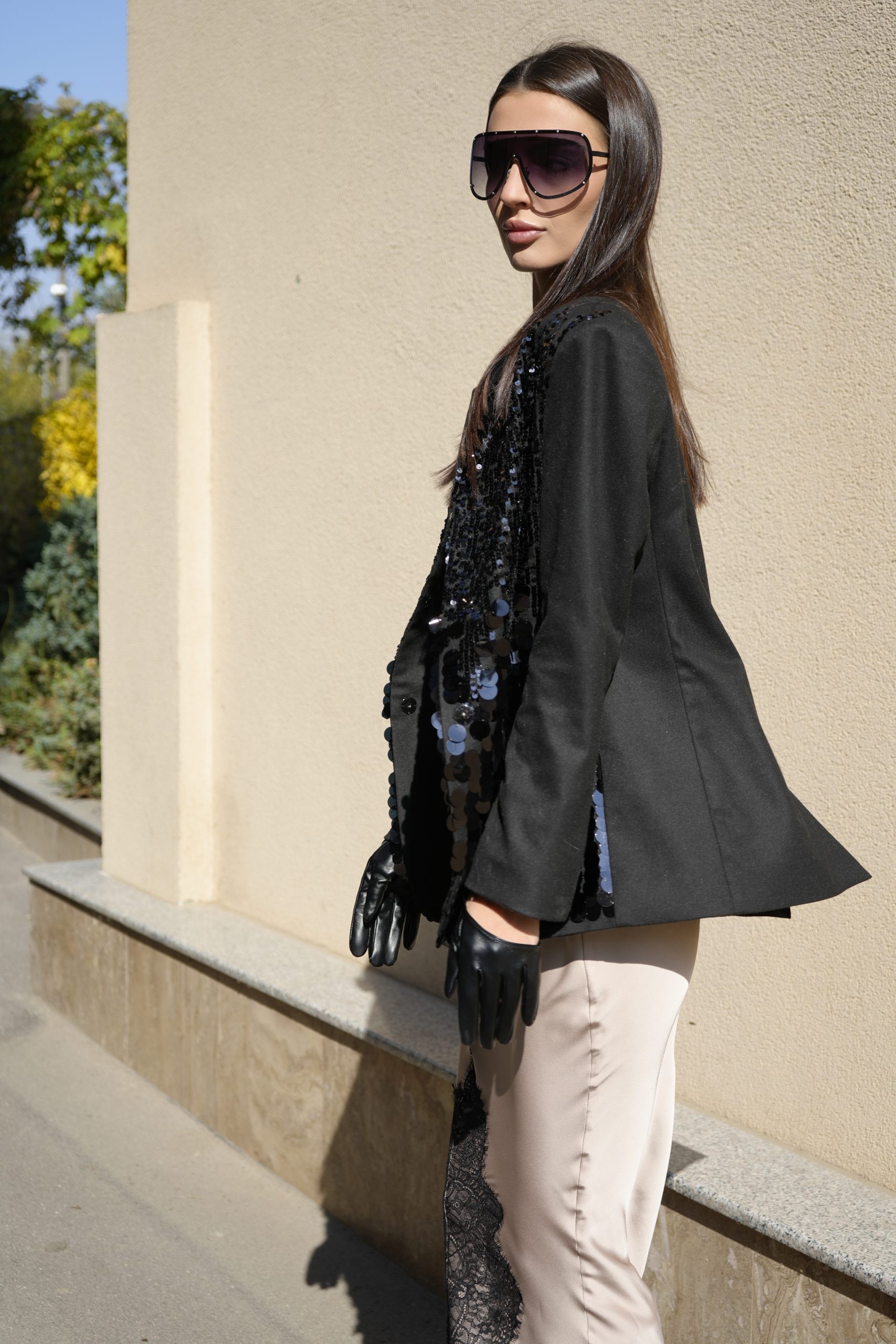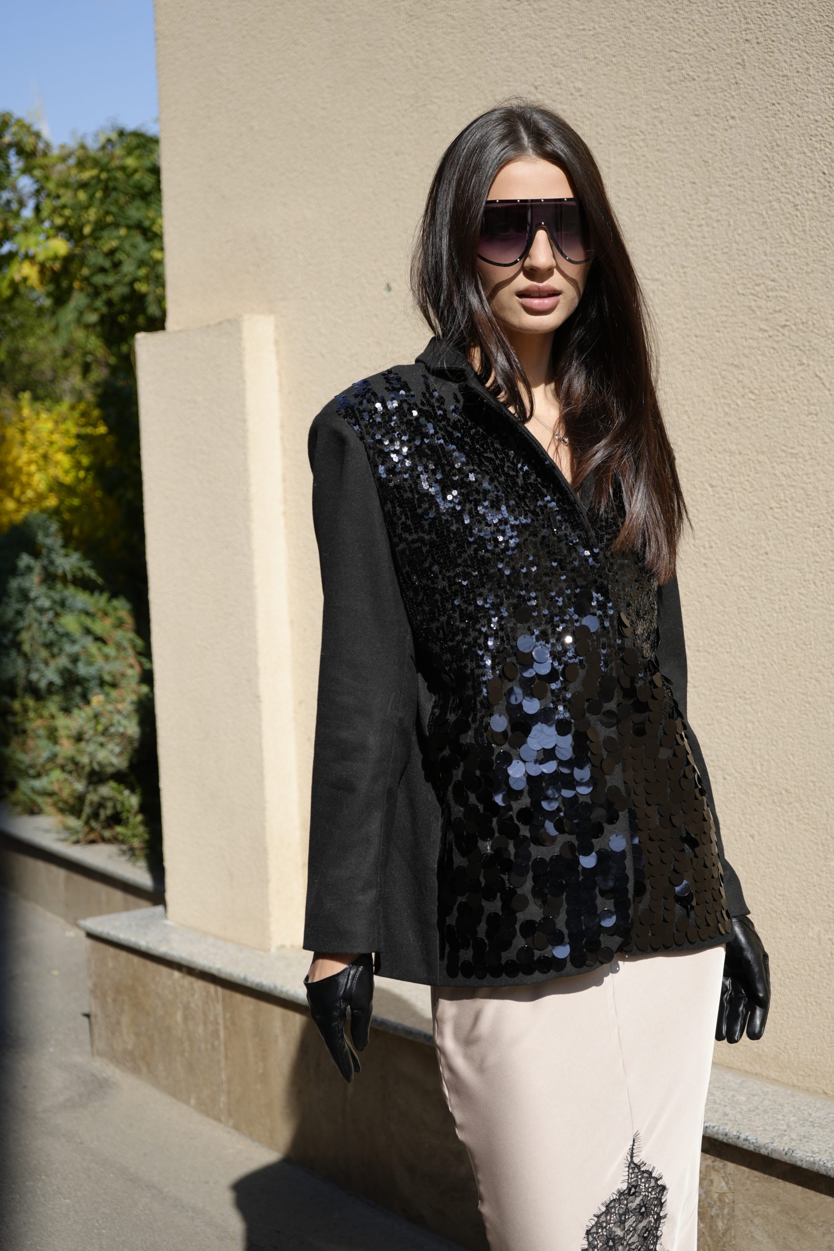 Впечатляващо сако, съчетаващо класическа линия с модерна визия. Изработено от плътна материя с изчистен гръб и предна част, покрита с пайети, които преливат – по-едри в долната част и постепенно по-фини нагоре, за изискан и балансиран ефект.
