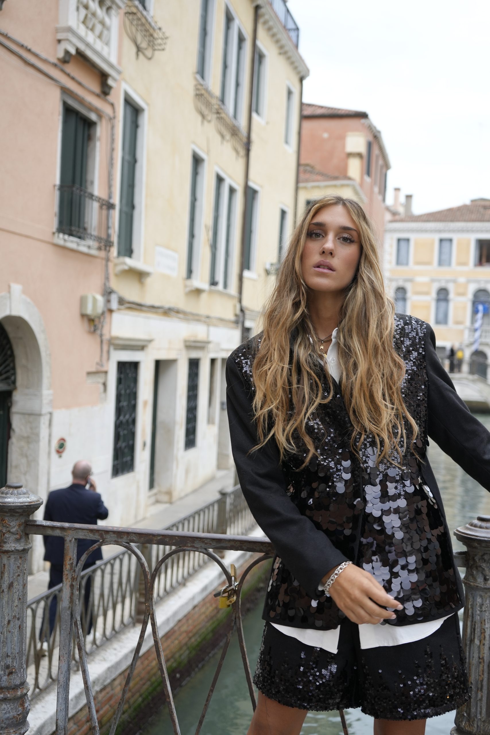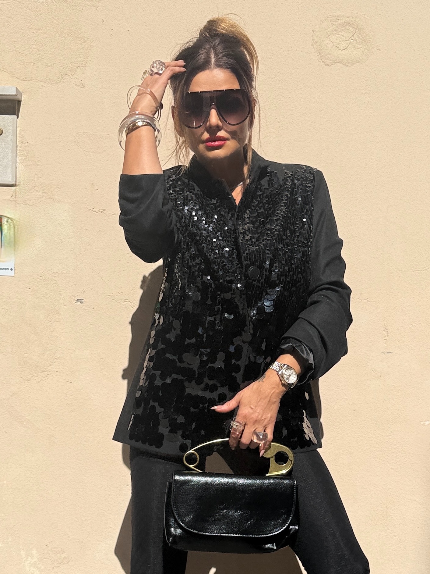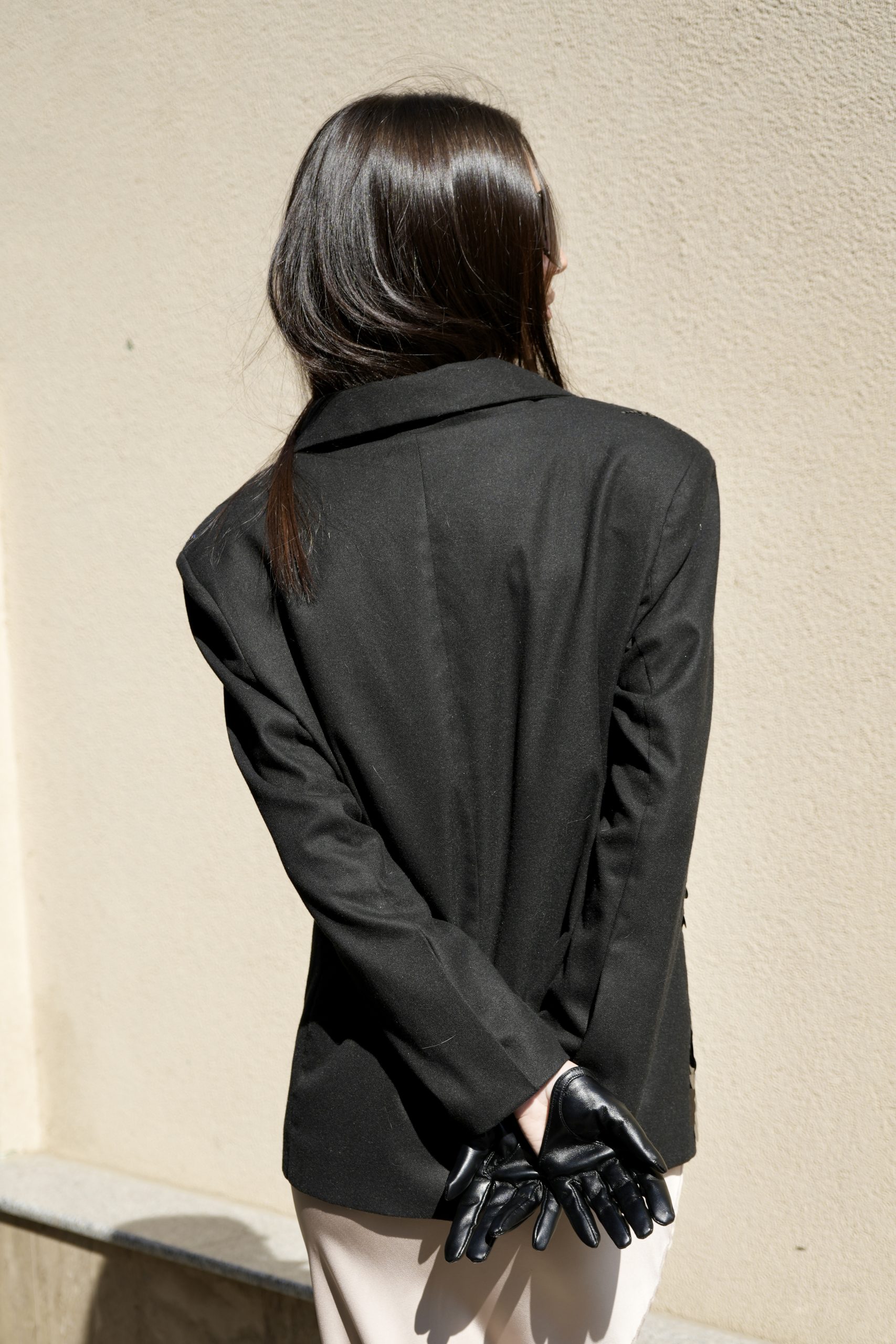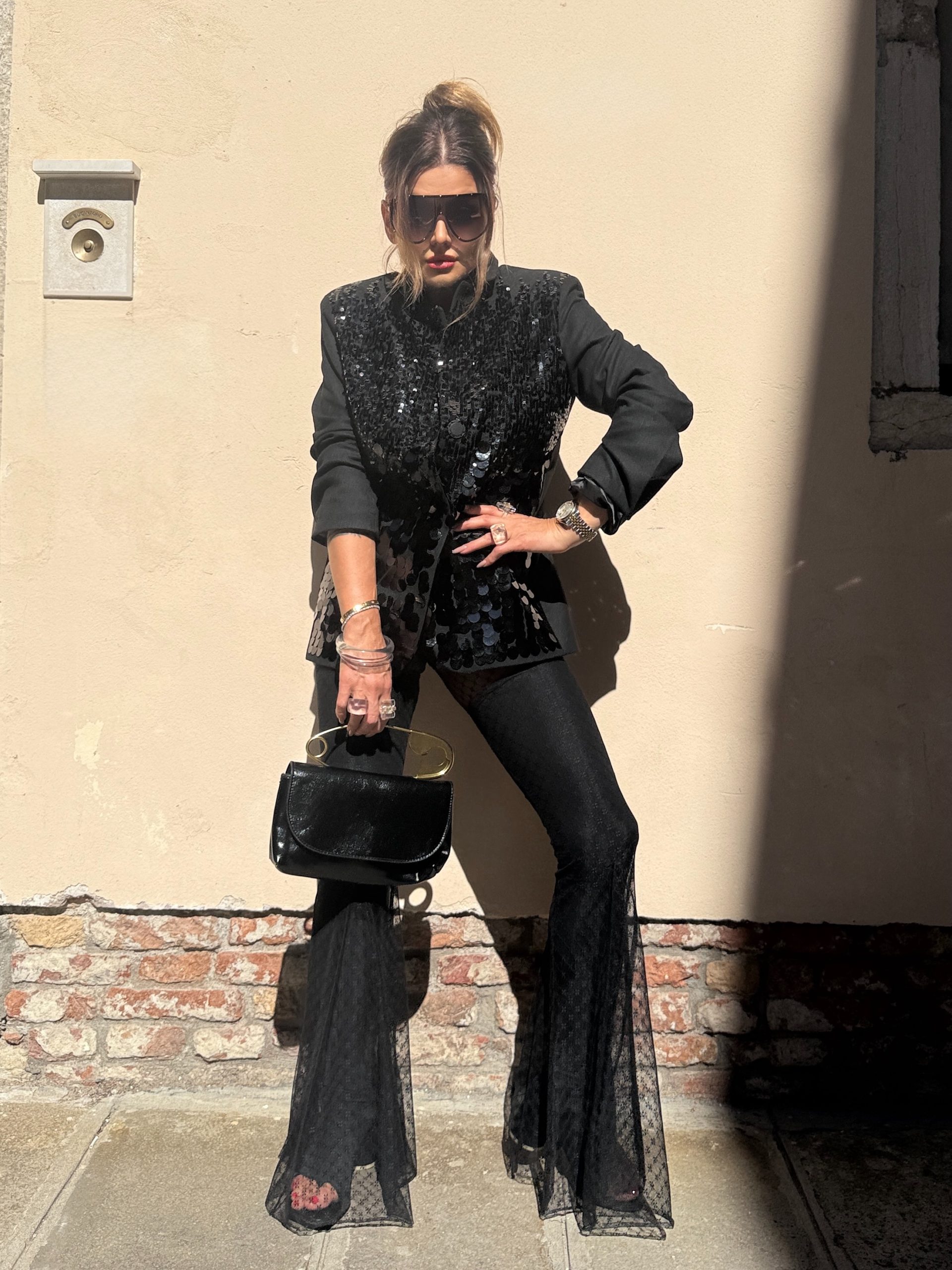Впечатляващо сако, съчетаващо класическа линия с модерна визия. Изработено от плътна материя с изчистен гръб и предна част, покрита с пайети, които преливат – по-едри в долната част и постепенно по-фини нагоре, за изискан и балансиран ефект.