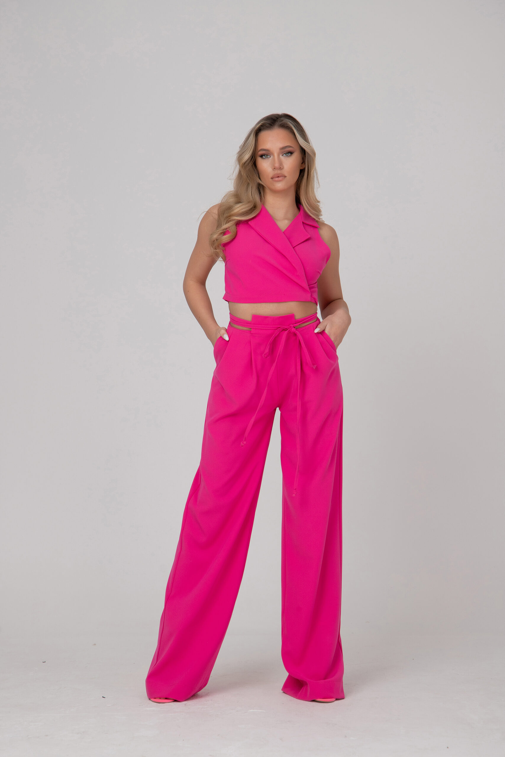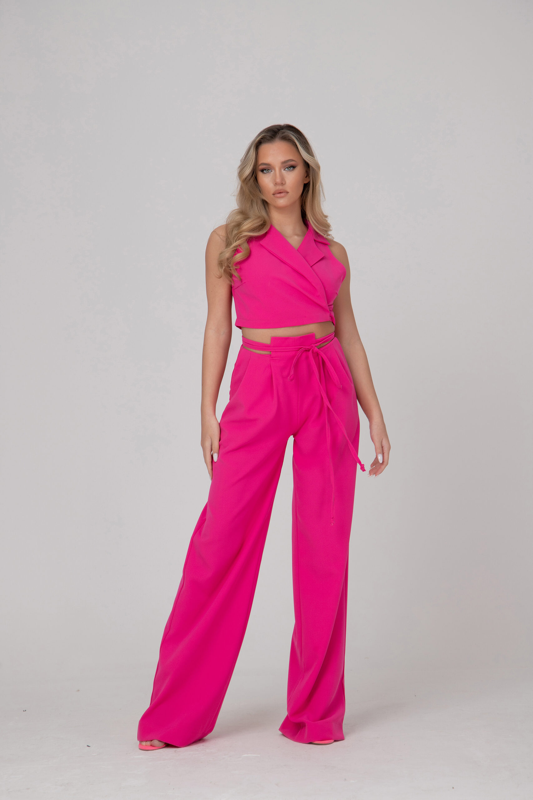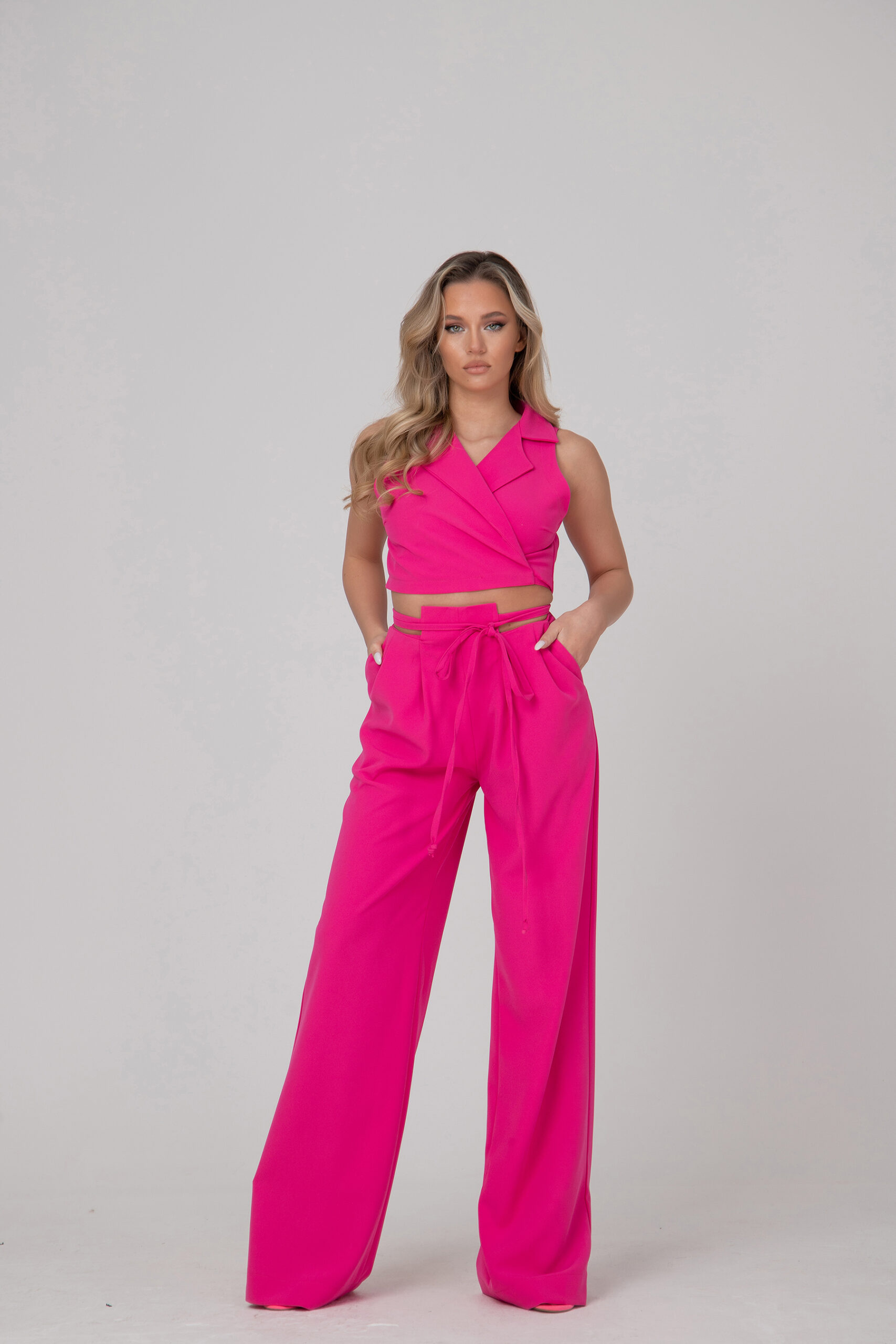 Стилен дамски комплект от две части- широк свободен панталон и горна част- тип прегърни ме, ревер и връзки около талията.