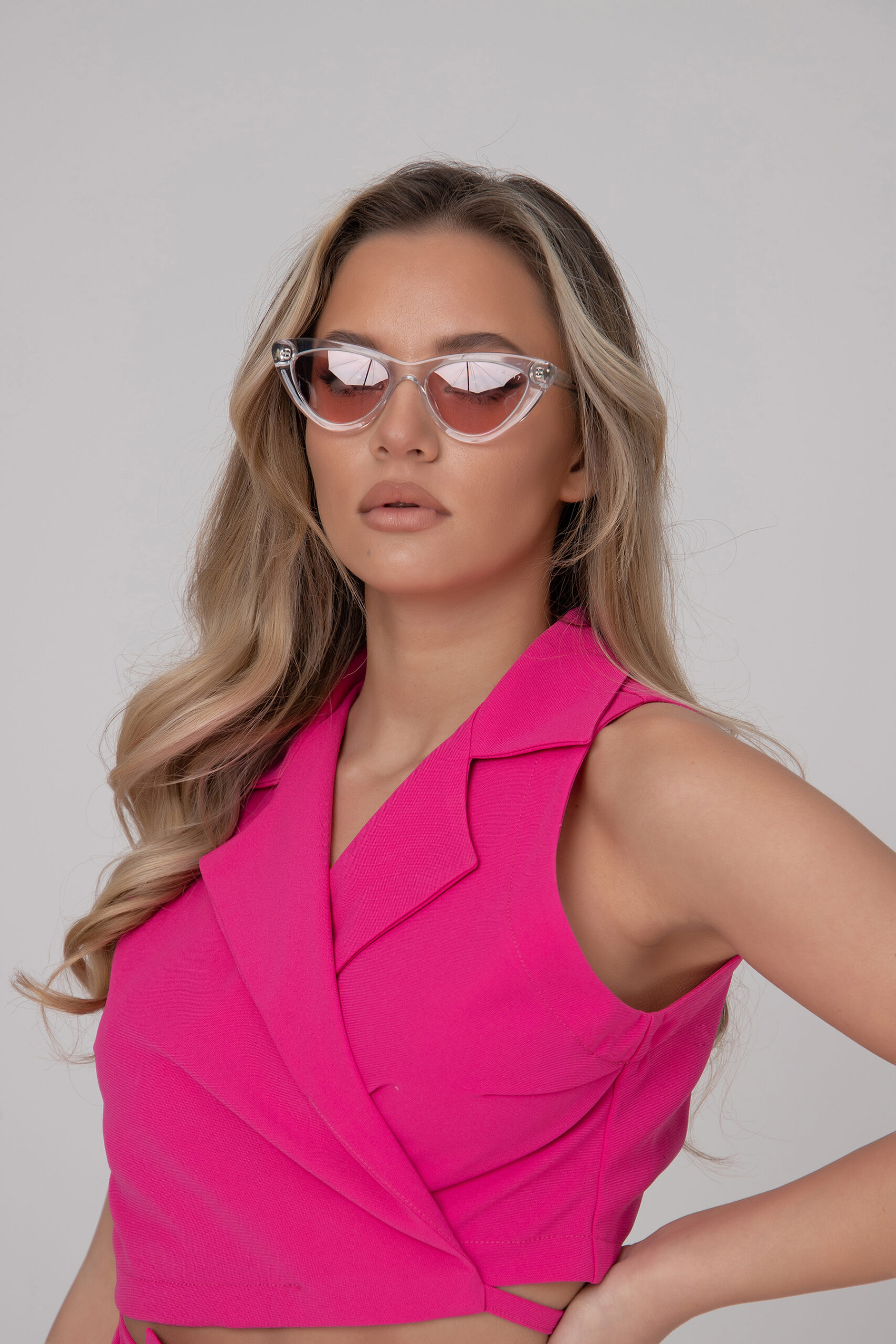 Екстравагантно дамско сако, изработено от памук в горната част и коприна с полиестер в долната. Асиметрично, късо отзад и силно разкроено отпред.
