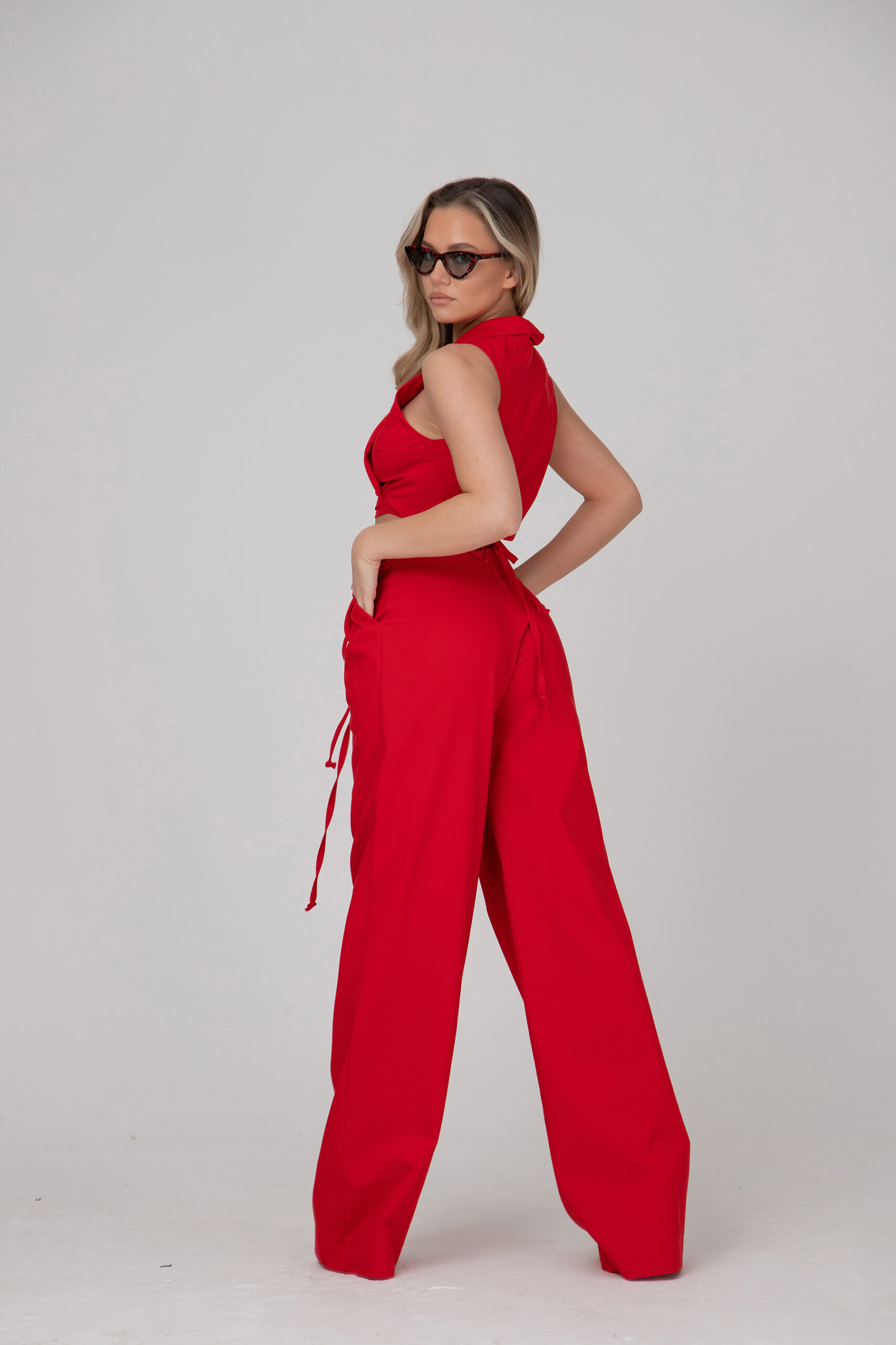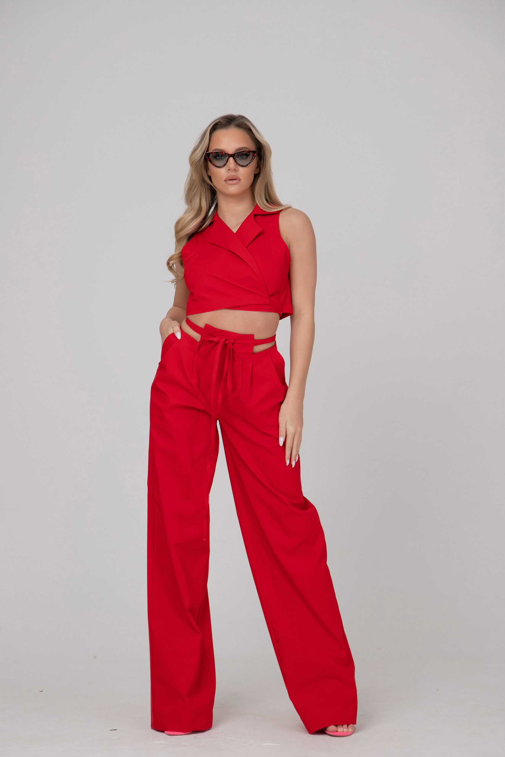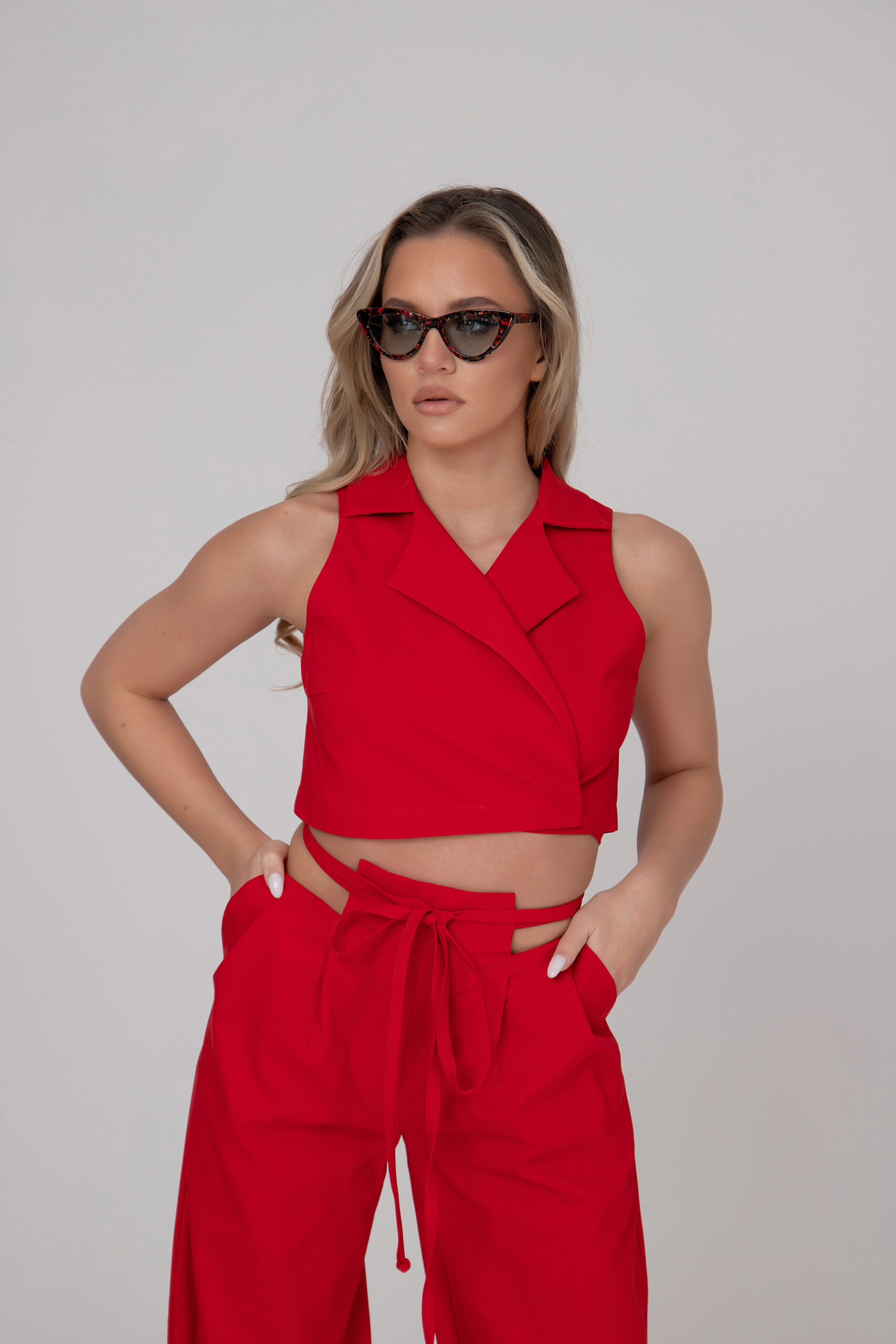 Екстравагантна дамска риза, изработена от фин памук в червено. Модела може да се преобразува в различни варианти, посредством множеството копчета разположени в четирите долни части на ризата.