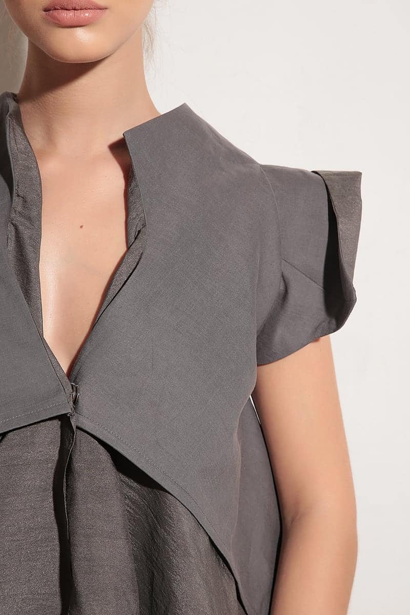 Елегантна широка туника с висока яка, изработена от тежко падаща материя, с асиметрично закопчаване в горната част.