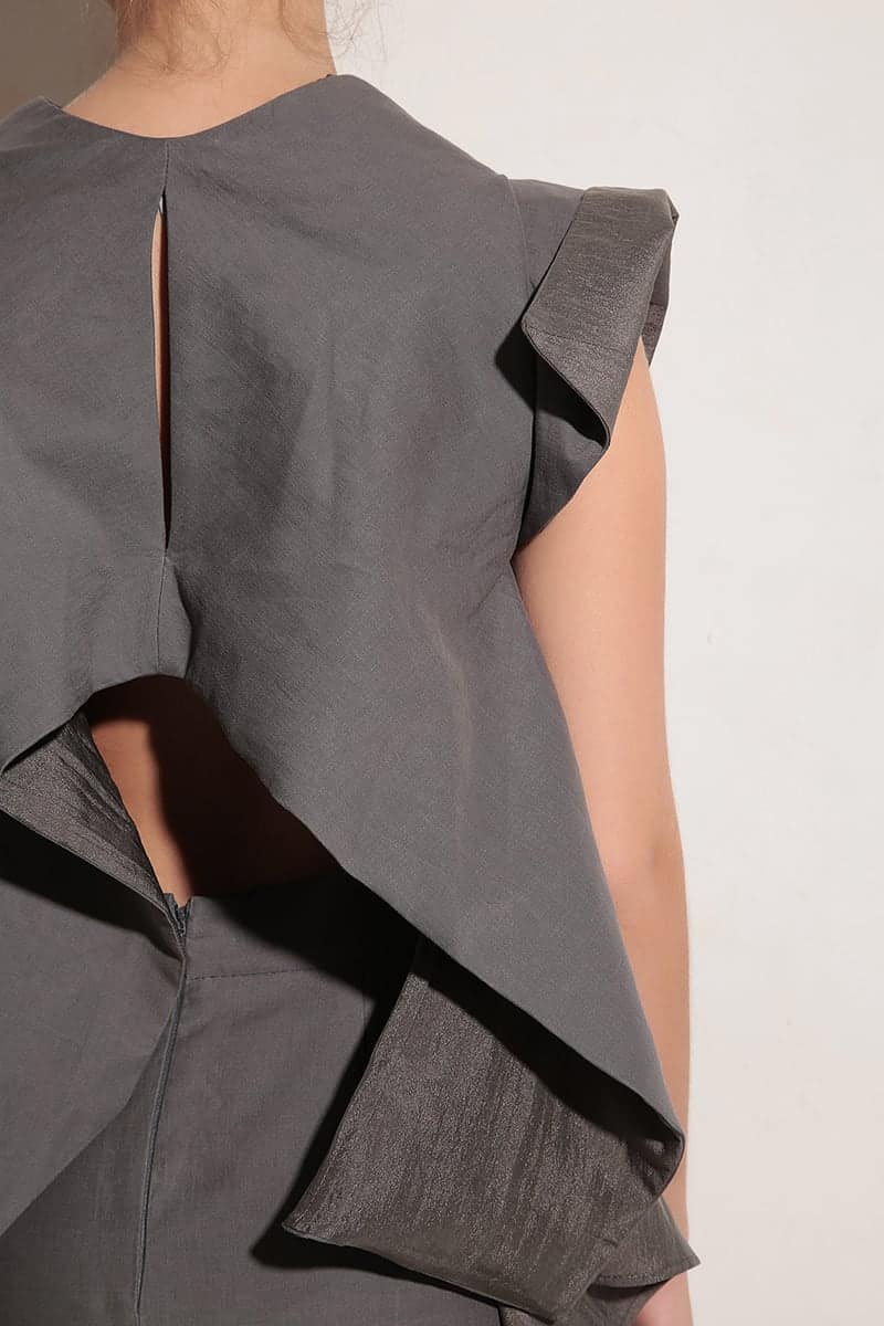 Тази впечатляваща пола е изработена от красива, плътна материя с фин блясък, която създава богат обем и изразително движение. Кройката е нестандартна и архитектурна, с меки конструкции и плавни линии, които оформят силуета по модерен и артистичен начин. Обемът е балансиран и придава драматичност, без да утежнява визията, превръщайки полата в силен акцент за стилни и концептуални комбинации.
